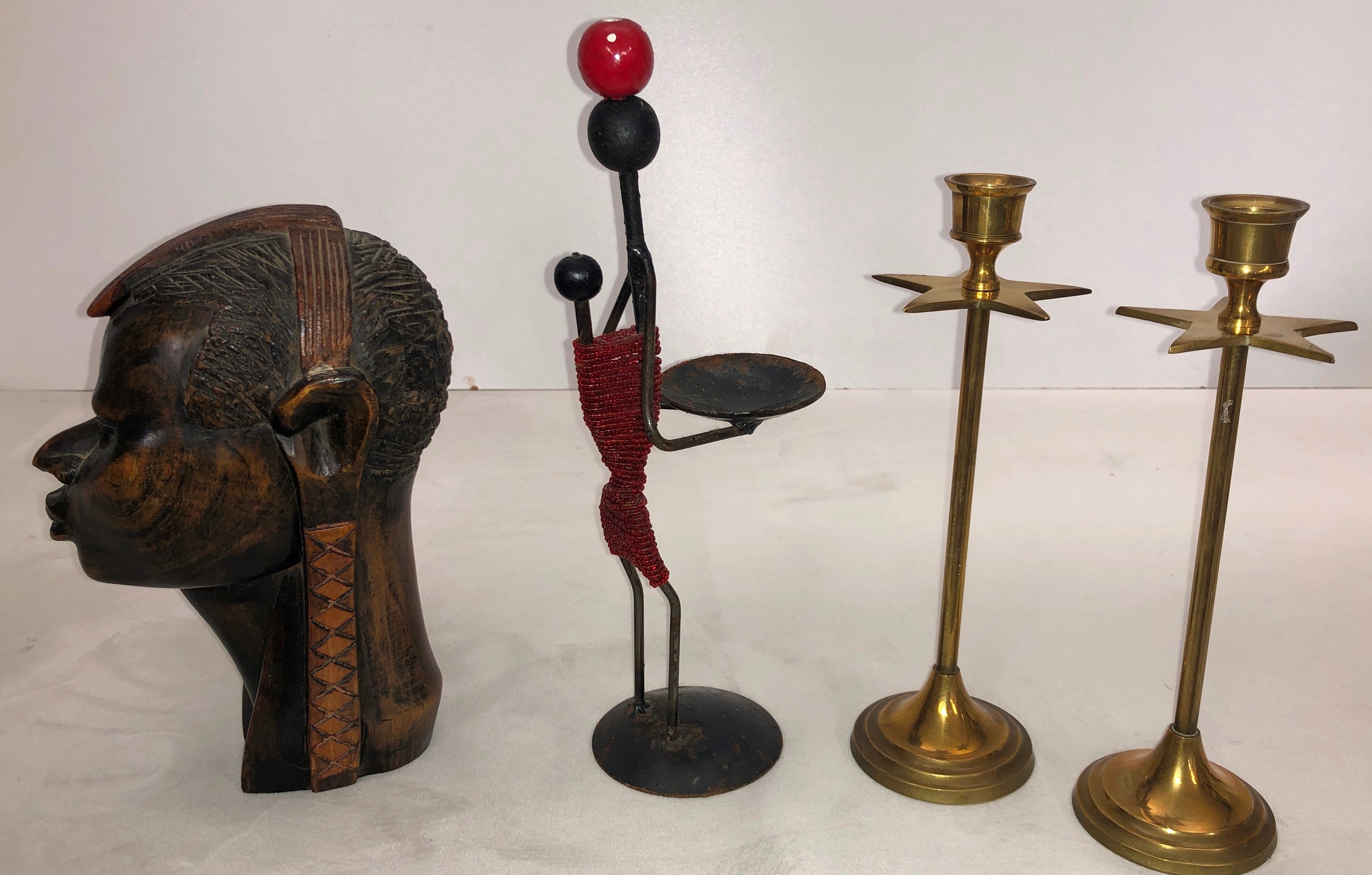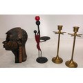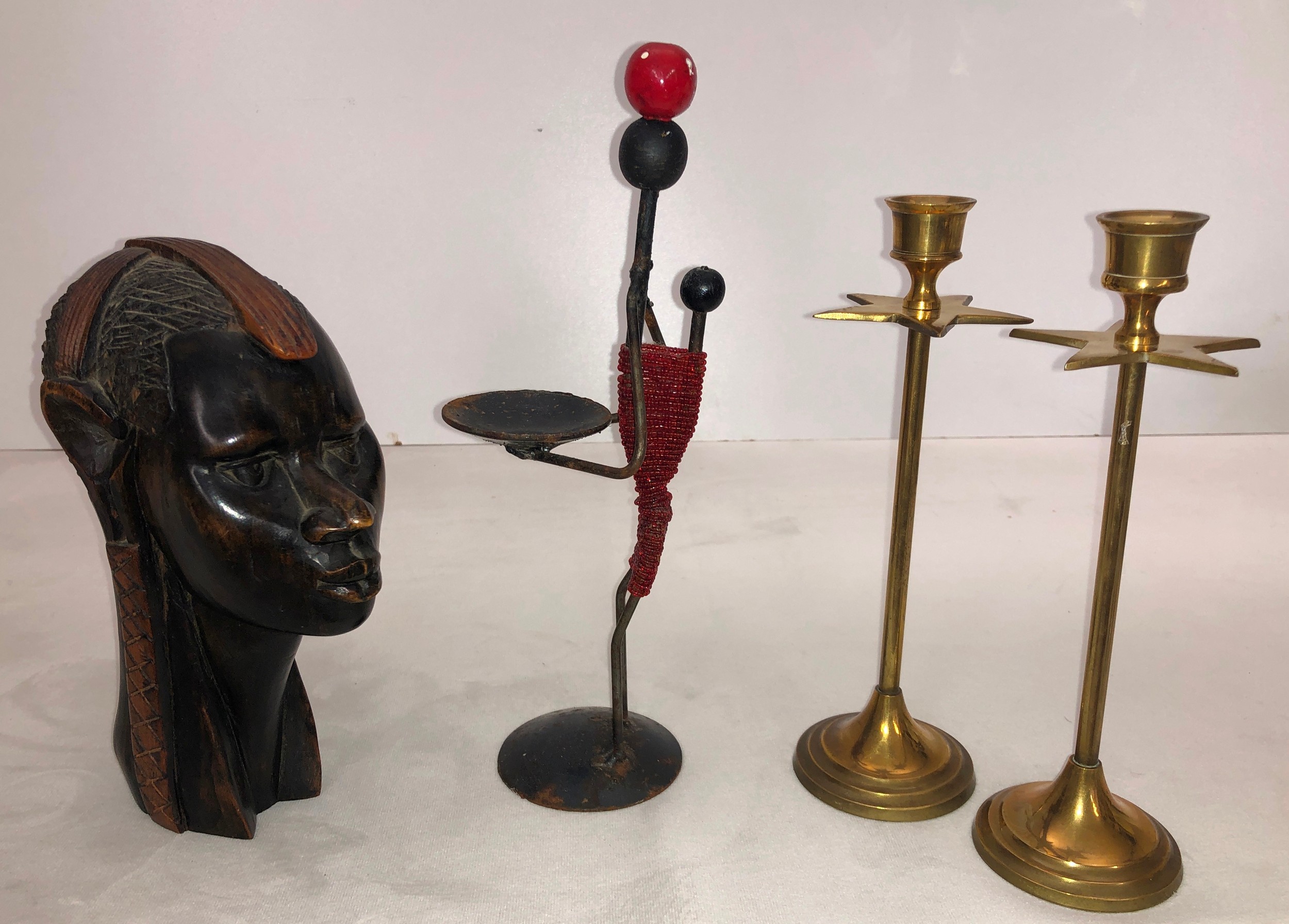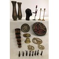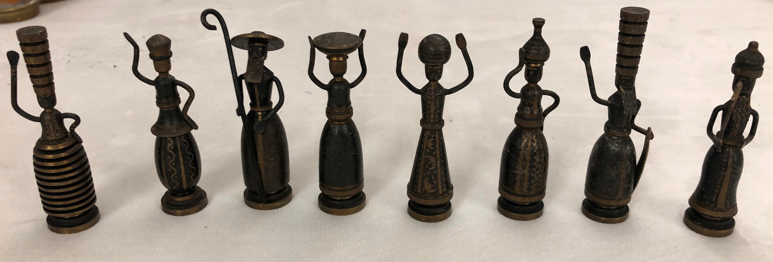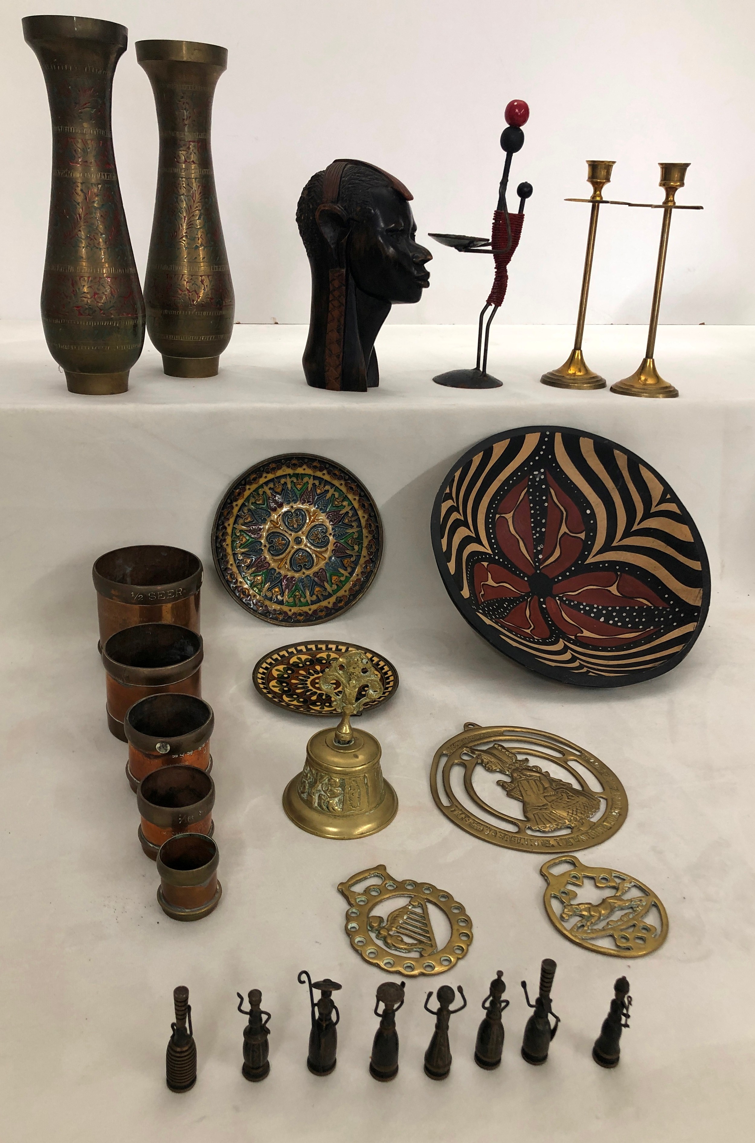 A collection of 8 Israeli miniature patinated brass biblical figurines each marked with label to base, David, Salome, Rachel, Ahasvero, Moshe, Shulamith, Esther and Josua, tallest 6.2cm high, a set of 5 copper and brass The Oriental Metal Pressing Works Bombay Inc measures from 1/2 Seer to 1/32, a pair of brass Indian candlesticks, 23cm high, a pair of Indian brass vases, 30.5cm high, various other brass , a metallic African female with a child, 27.5cm high, a craved wood African head, 22cm high etc.