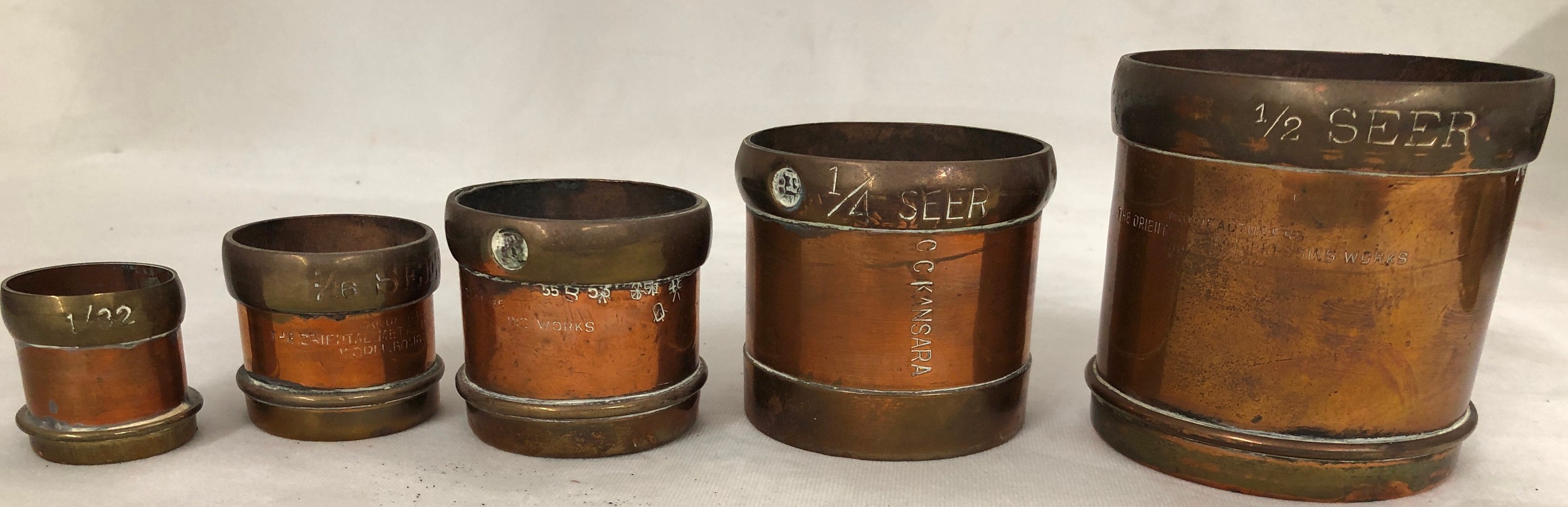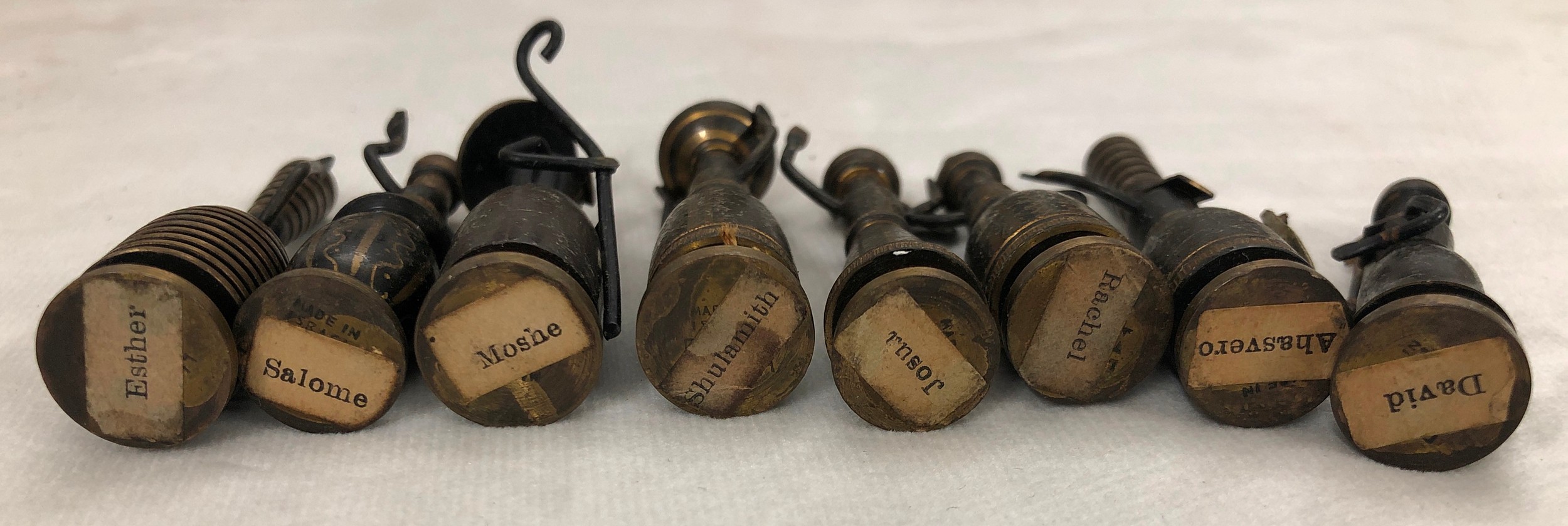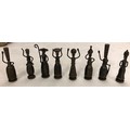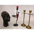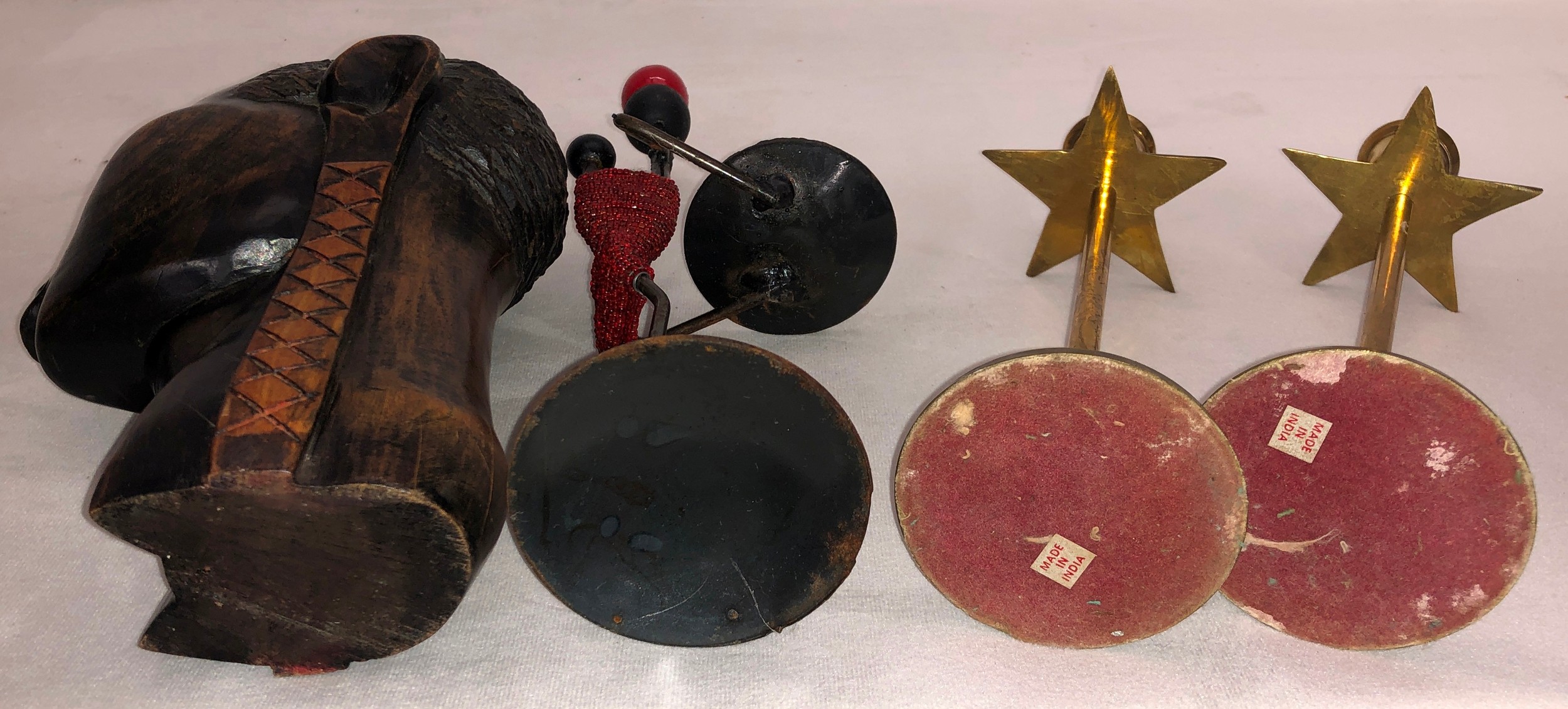 A collection of 8 Israeli miniature patinated brass biblical figurines each marked with label to base, David, Salome, Rachel, Ahasvero, Moshe, Shulamith, Esther and Josua, tallest 6.2cm high, a set of 5 copper and brass The Oriental Metal Pressing Works Bombay Inc measures from 1/2 Seer to 1/32, a pair of brass Indian candlesticks, 23cm high, a pair of Indian brass vases, 30.5cm high, various other brass , a metallic African female with a child, 27.5cm high, a craved wood African head, 22cm high etc.
