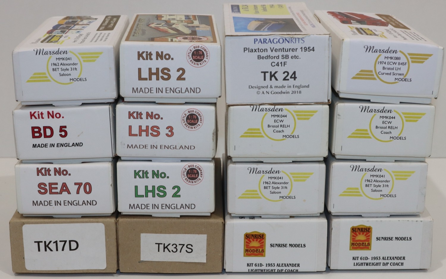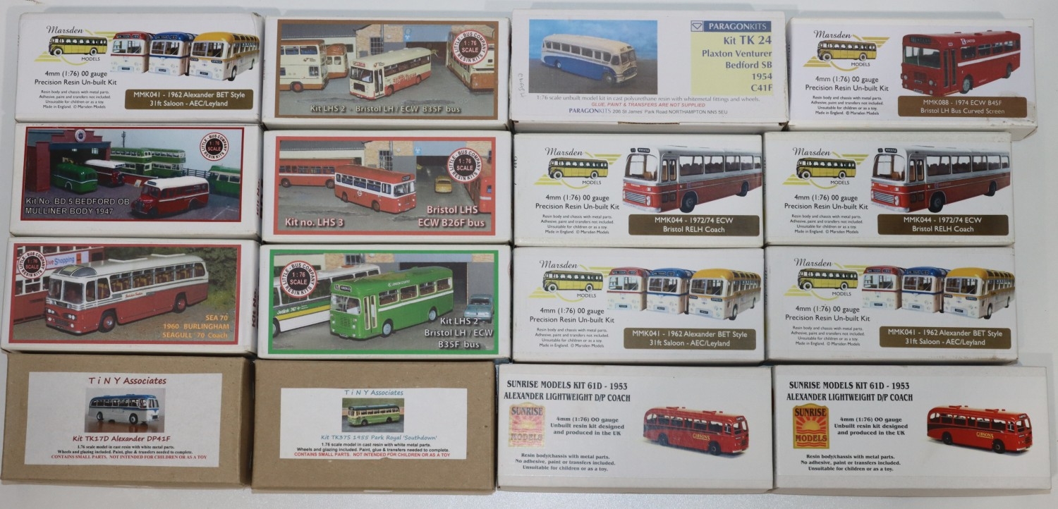 A quantity of 1:76 scale resin and metal fitting kits of buses, 5 Little Bus Company, 6 Marsden models, 2 Sunrise models, 1 Paragon kits and 2 Tiny Associates models (16)