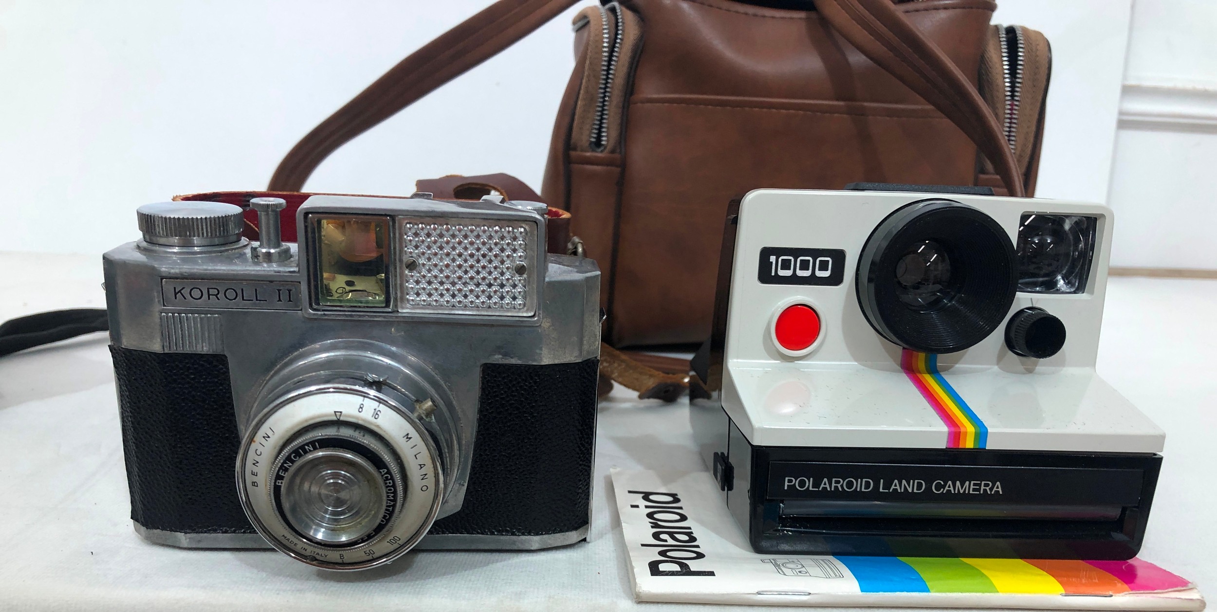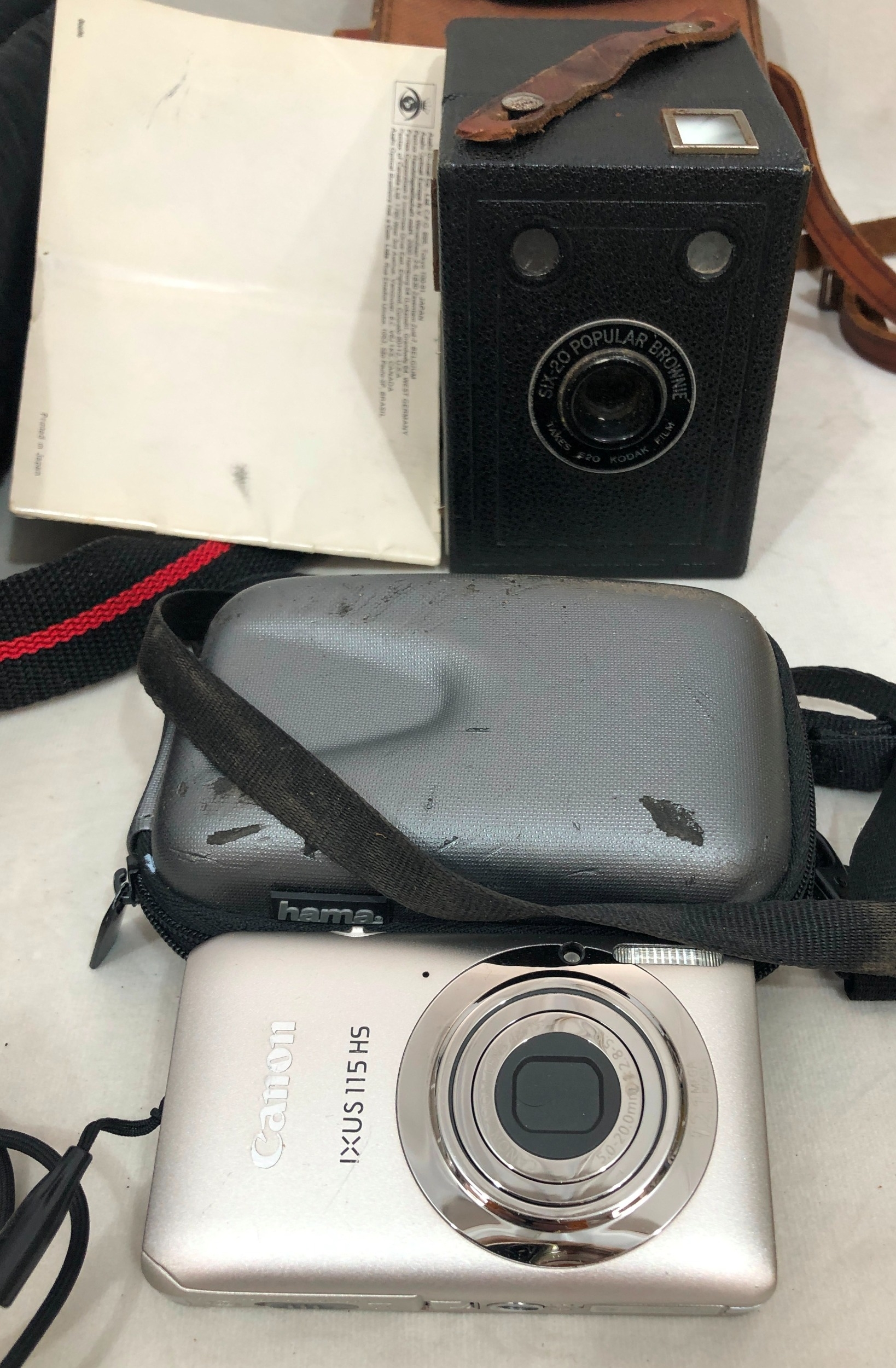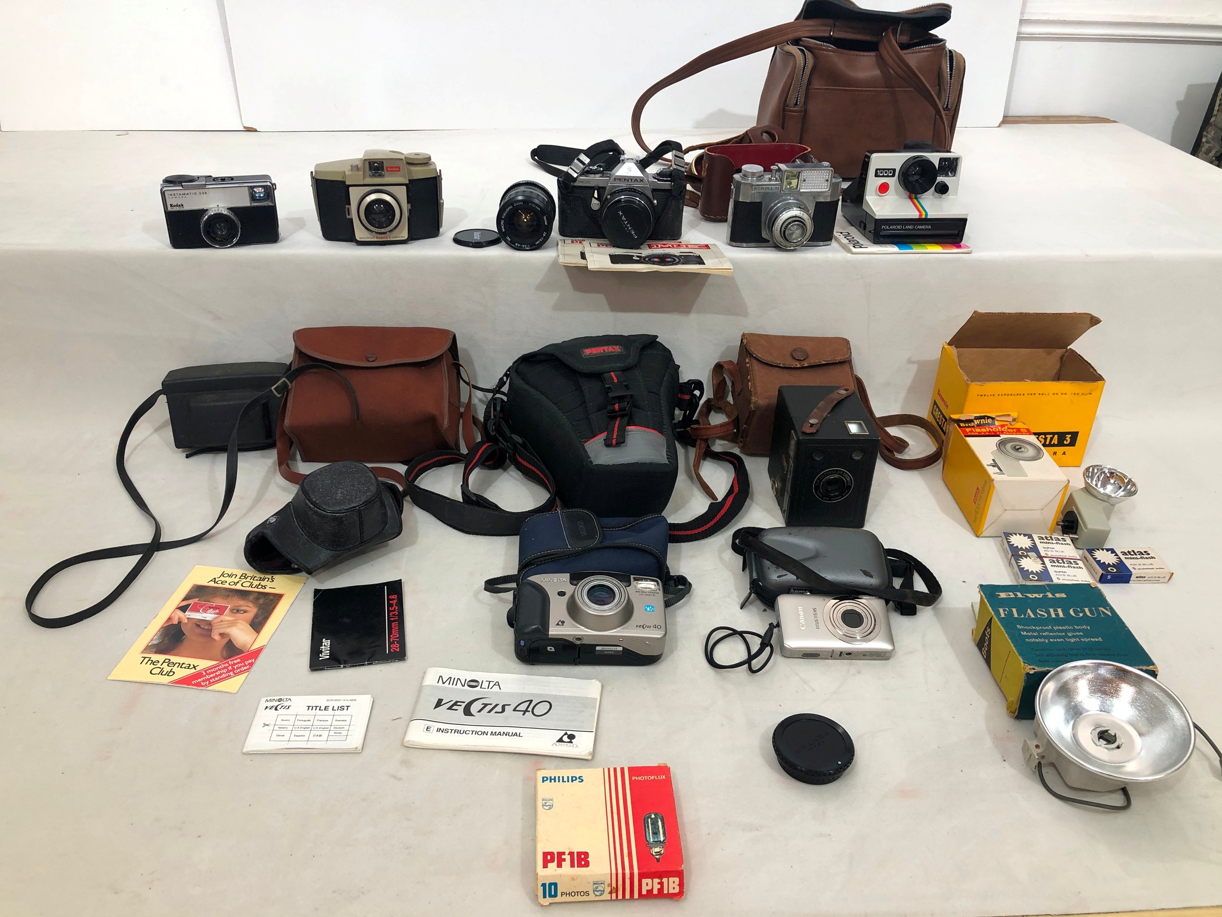 A Koroll II camera with Bencini 1:8 lens and case, a Kodak Instamatic 233 camera, cased, a Kodak Brownie Cresta 3 camera, cased, a Pentax Asahi camera, No.145582 with 1:1.7 lens, a Polaroid 1000 land camera, a Canon Ixus 115HS camera no.313064011591, cased, a Kodak SIX-20 Popular Brownie, cased, a Minolta Vectis 40 camera, no. 56806546, a Vivitar Macro Focusing zoom lens 28-70mm