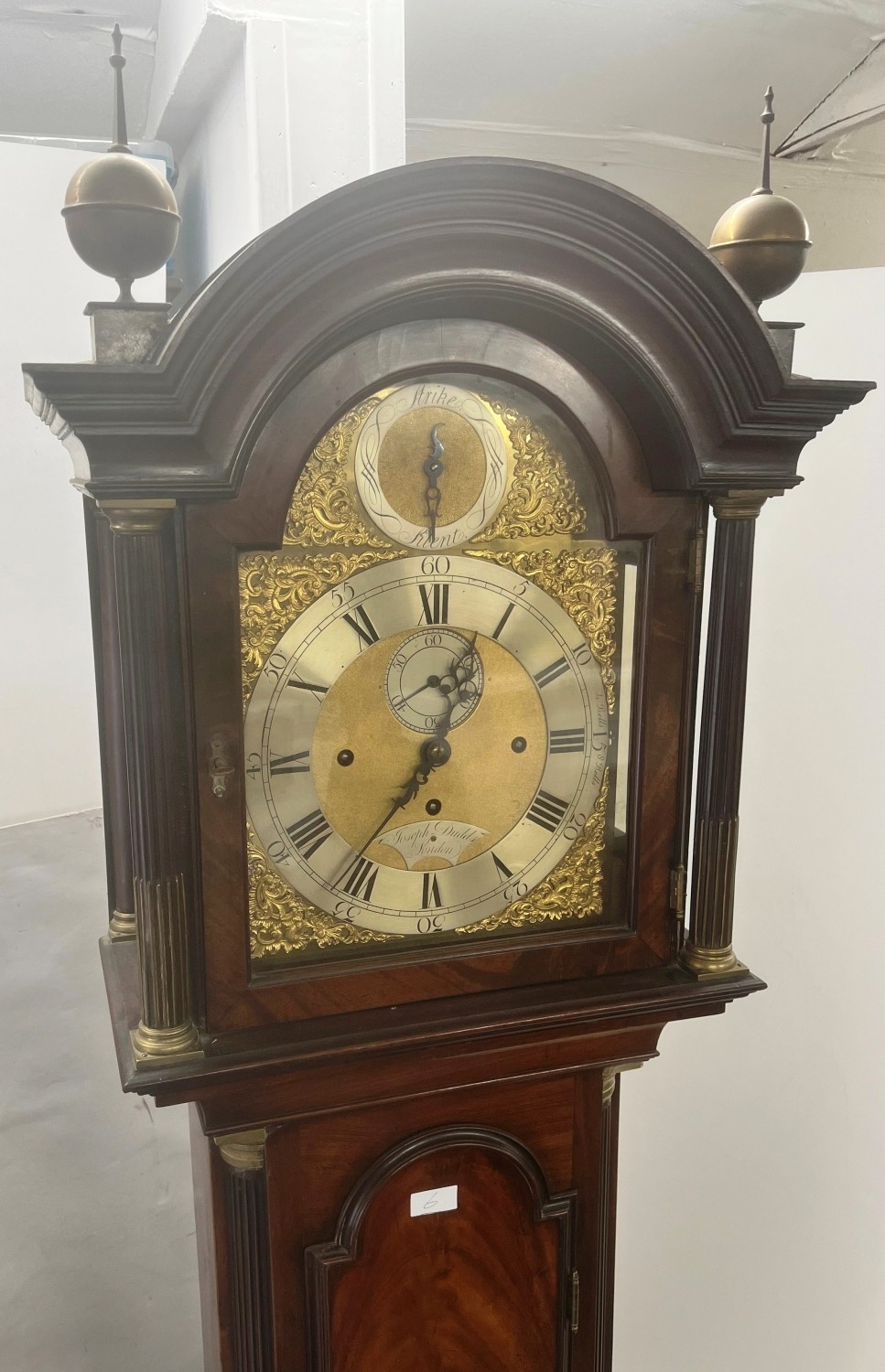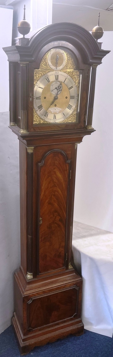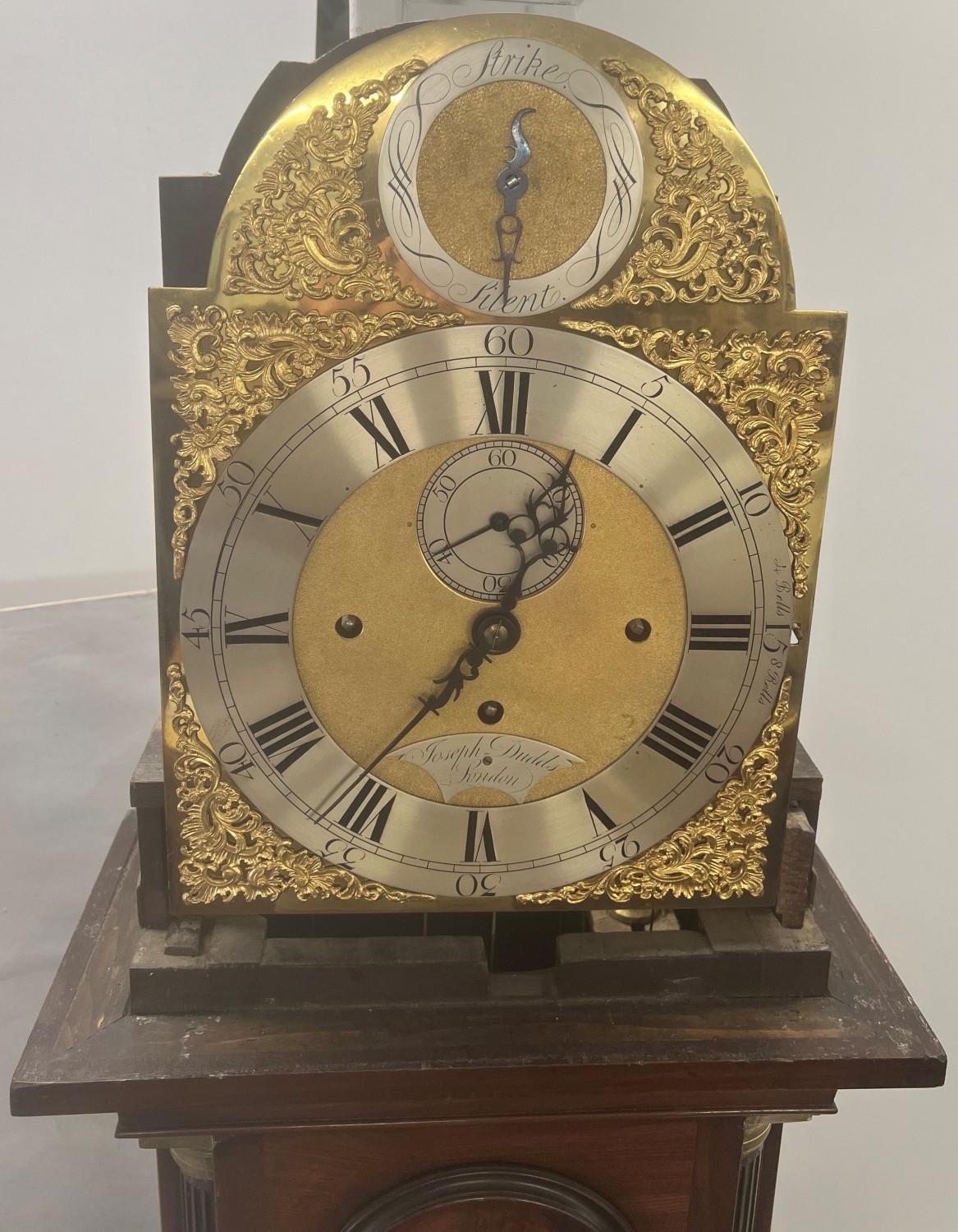 Joseph Dudds, London, musical 4 and 8 bell 8-day striking longcase with brass arch dial and silvered chapter ring with seconds dial, Roman and Arabic numerals, in fitted mahogany case with half round reeded column supports, brass bulbous finials to top, 227cm high overall