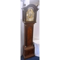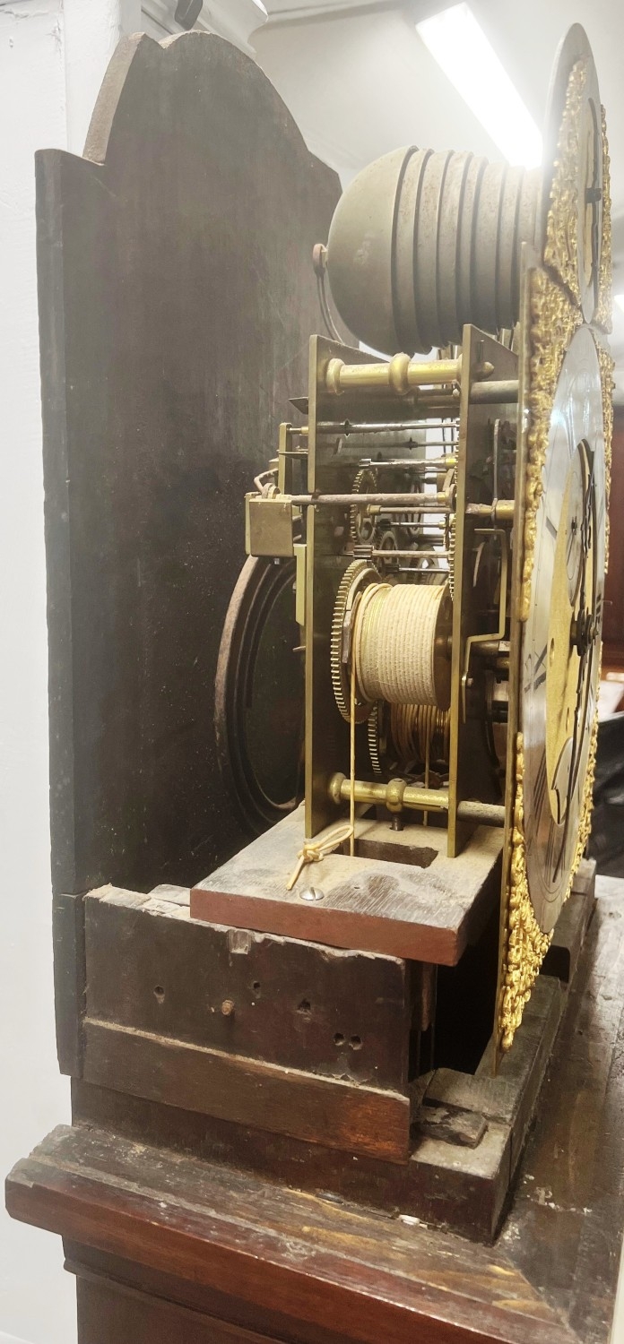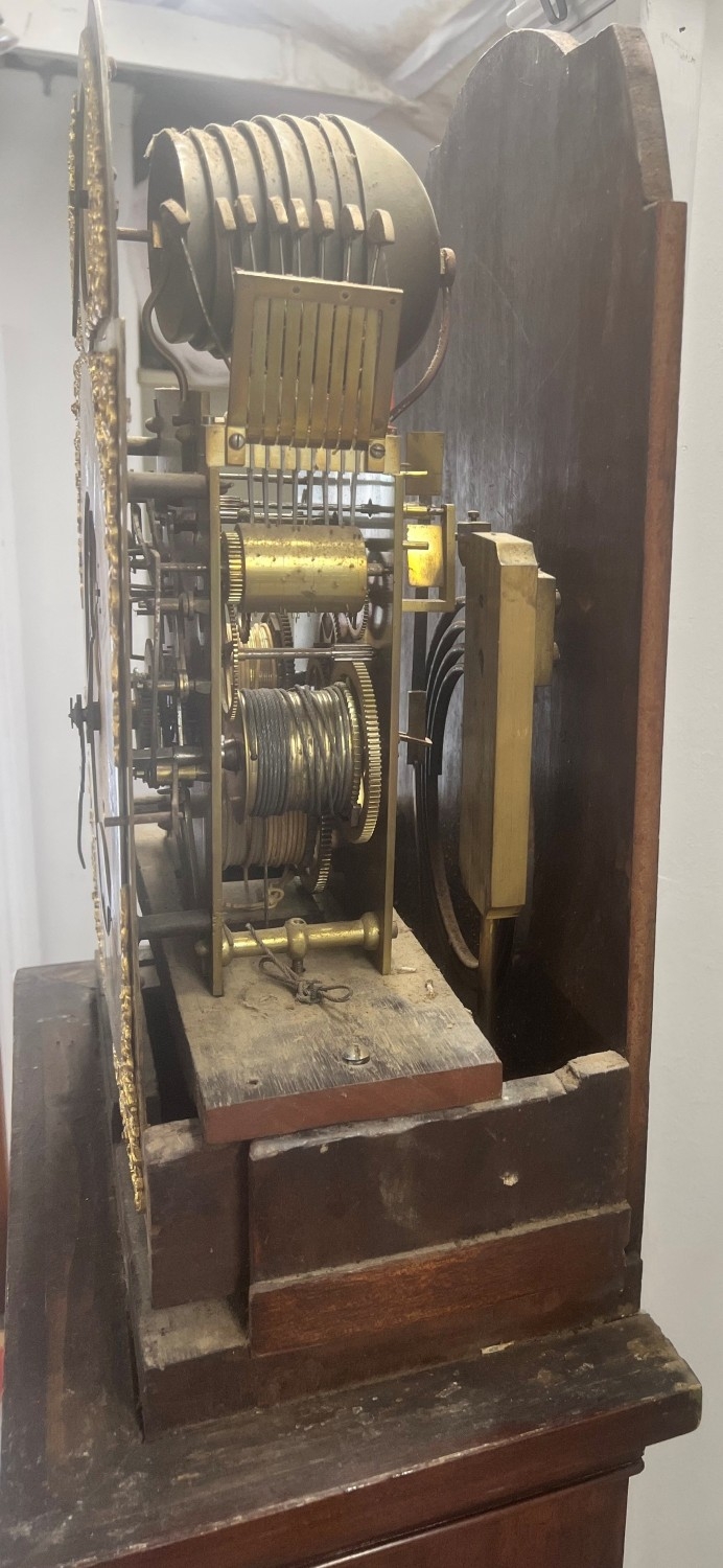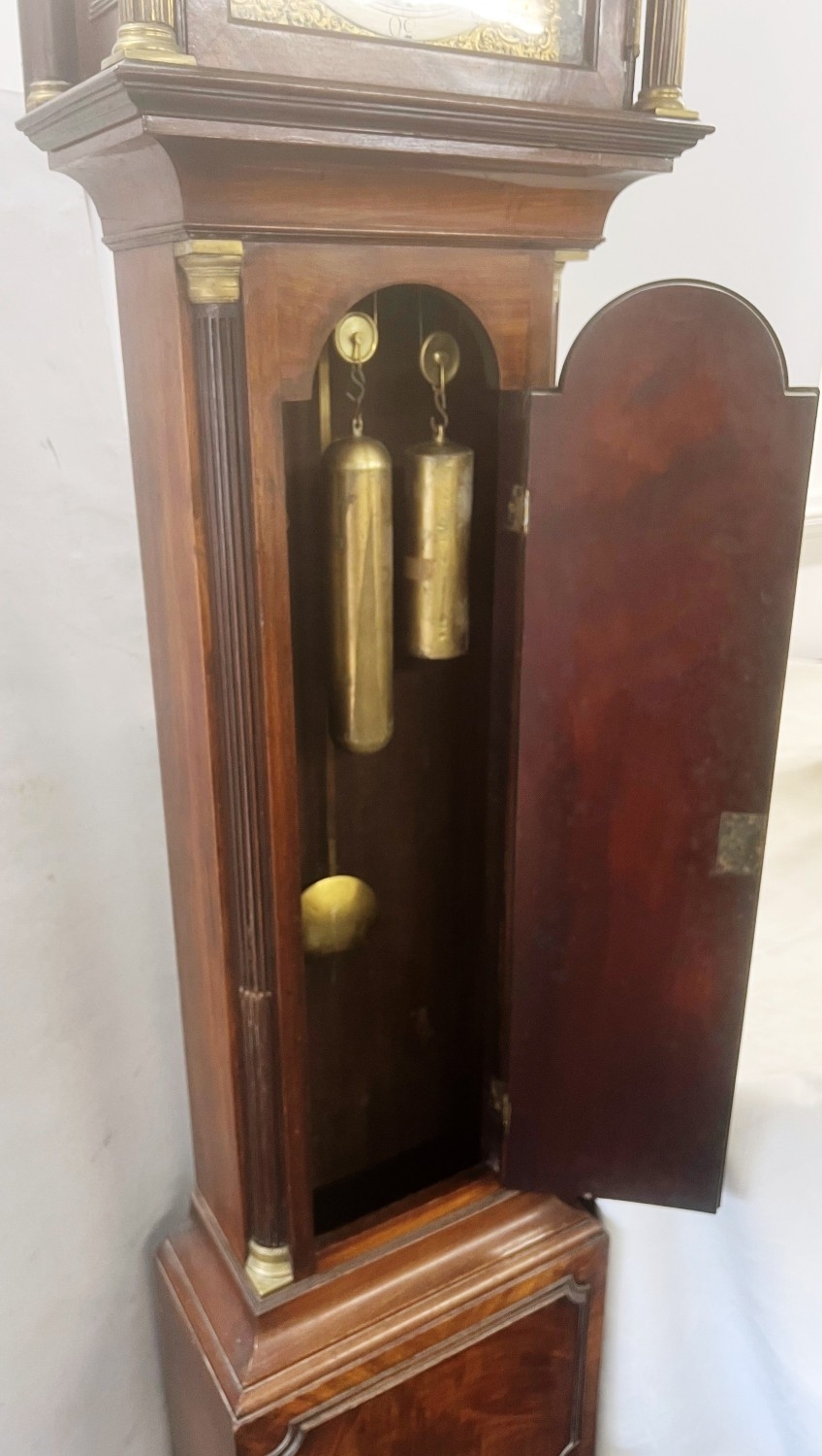 Joseph Dudds, London, musical 4 and 8 bell 8-day striking longcase with brass arch dial and silvered chapter ring with seconds dial, Roman and Arabic numerals, in fitted mahogany case with half round reeded column supports, brass bulbous finials to top, 227cm high overall