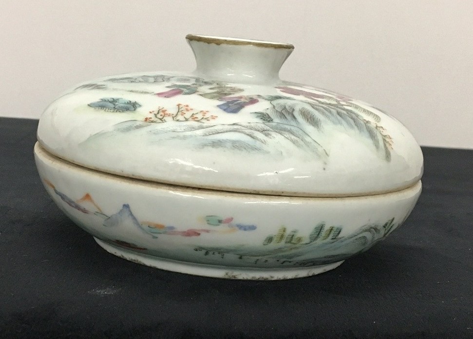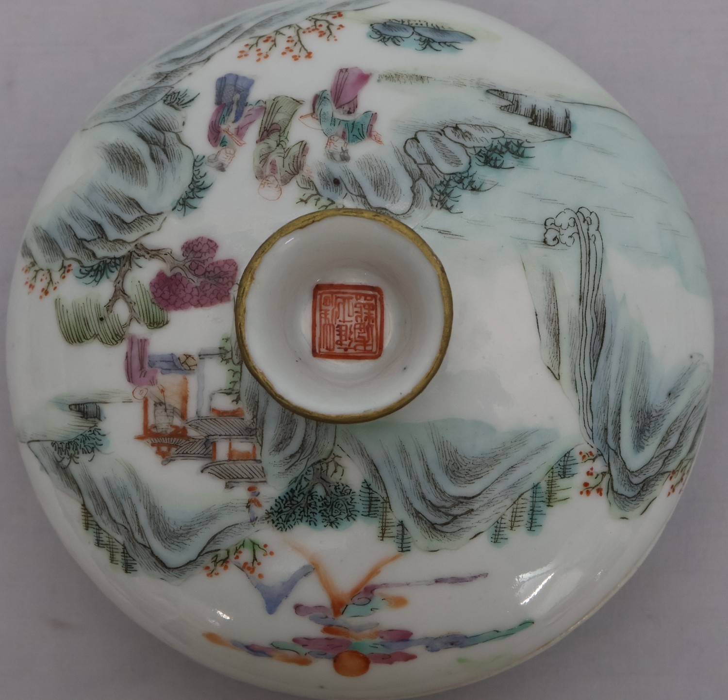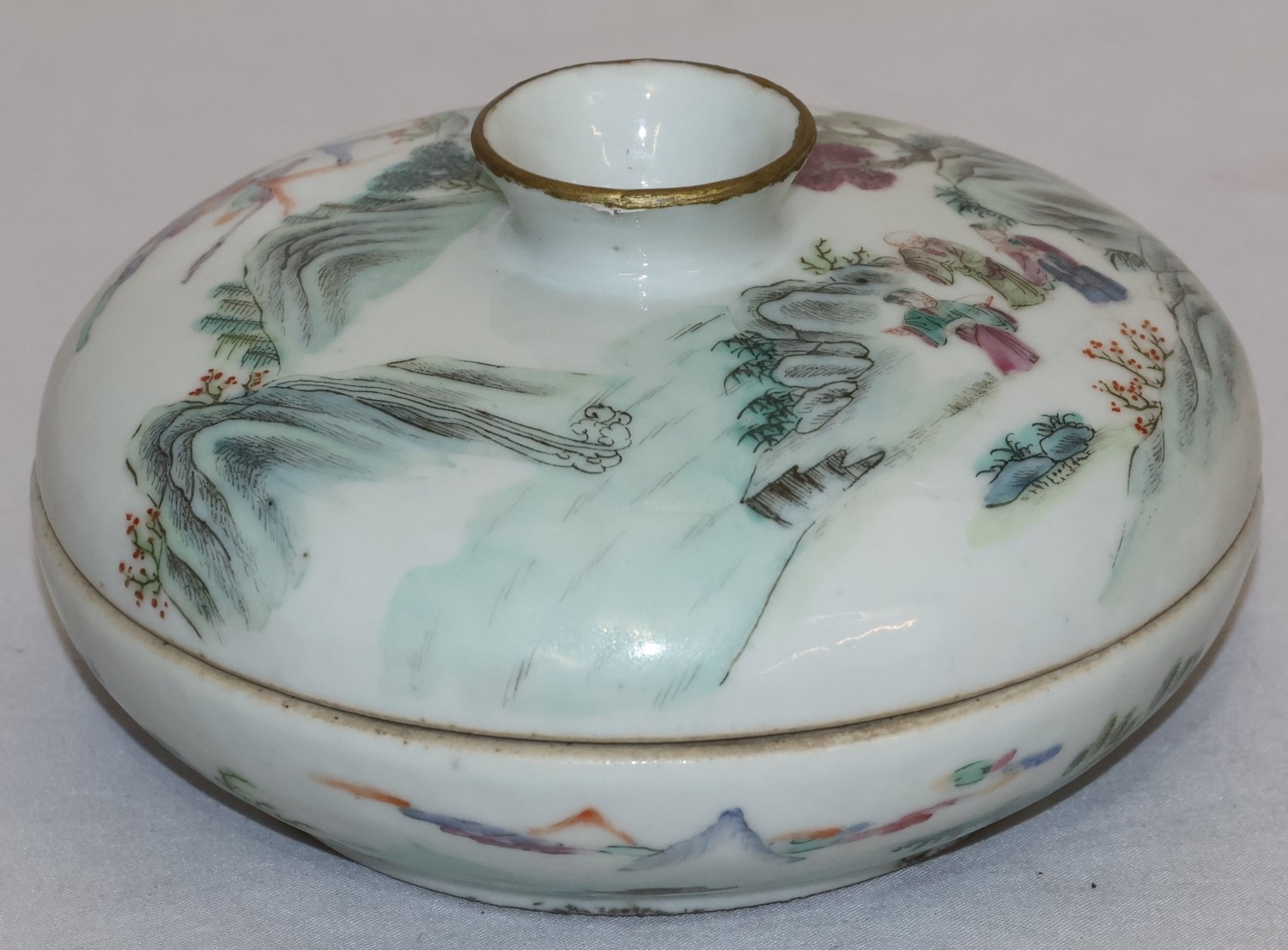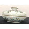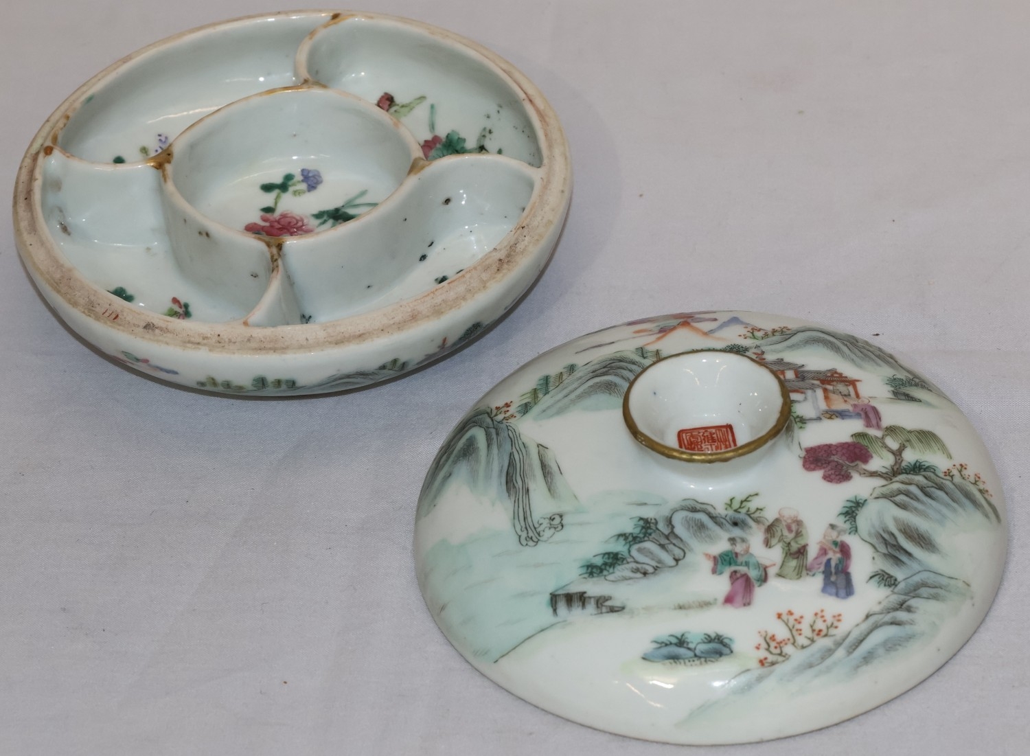 A 18th/19th Century Chinese bulbous shaped pot with cover enclosing sectioned interior, on white ground with multi-coloured figure, mountain, floral and leaf decoration, 15cm diameter