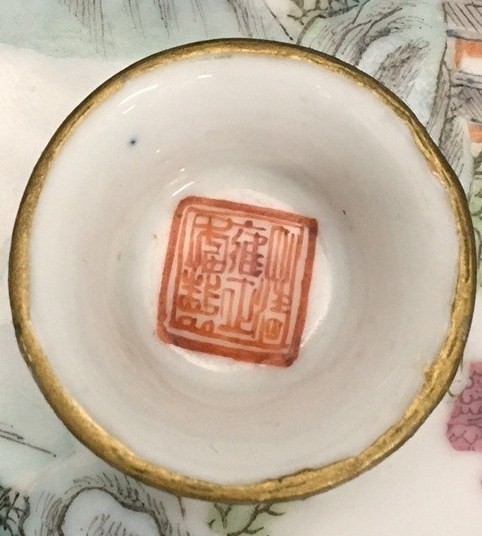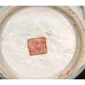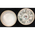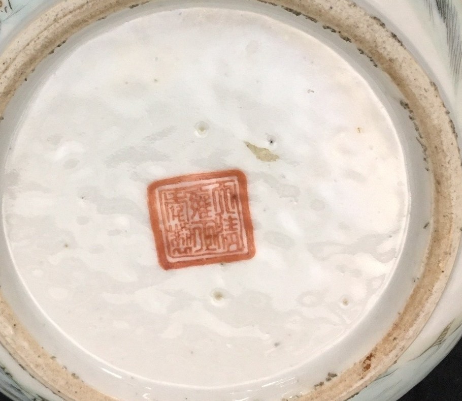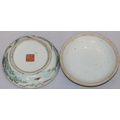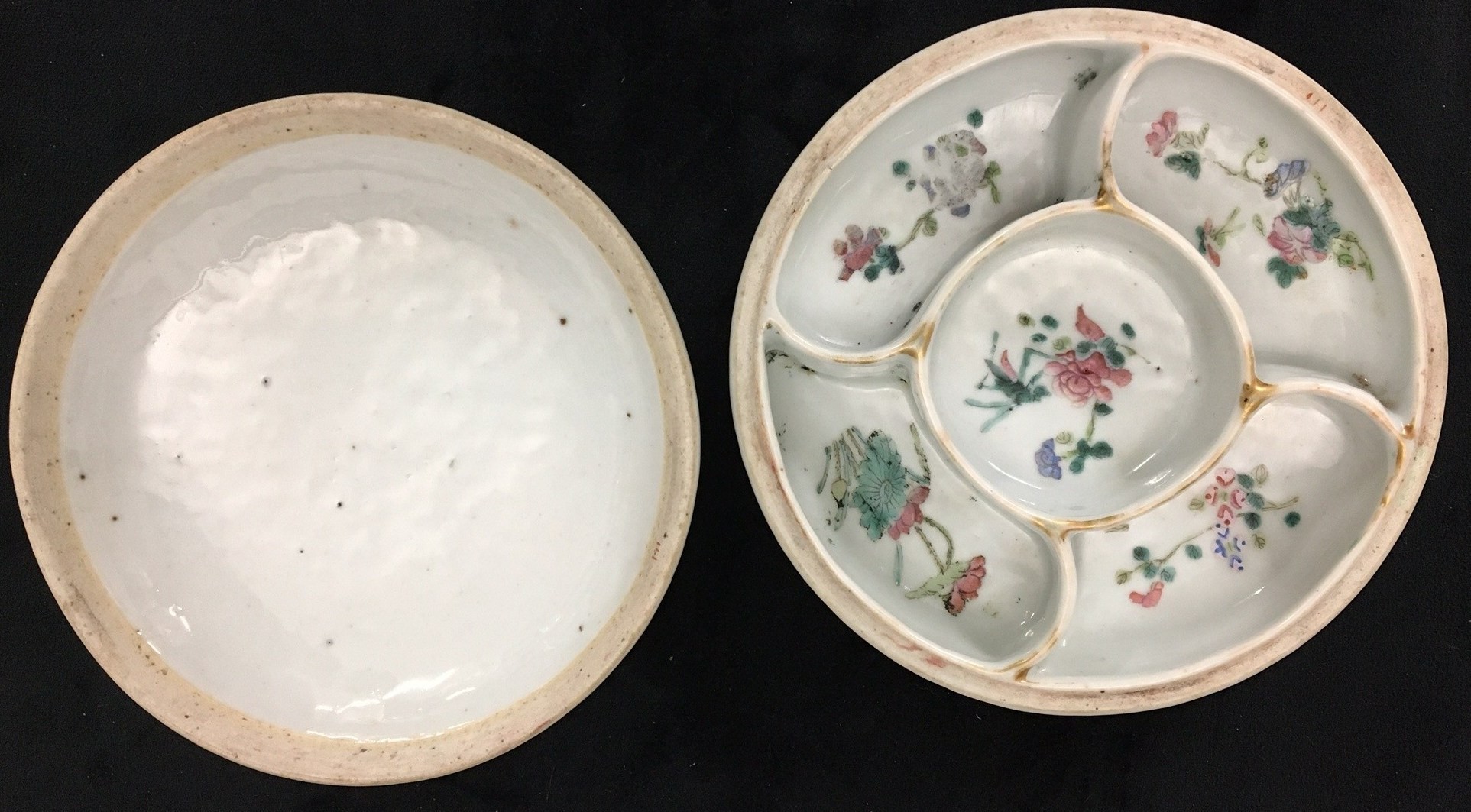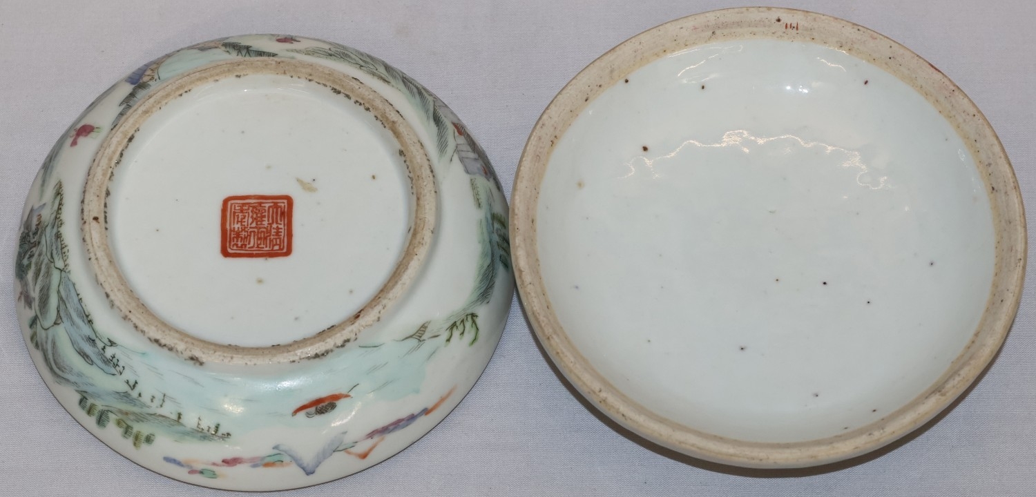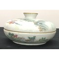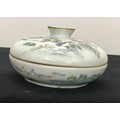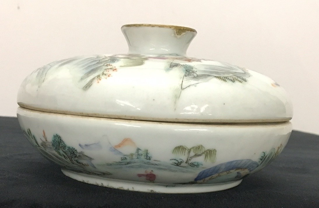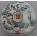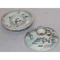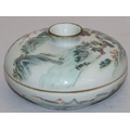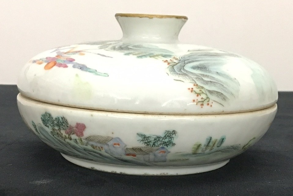 A 18th/19th Century Chinese bulbous shaped pot with cover enclosing sectioned interior, on white ground with multi-coloured figure, mountain, floral and leaf decoration, 15cm diameter