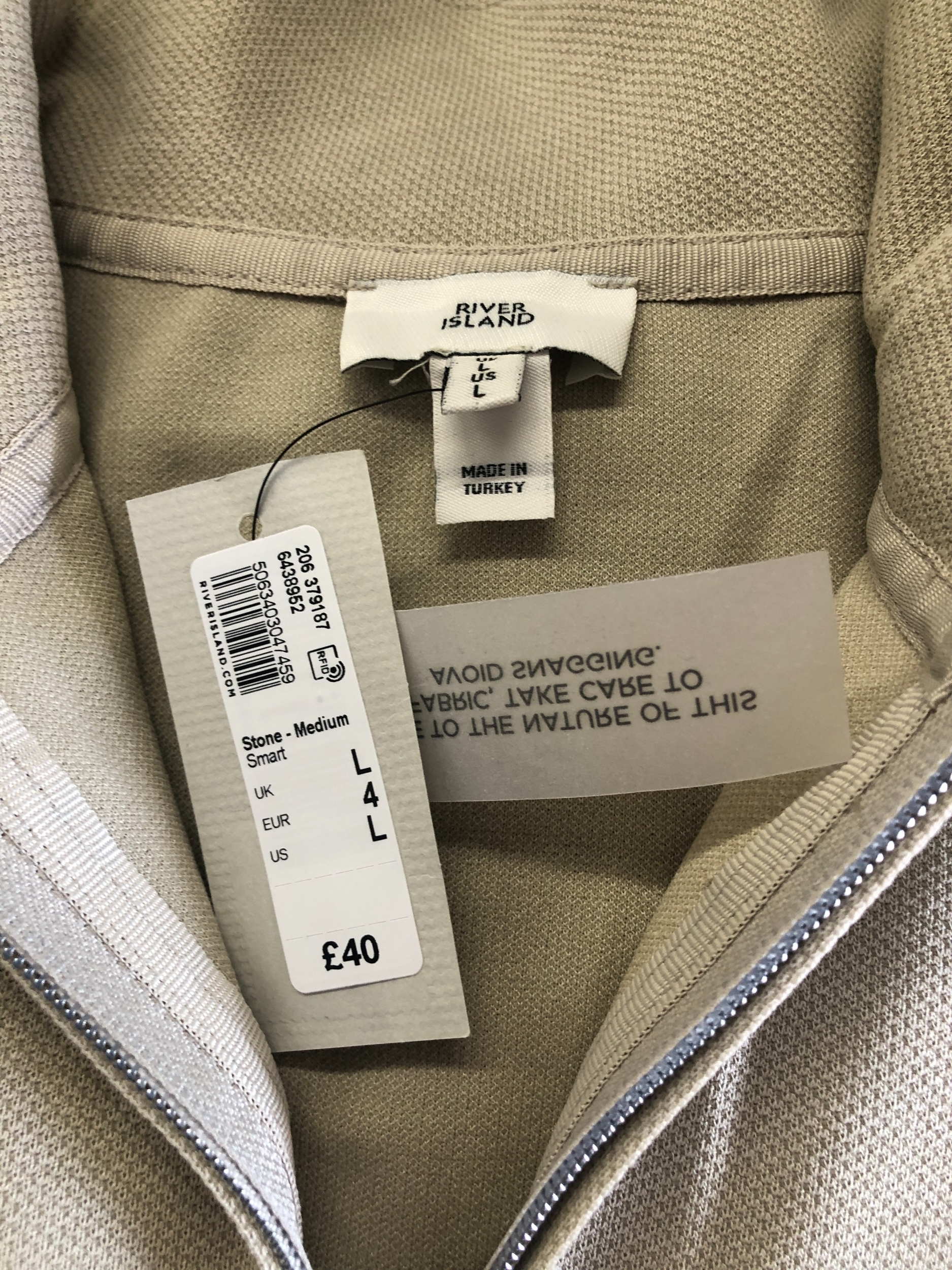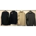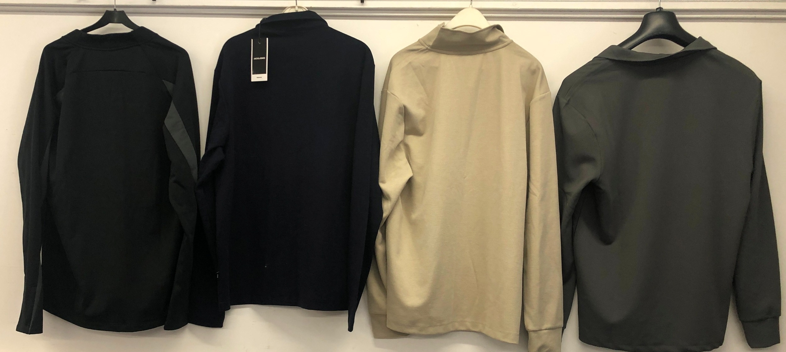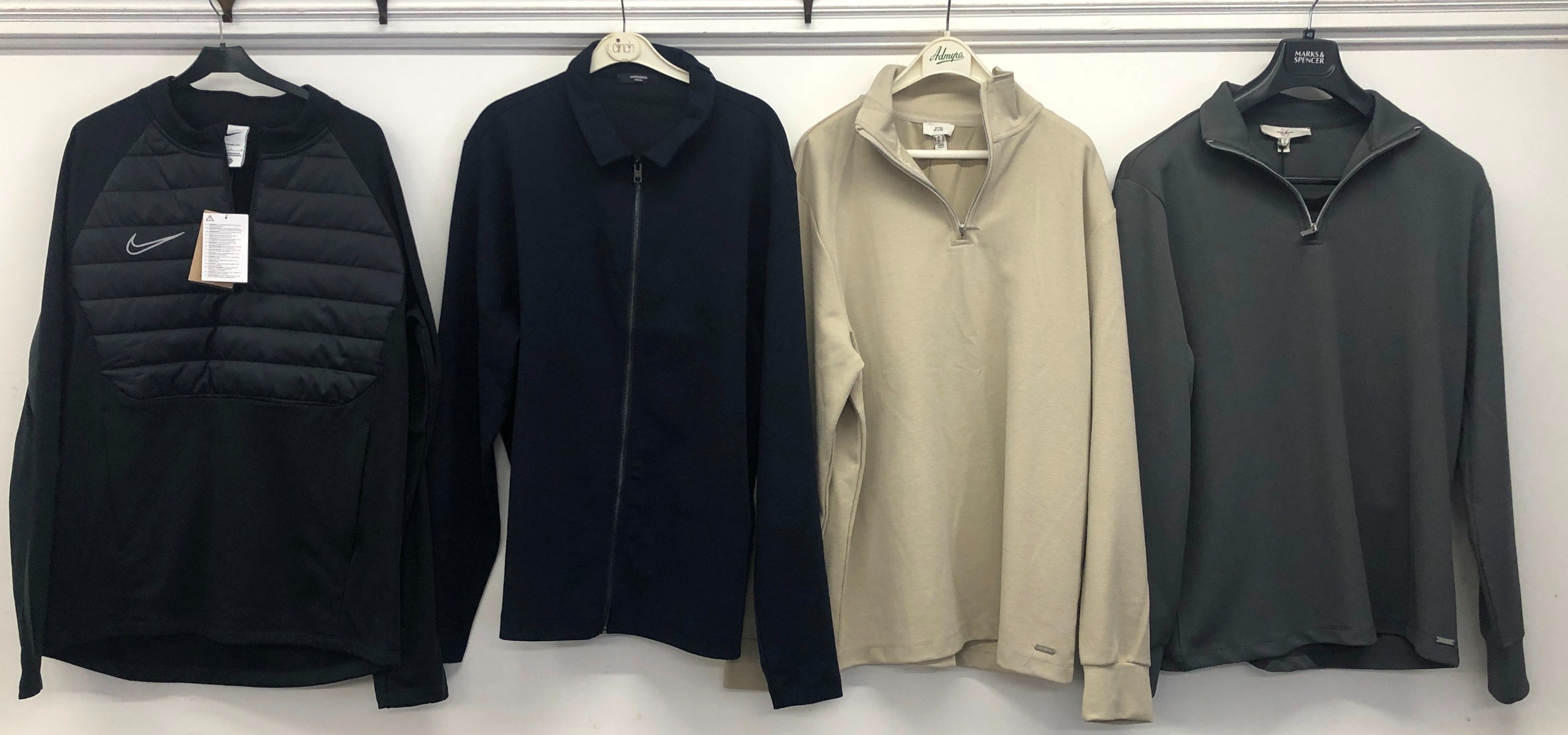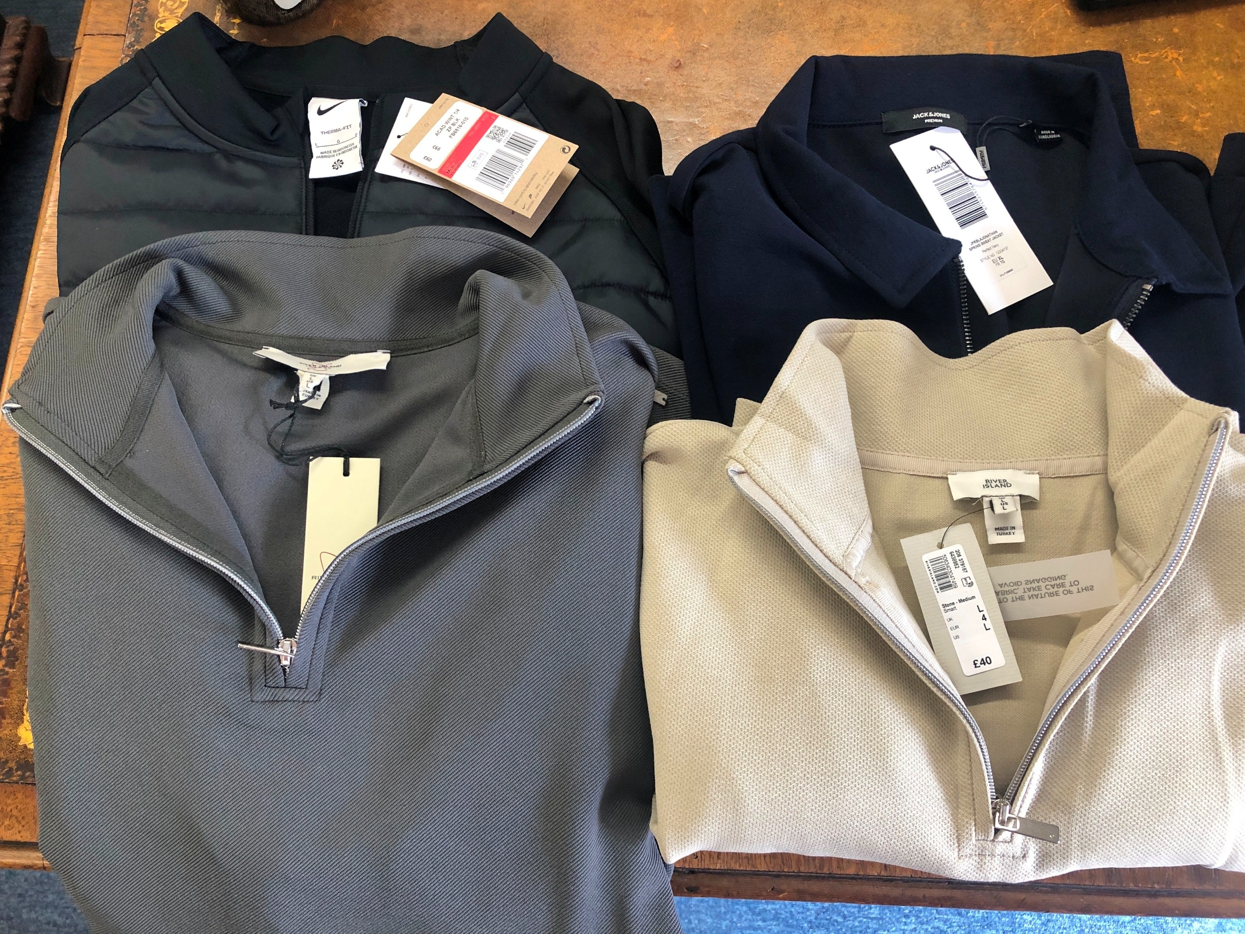4 as new men's tops, all with retail tags. 2 River Island Long Sleeve Slim Fit Smart Twill Funnel Neck Quarter Zip Sweatshirts, colour Grey and Stone Size L, a Jack & Jones navy Spring sweat Jacket with full zip, size XL and a black Therma-Fit Nike Academy Winter 1/4 Zip Top, size L