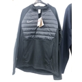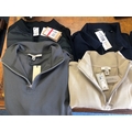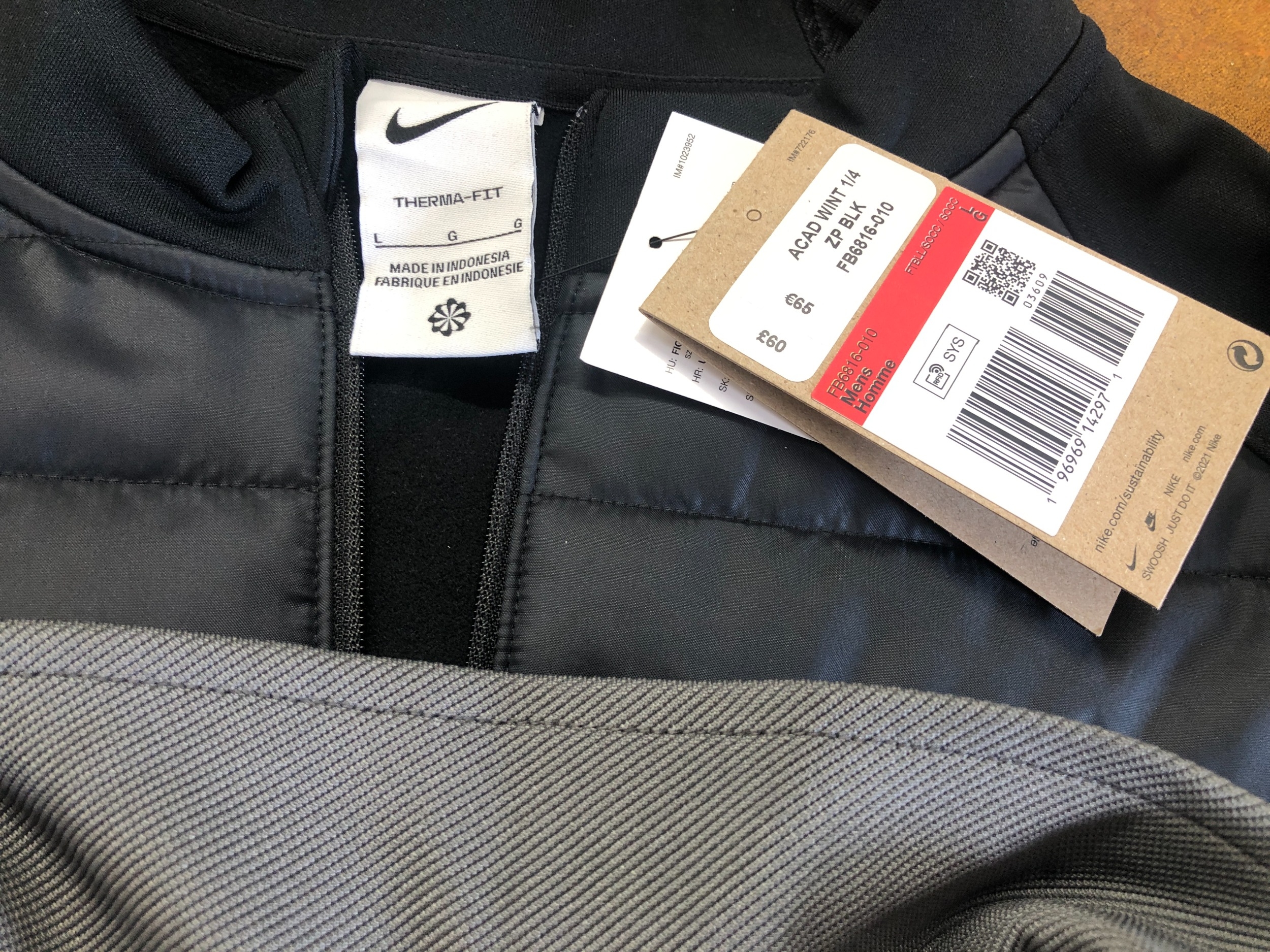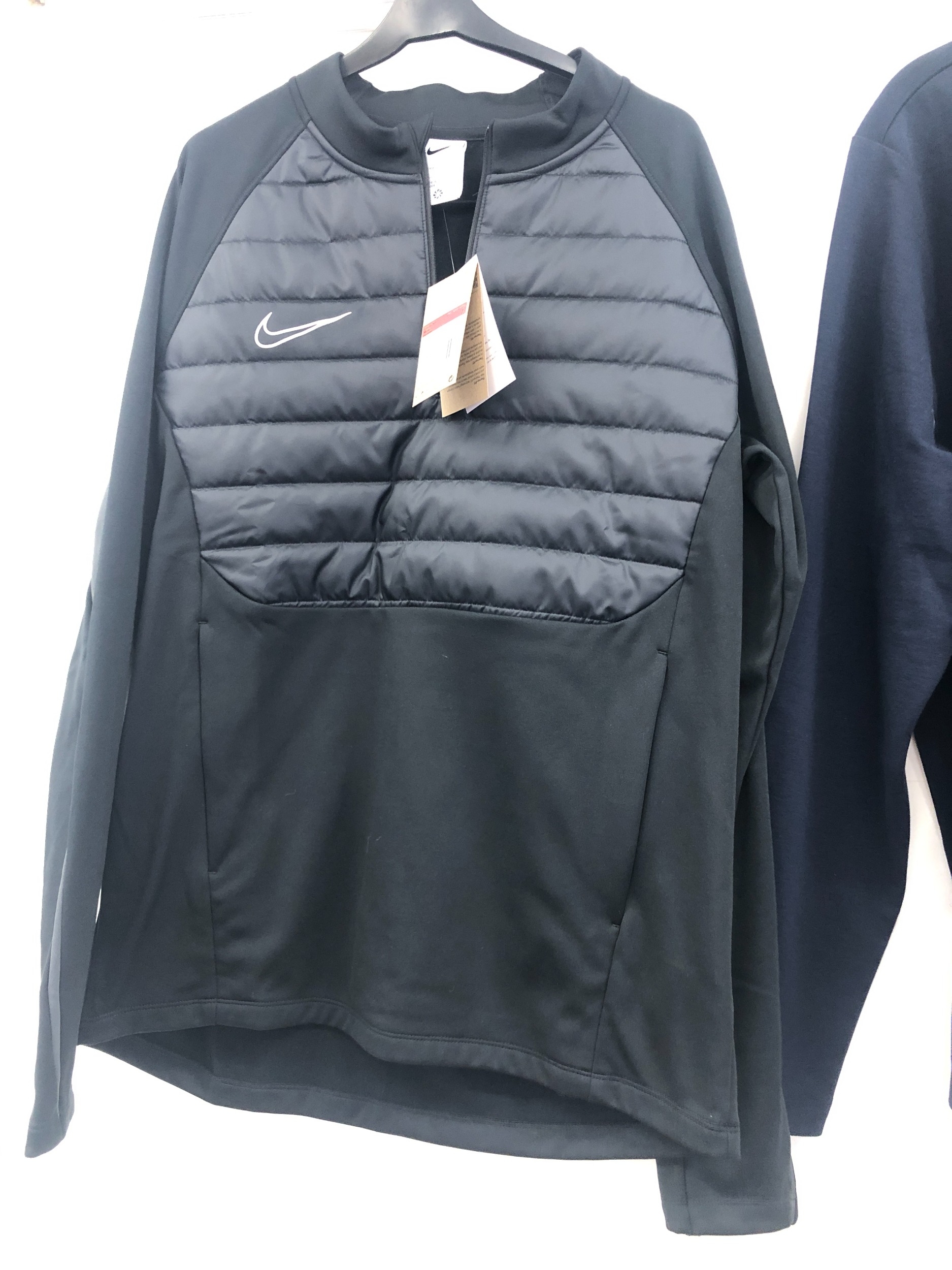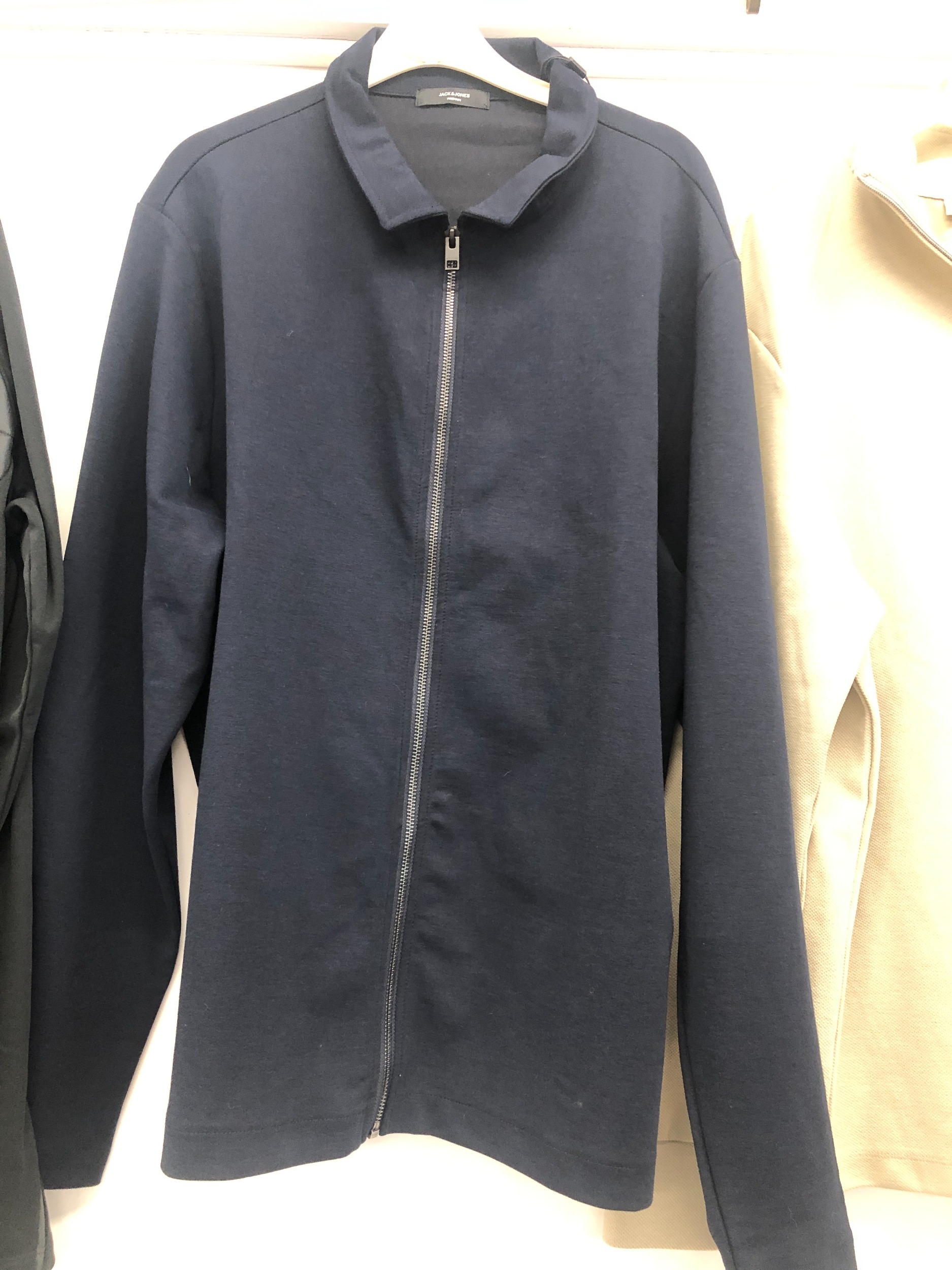 4 as new men's tops, all with retail tags. 2 River Island Long Sleeve Slim Fit Smart Twill Funnel Neck Quarter Zip Sweatshirts, colour Grey and Stone Size L, a Jack & Jones navy Spring sweat Jacket with full zip, size XL and a black Therma-Fit Nike Academy Winter 1/4 Zip Top, size L