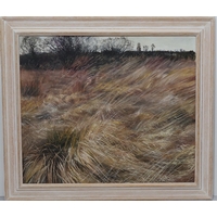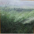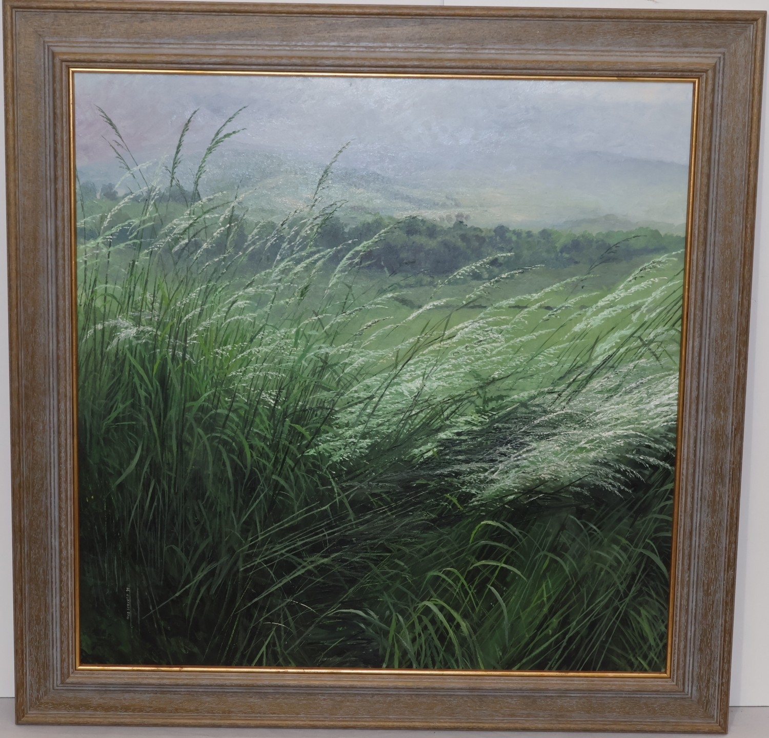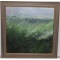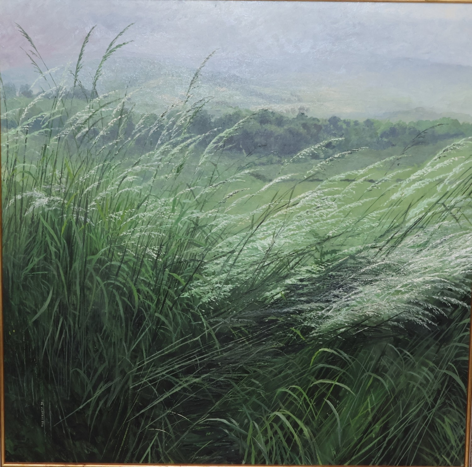Meg Stevens (1931-2012), oil on board, 59cm x 59cm, "Tall Green Grass with Valley in Distance", signed and dated '94, framed