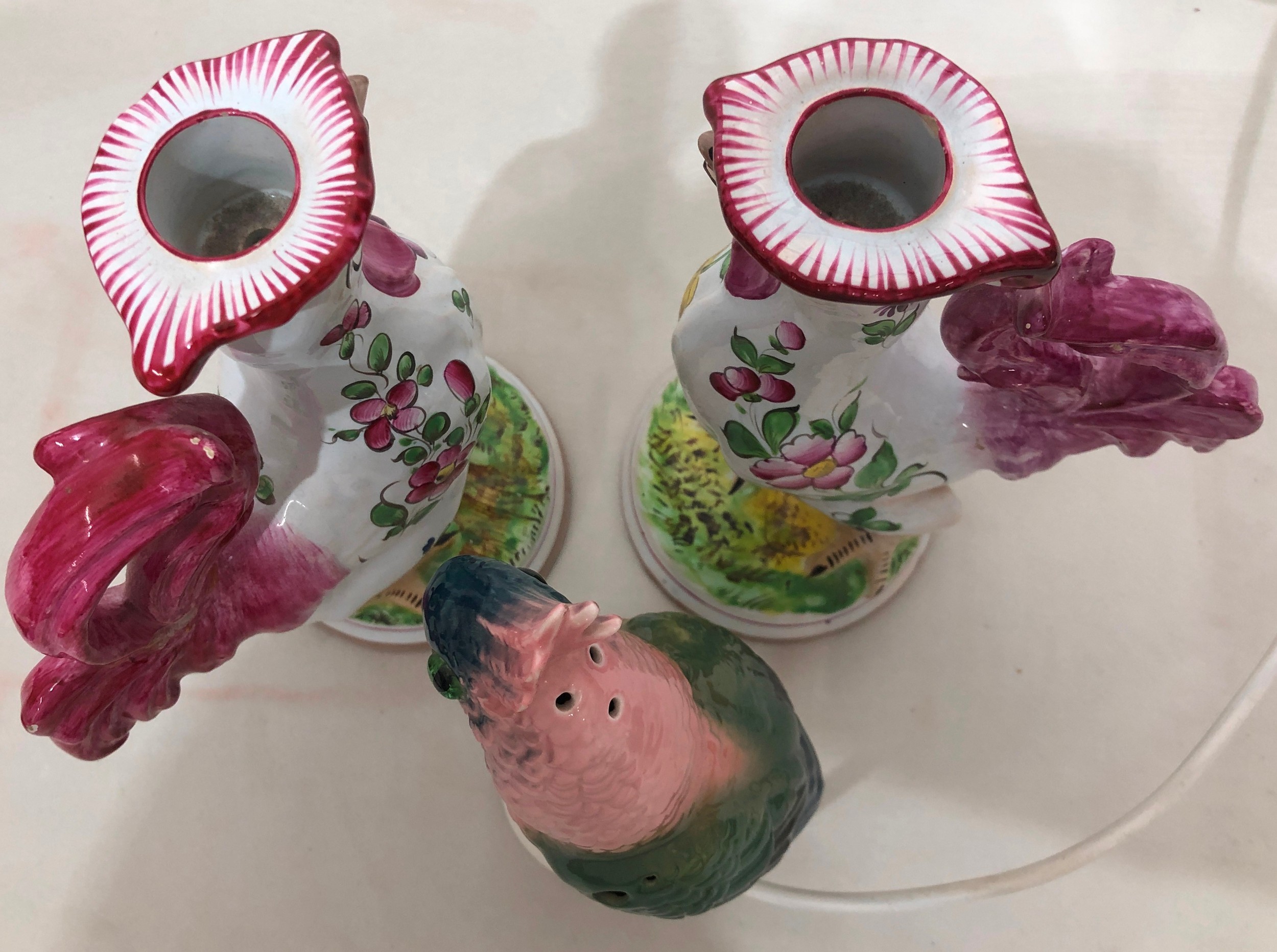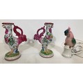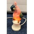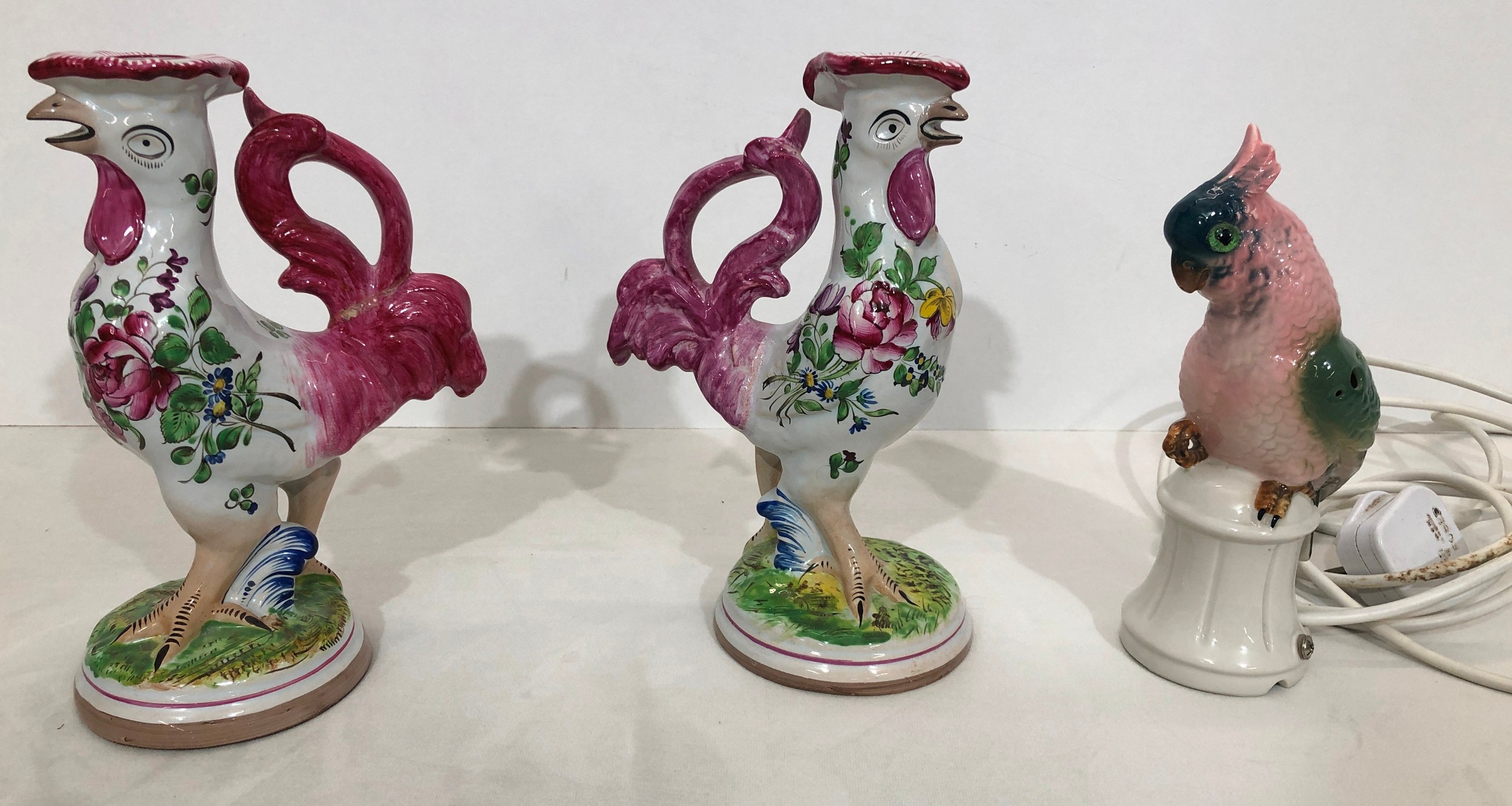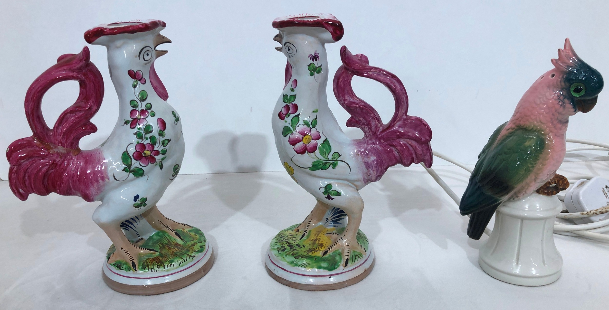 A pair of reproduction Majolica candlesticks in the form of cockerels, 23cm high and cockatoo lamp, 21cm high (working).