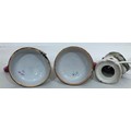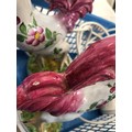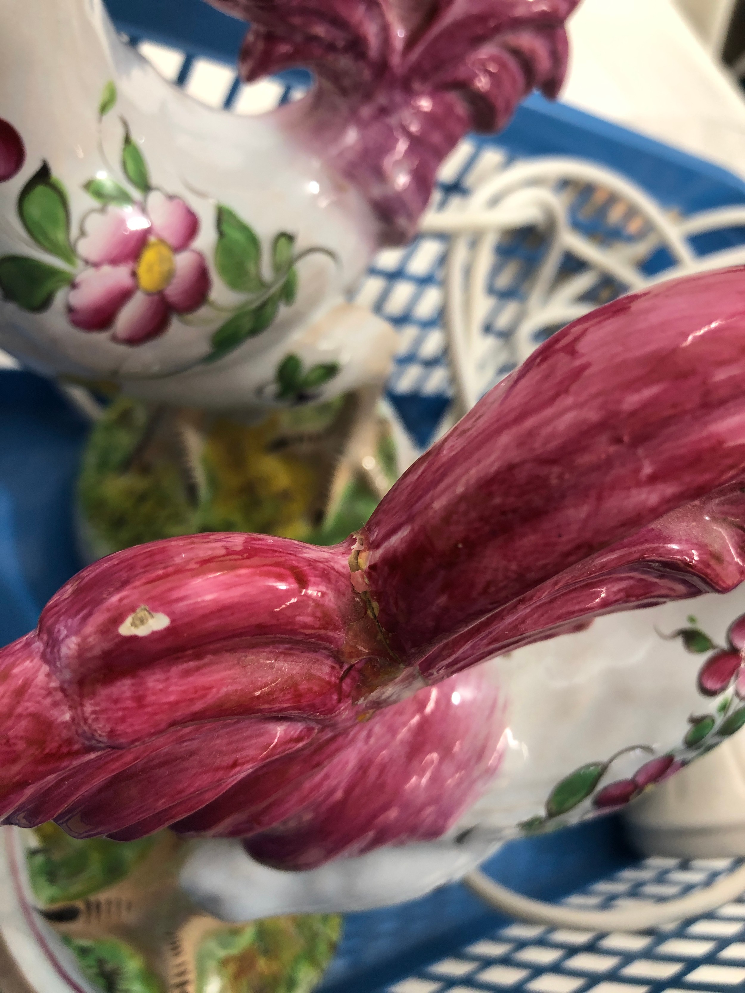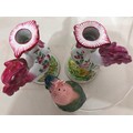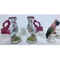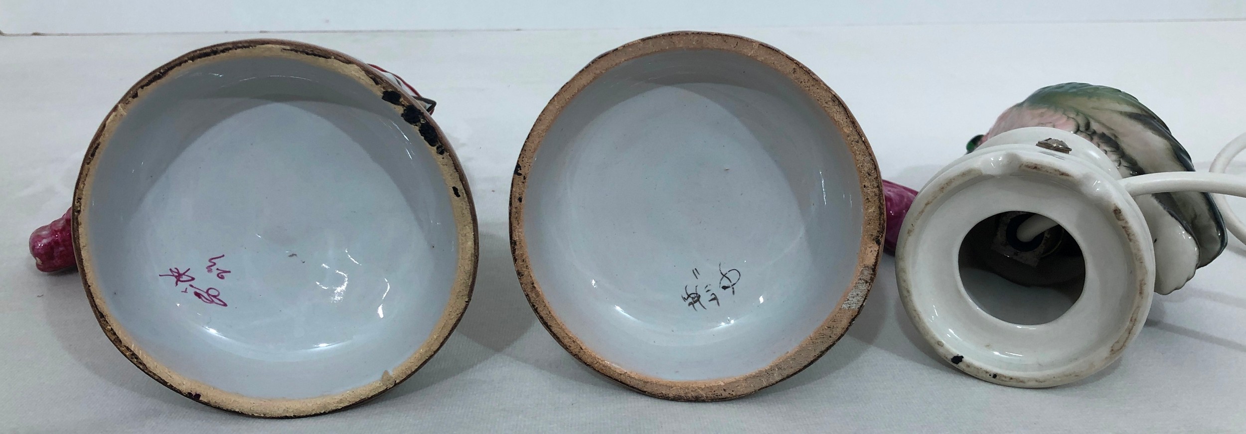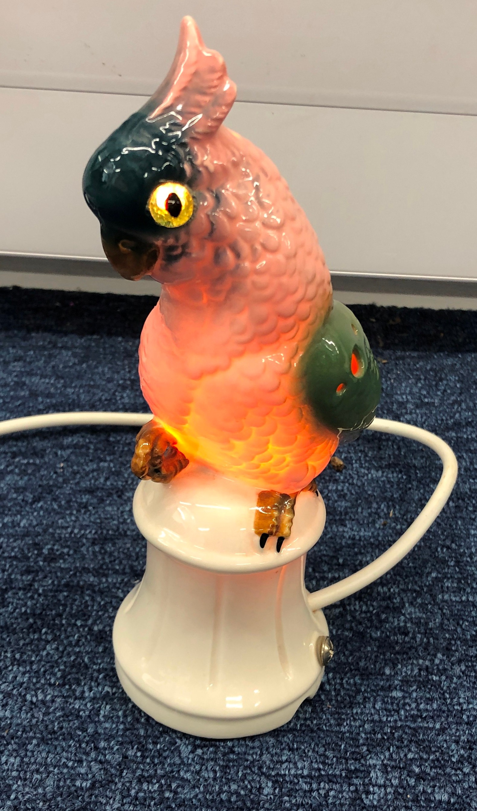 A pair of reproduction Majolica candlesticks in the form of cockerels, 23cm high and cockatoo lamp, 21cm high (working).