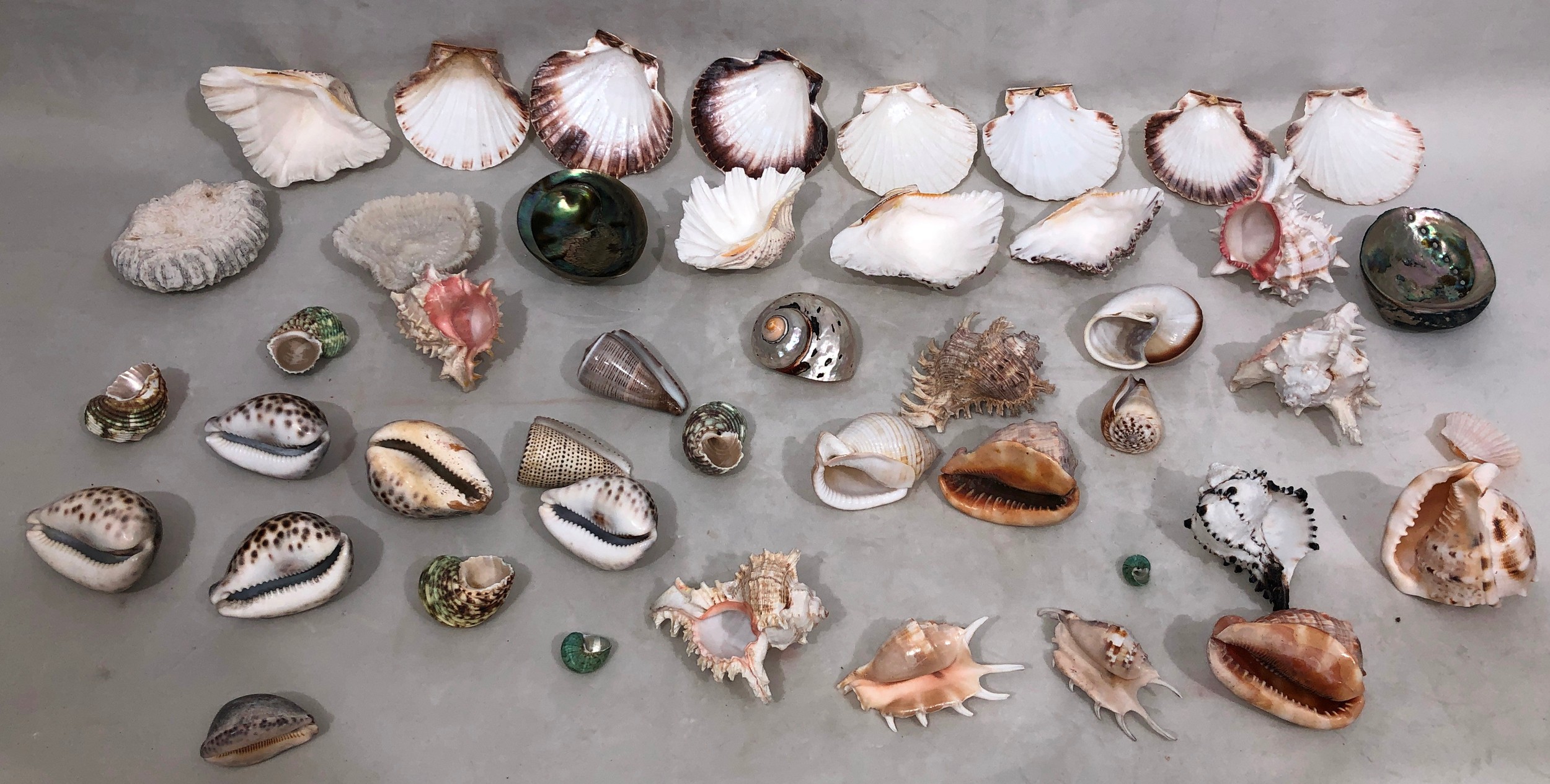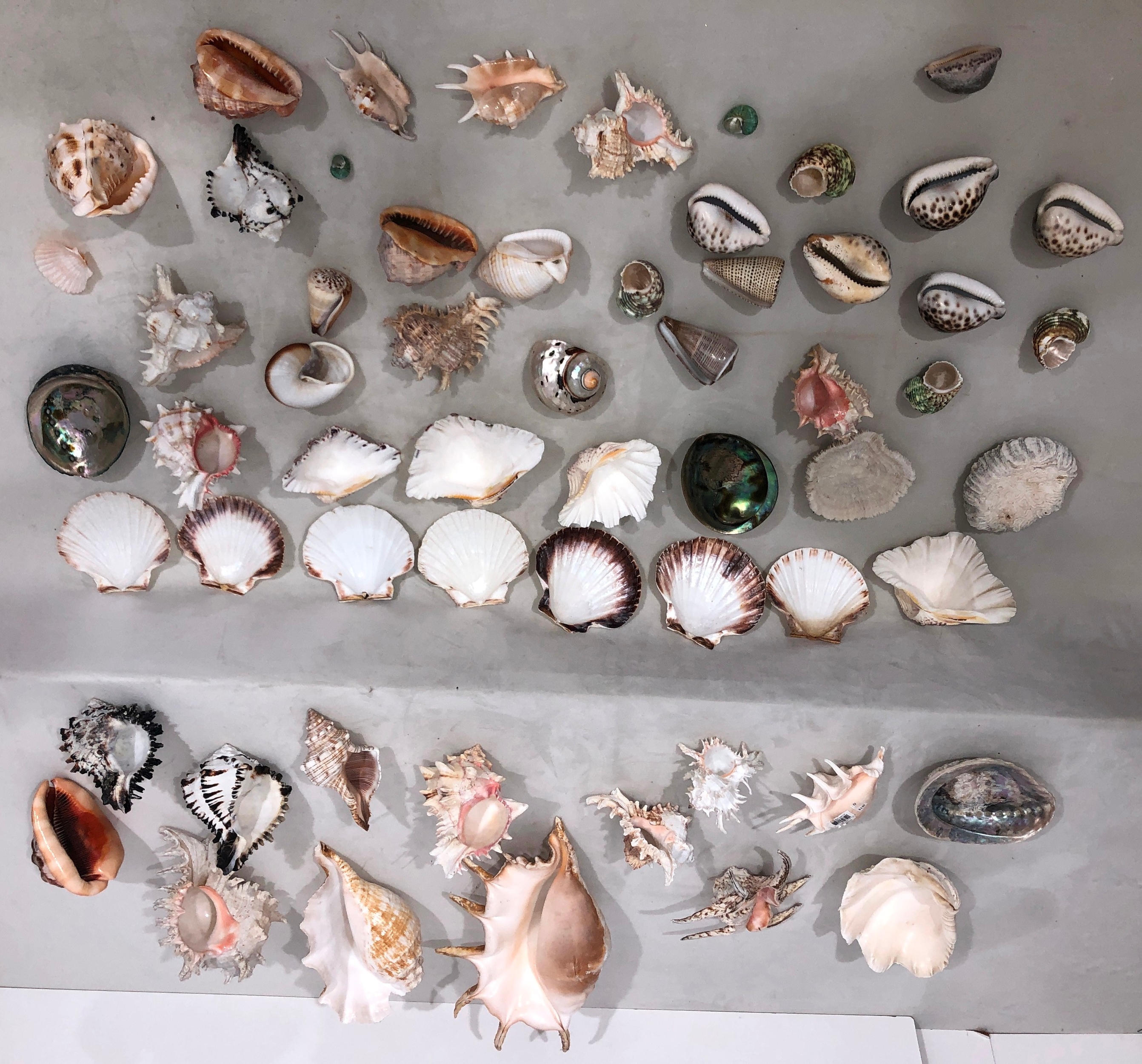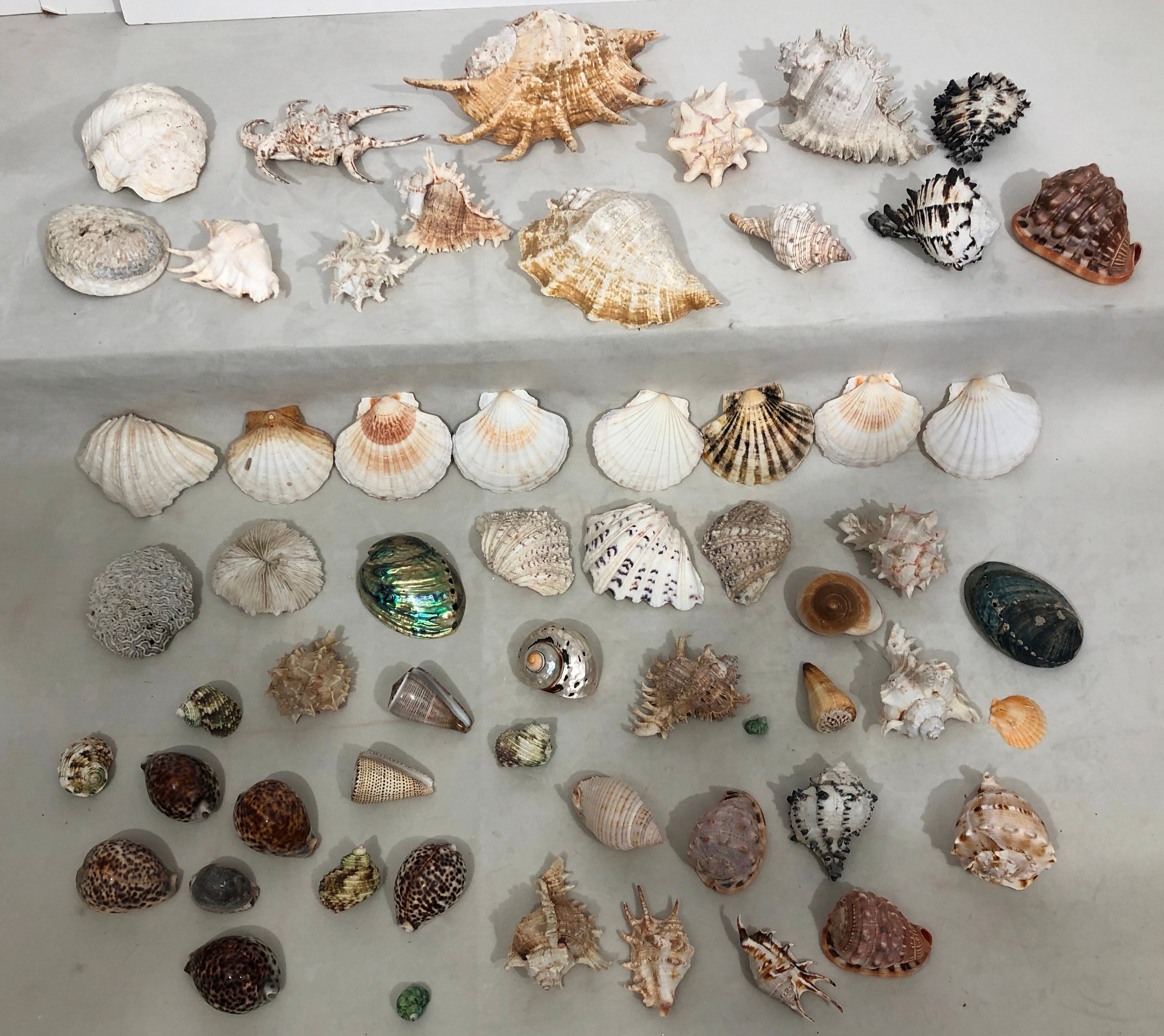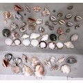 A large quantity of tropical seashells, Tiger Cowrie shells, scallop shells etc.