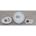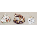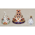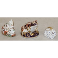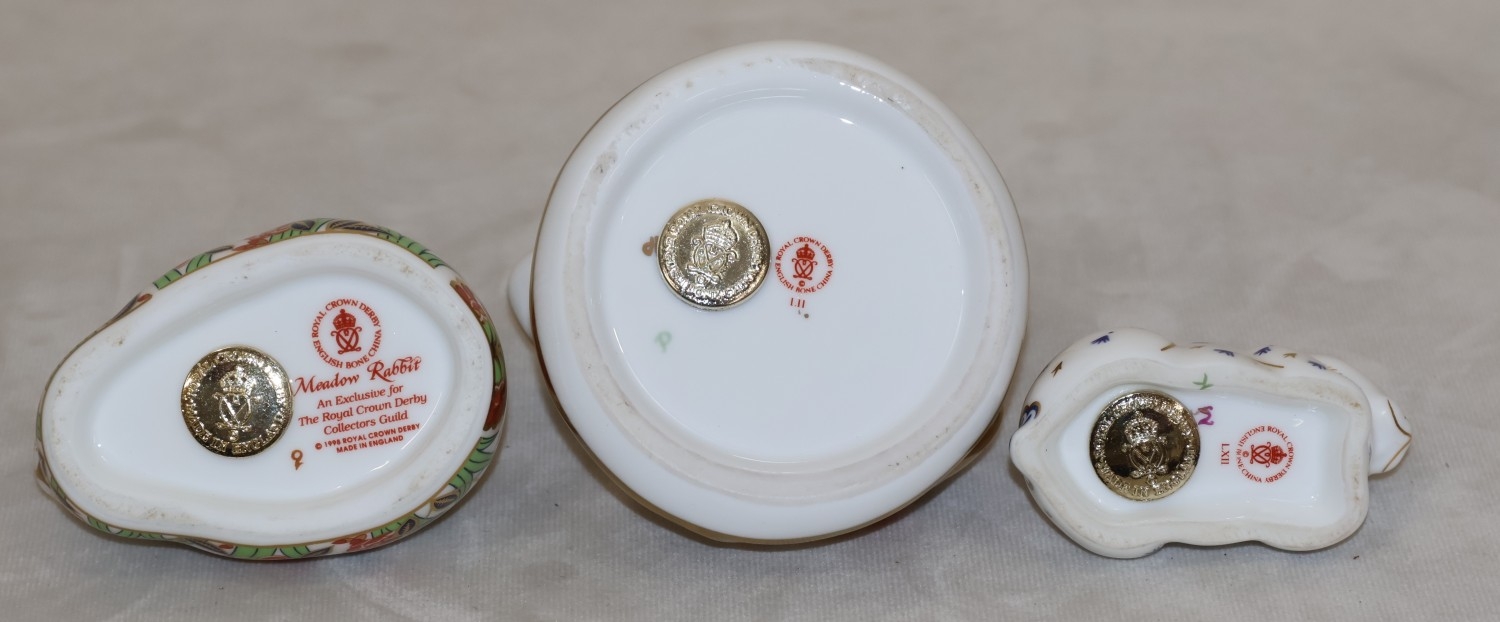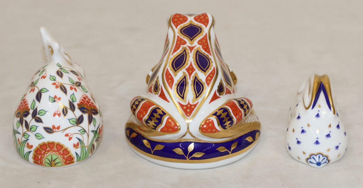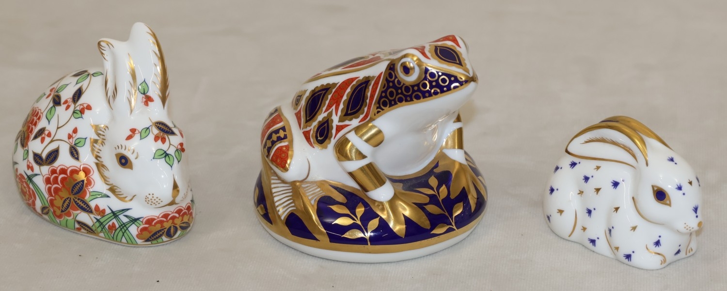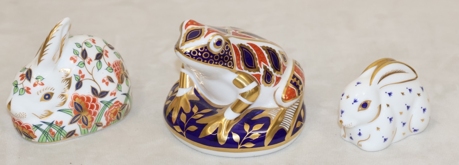 A Royal Crown Derby paperweight "Meadow Rabbit" with gold coloured stopper, 8.5cm long, a smaller Royal Crown Derby paperweight in the form of a rabbit on white, blue and gilt ground and a Royal Doulton Imari pattern paperweight in the form of a frog, 7.5cm high (3)