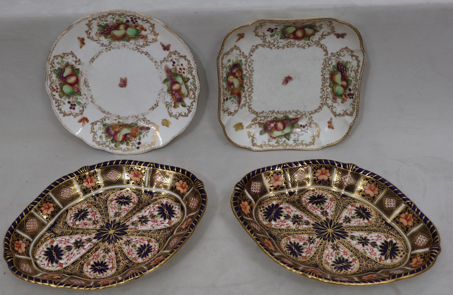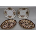 A pair of Royal Crown Derby Imari pattern oval scallop shaped dishes, 29cm wide, a Ford's china square scallop shaped dish with multi-coloured fruit decoration and a similar plate (4)