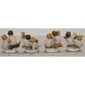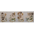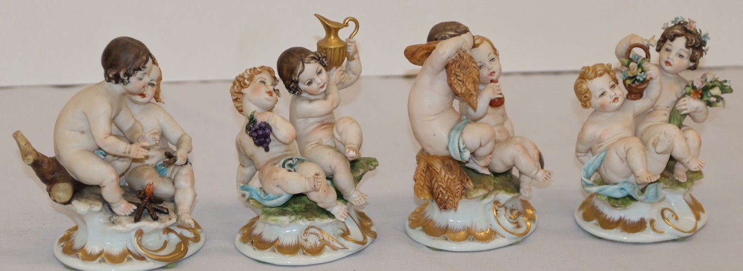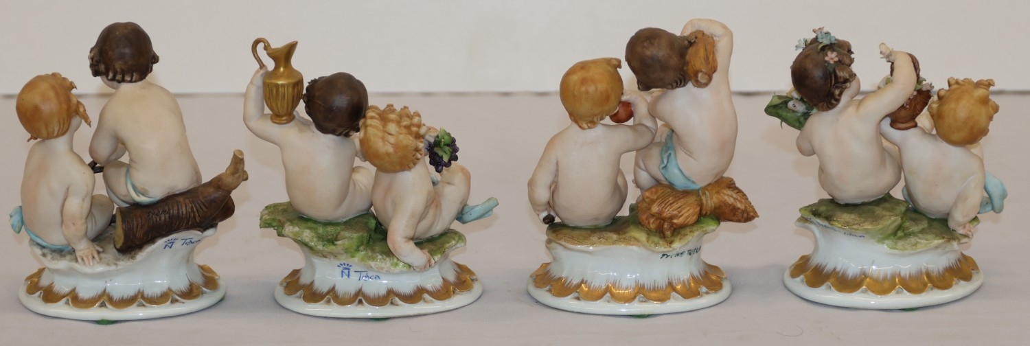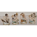 A set of 4 Naples groups of seated Cupids with encrusted floral and grape decoration, 13.5cm high (4)