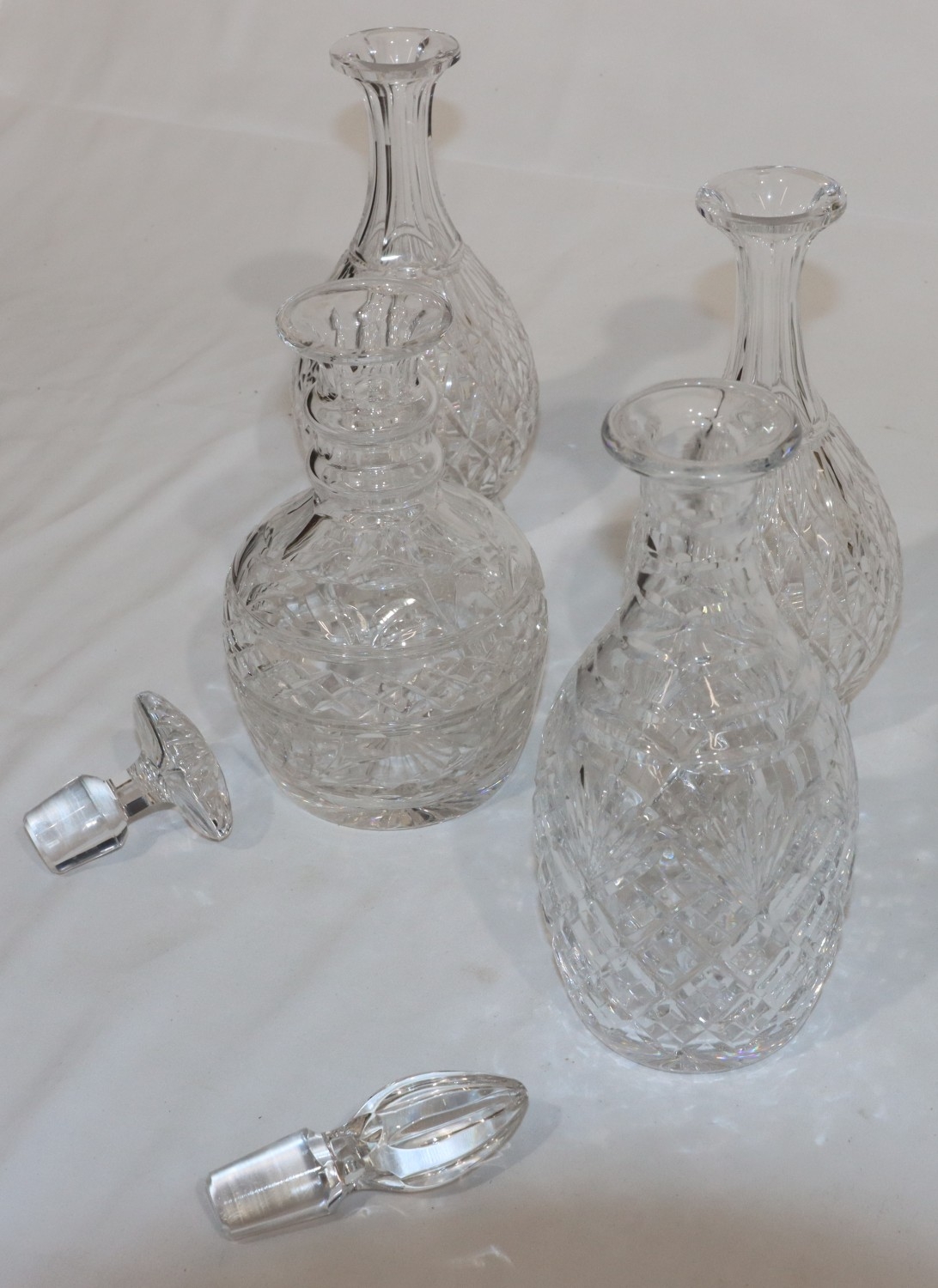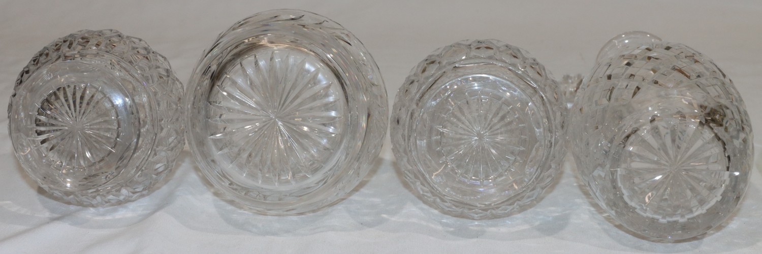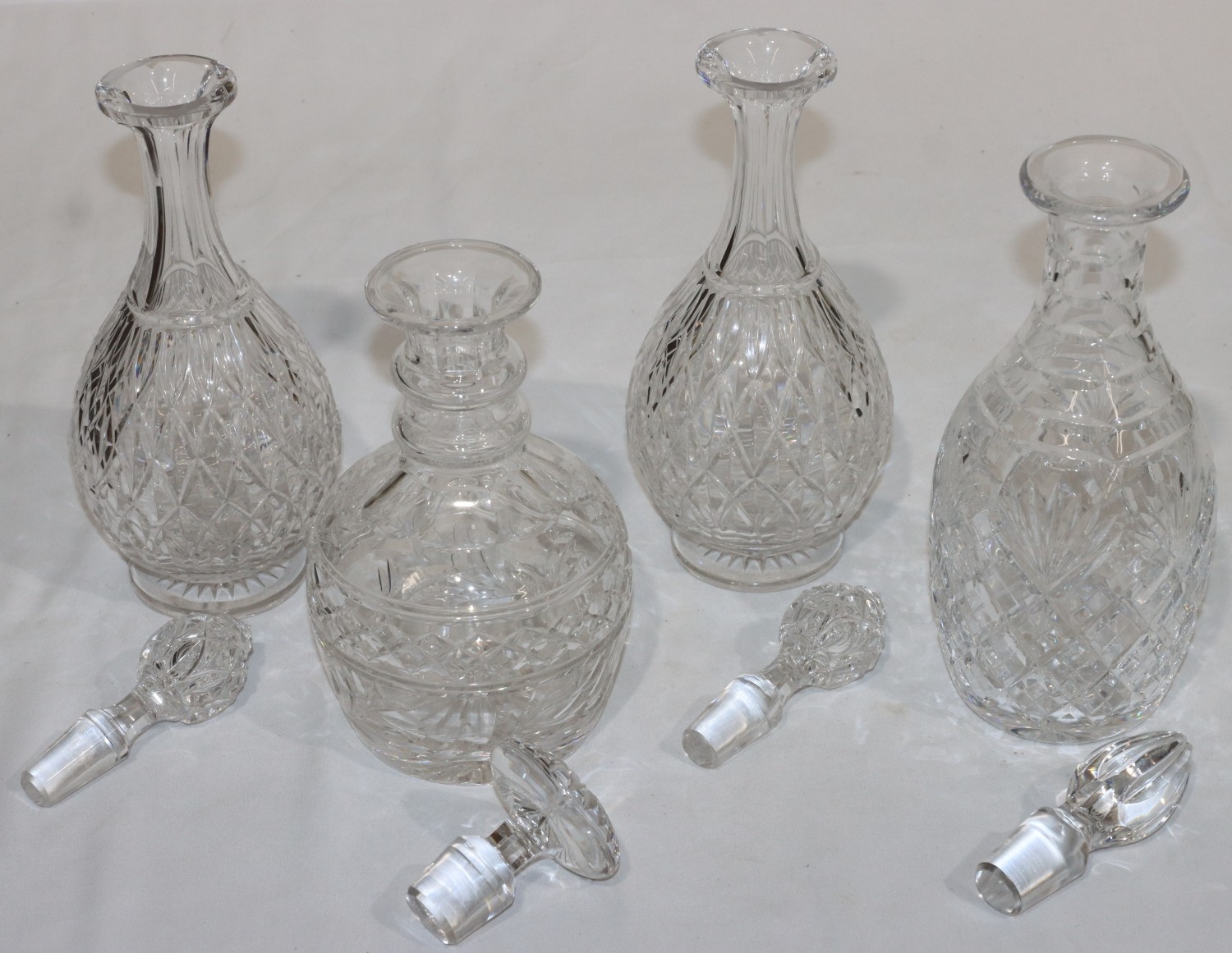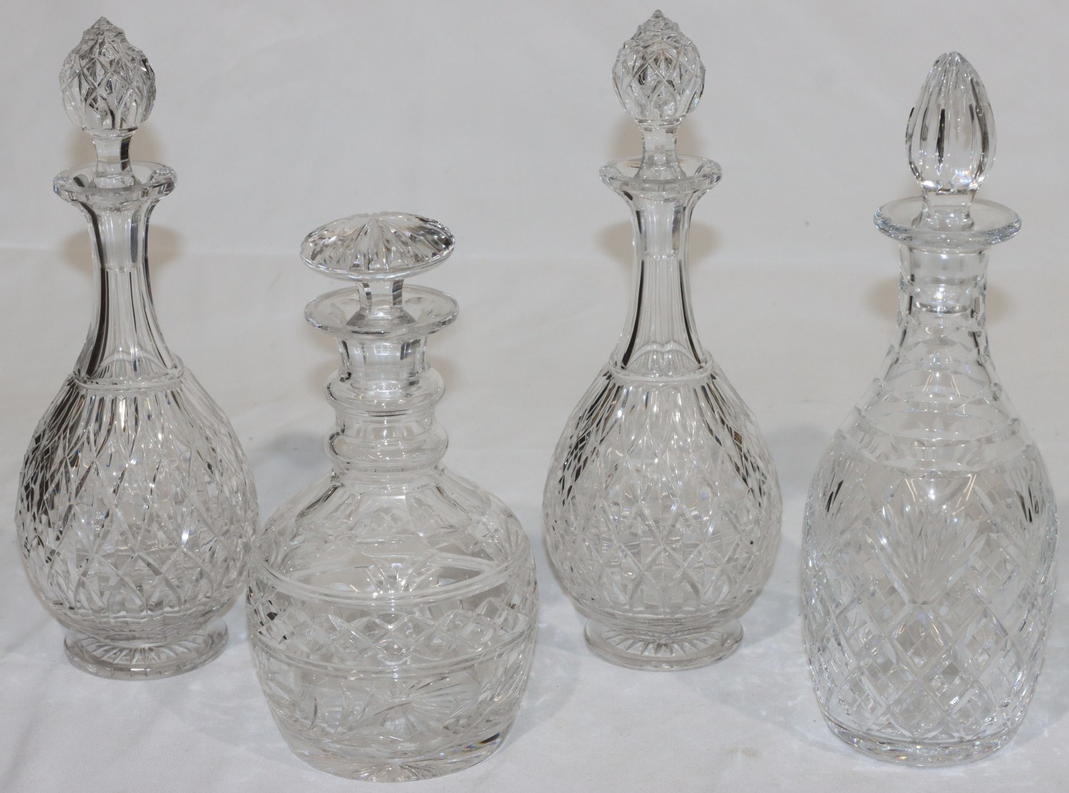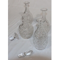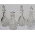 A pair of cut glass round bulbous thin necked decanters with stoppers, 28.5cm high and 2 further heavy cut glass decanters with stoppers (4)