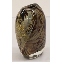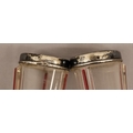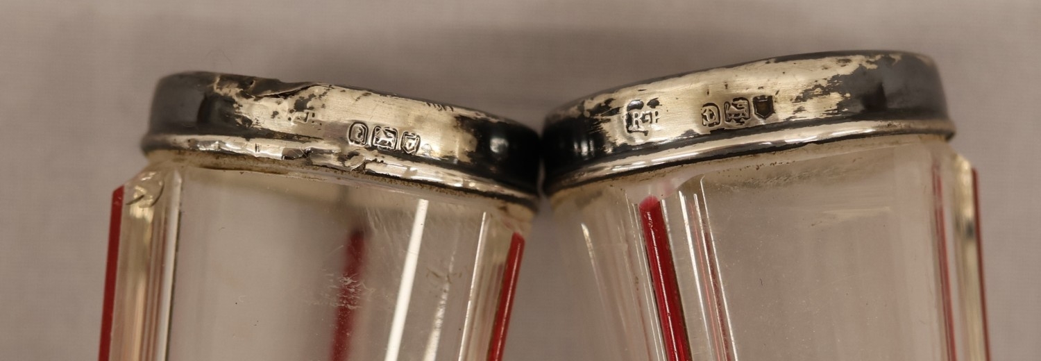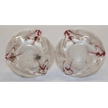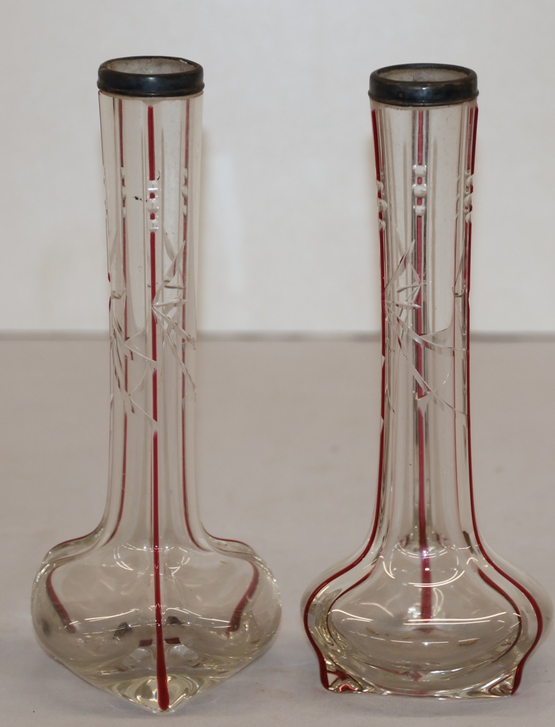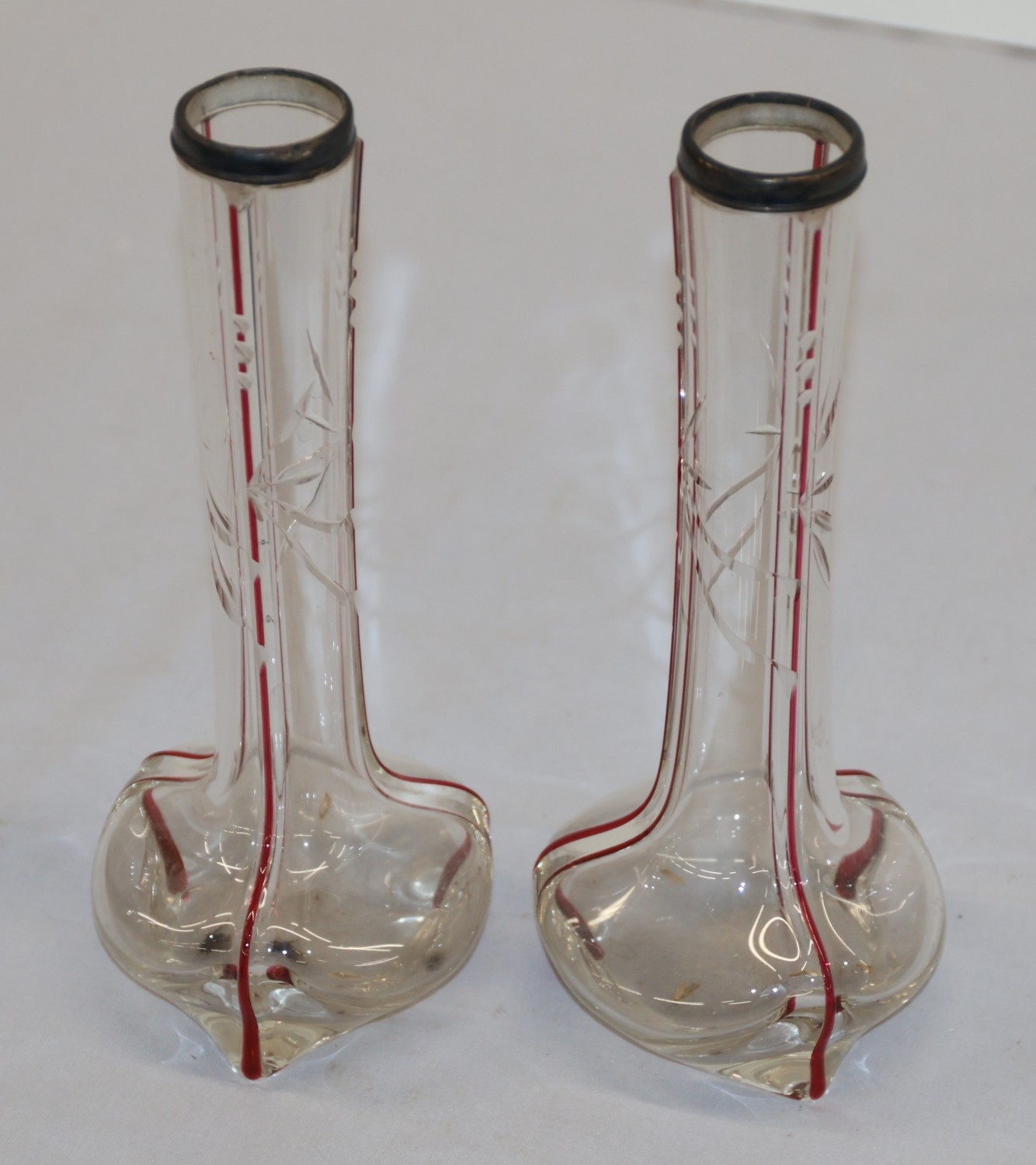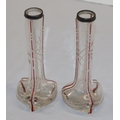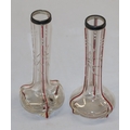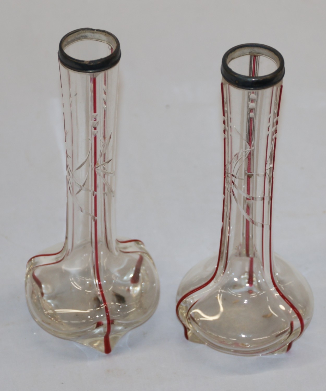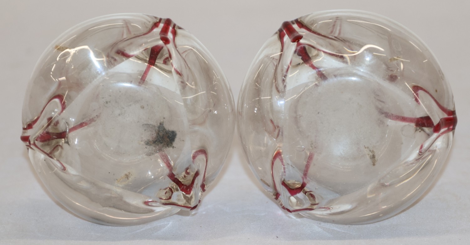 A pair of round bulbous white and red glass spill vases with silver necks, 30.5cm high
