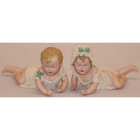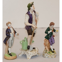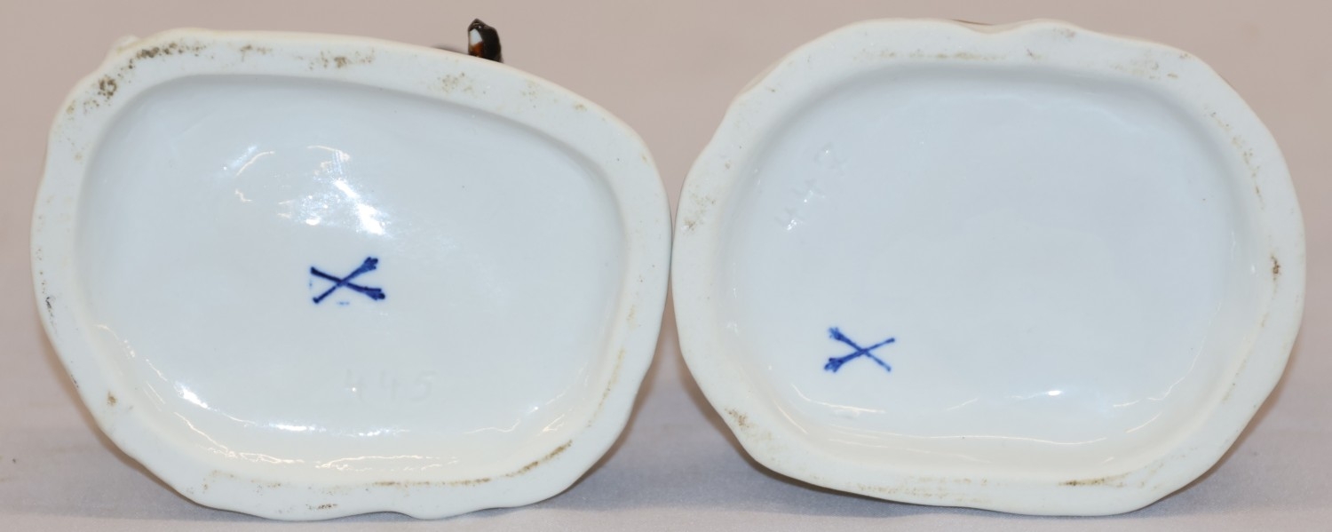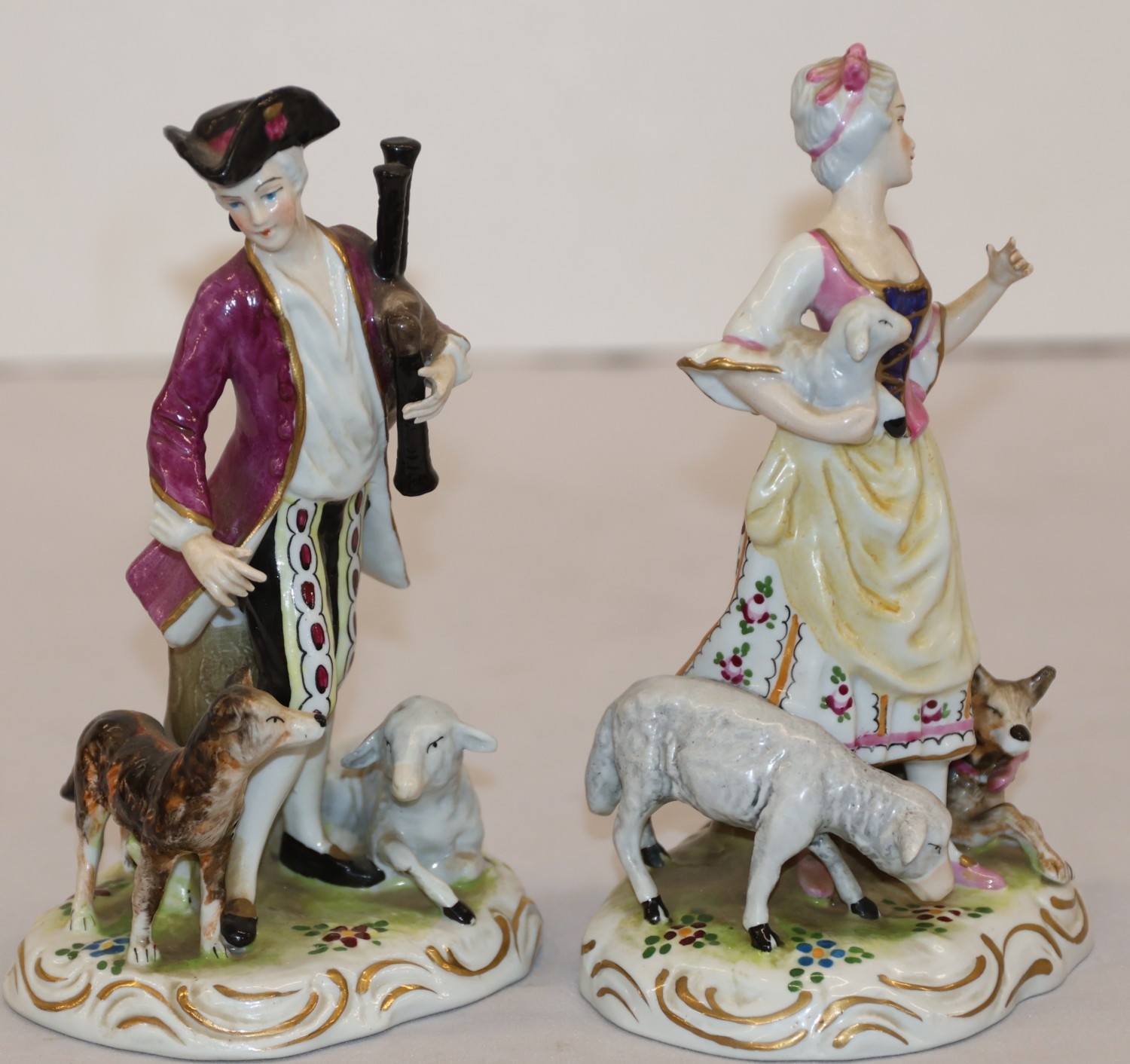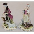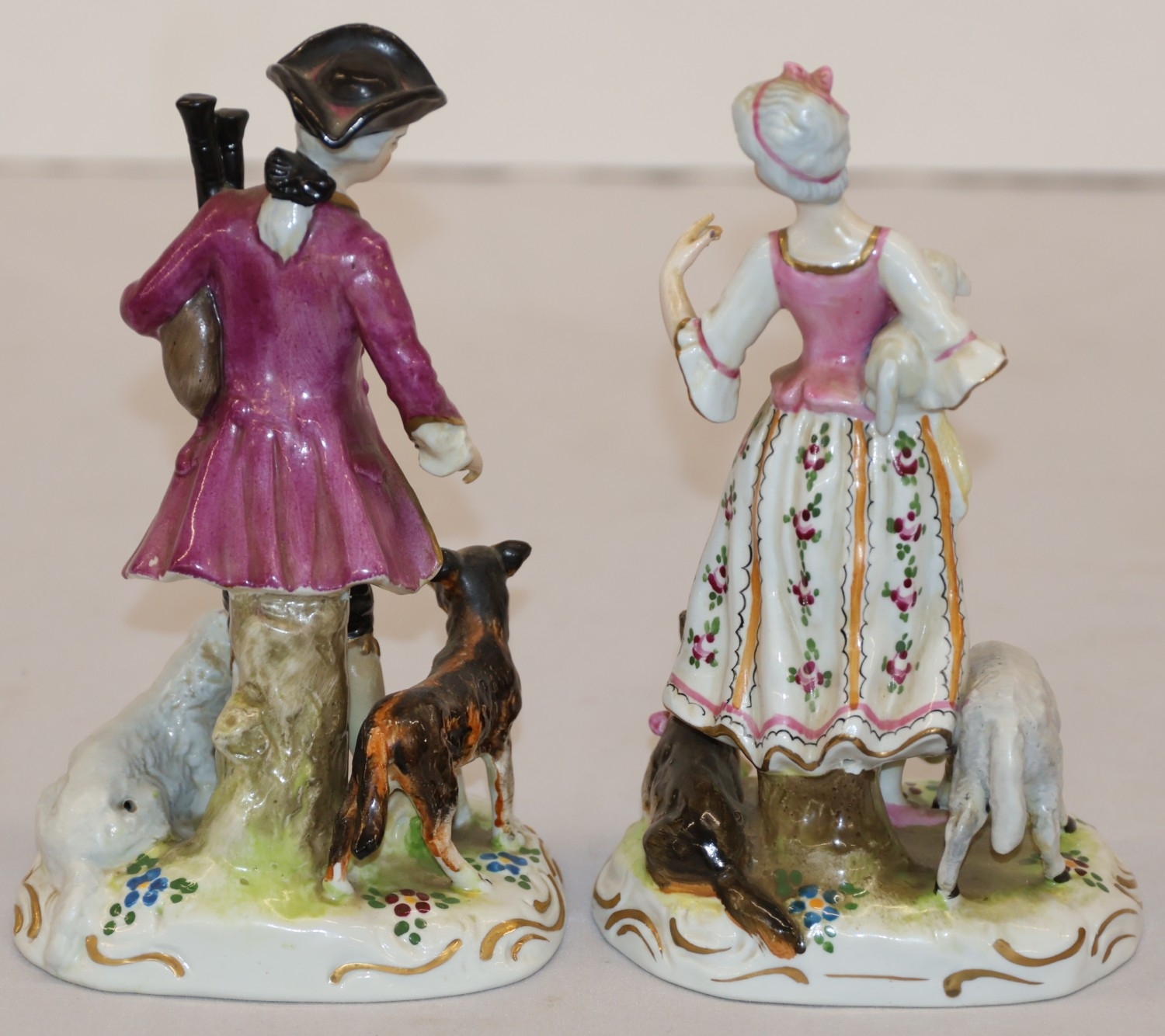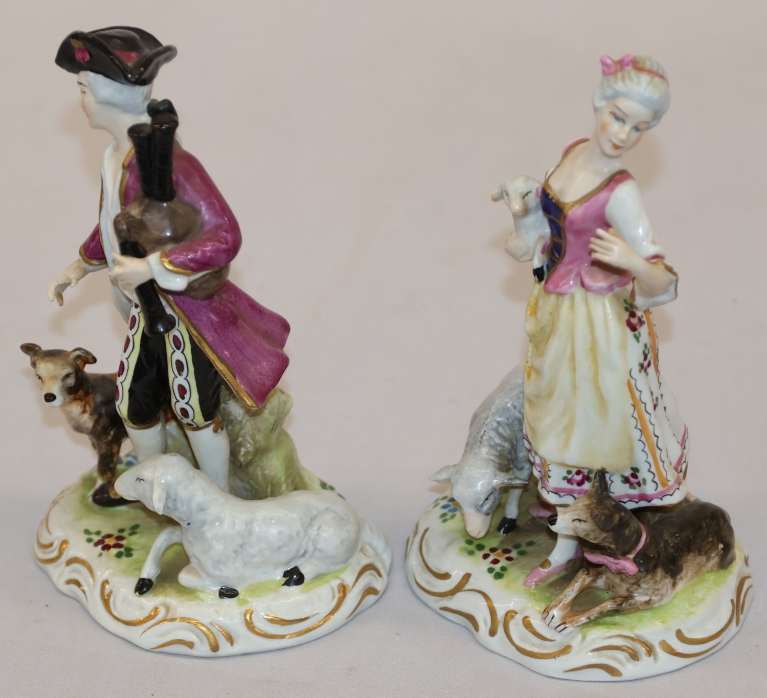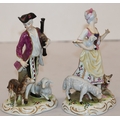 A pair of Continental figures of a lady and gentleman with dog and sheep at their feet, 16.5cm high