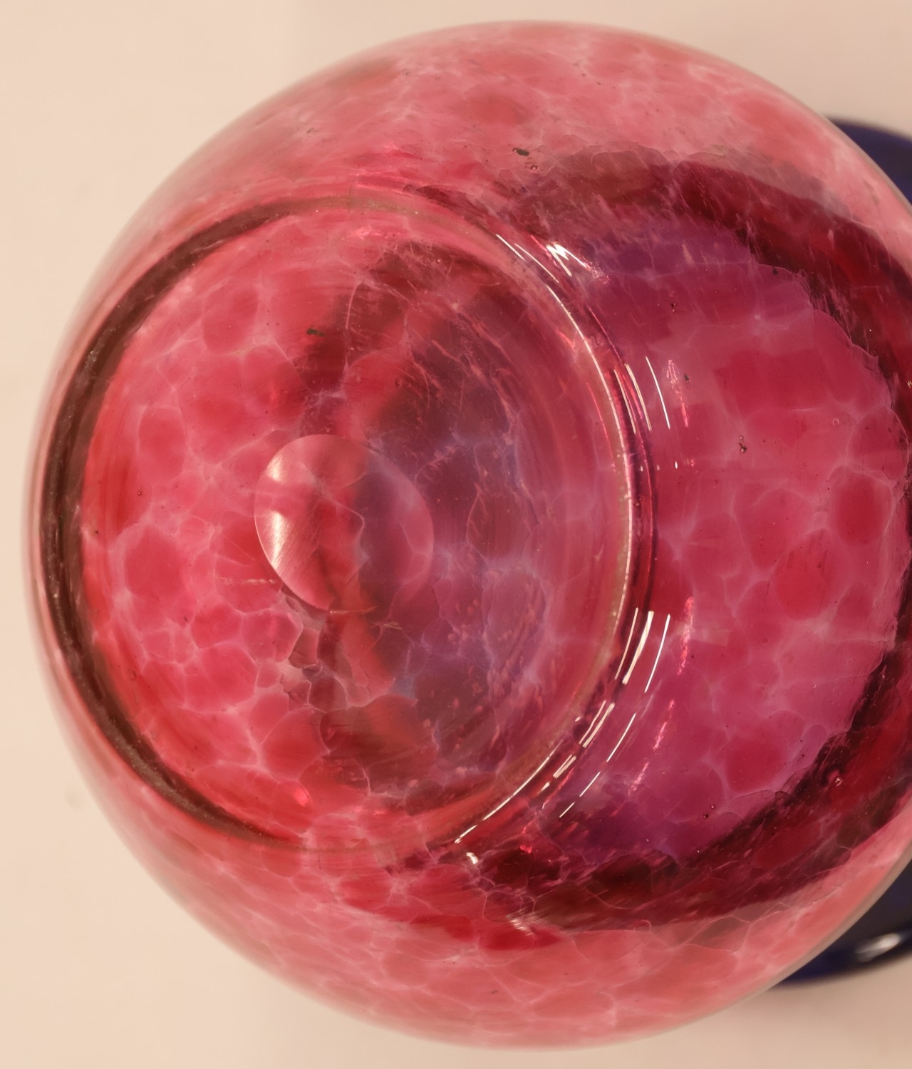 A glass round bulbous trumpet shaped vase on red and blue gr...