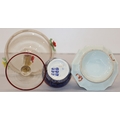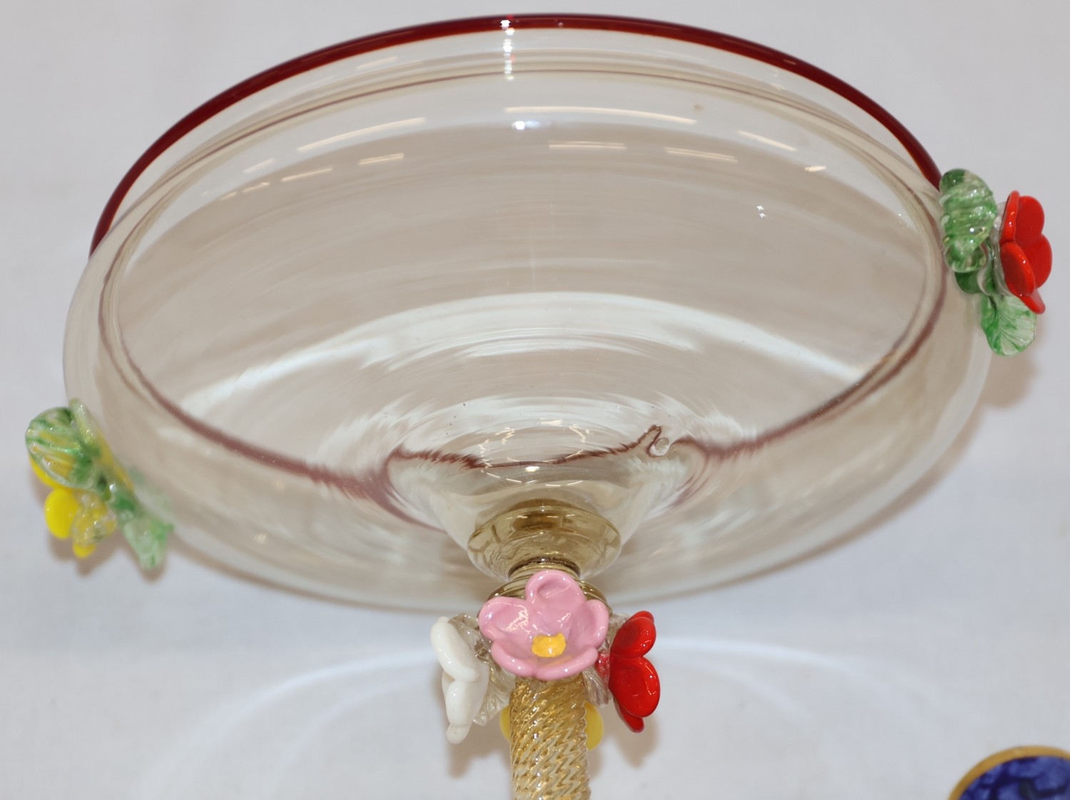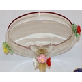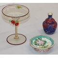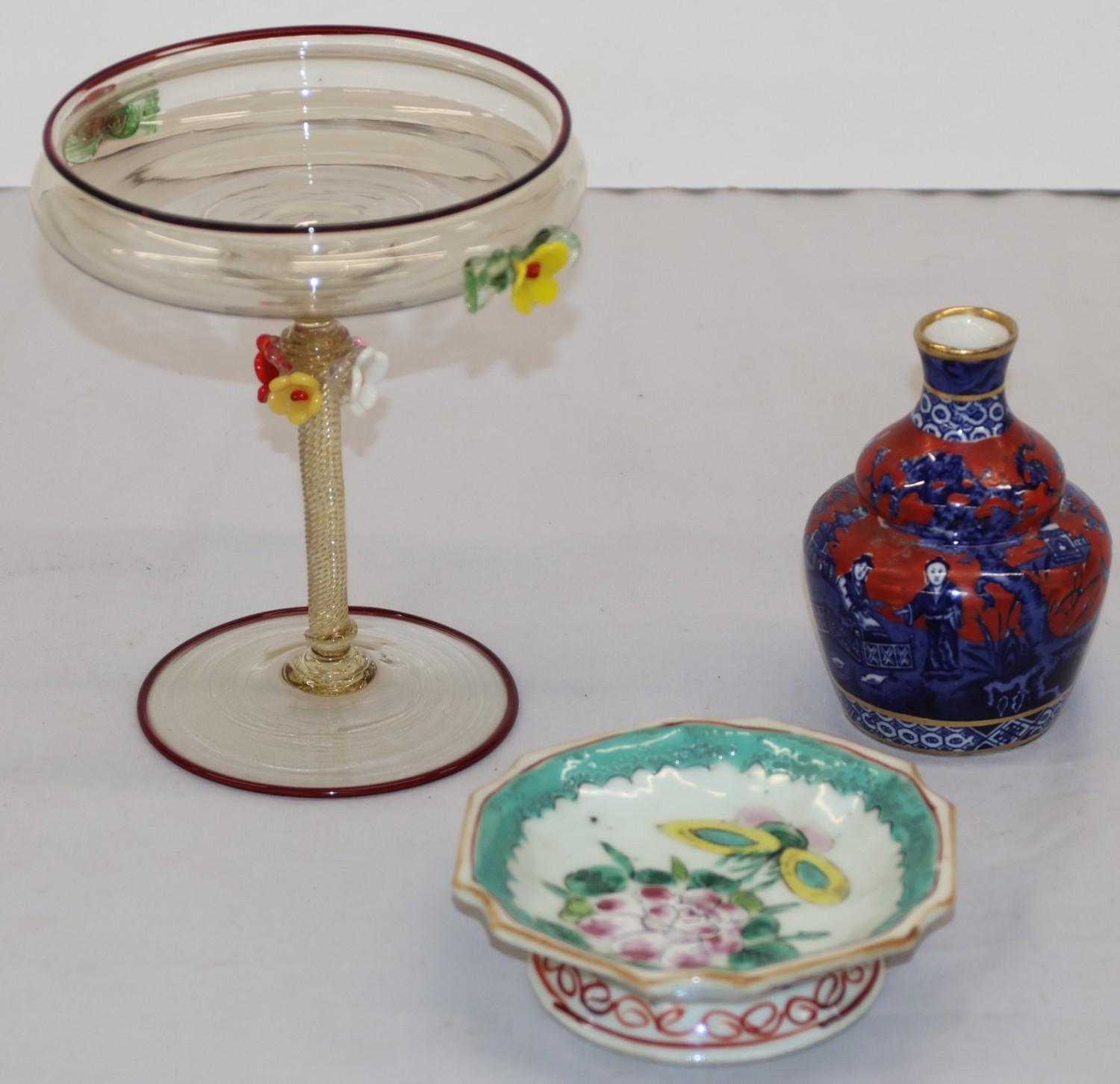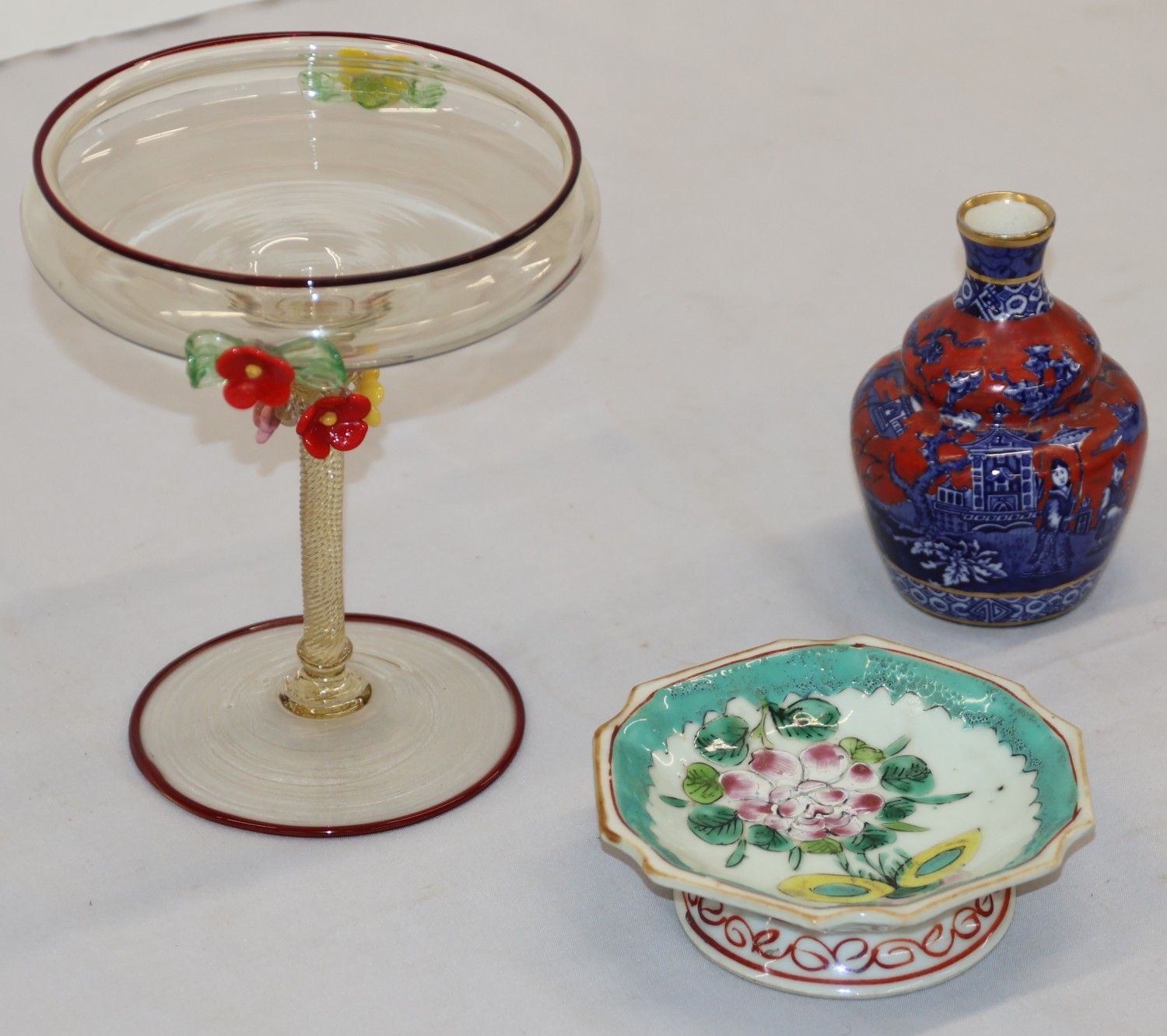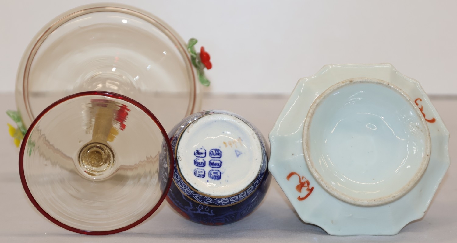 A Foley small round bulbous thin necked vase on red and blue ground with Oriental figure and landscape decoration, 10.5cm high, an Oriental small shallow dish on white and green ground with multi-coloured floral and leaf decoration, 12cm diameter and a glass sweetmeat dish with encrusted floral decoration, twist stem, on round base (1 flower bud head chipped), 16cm high (3)