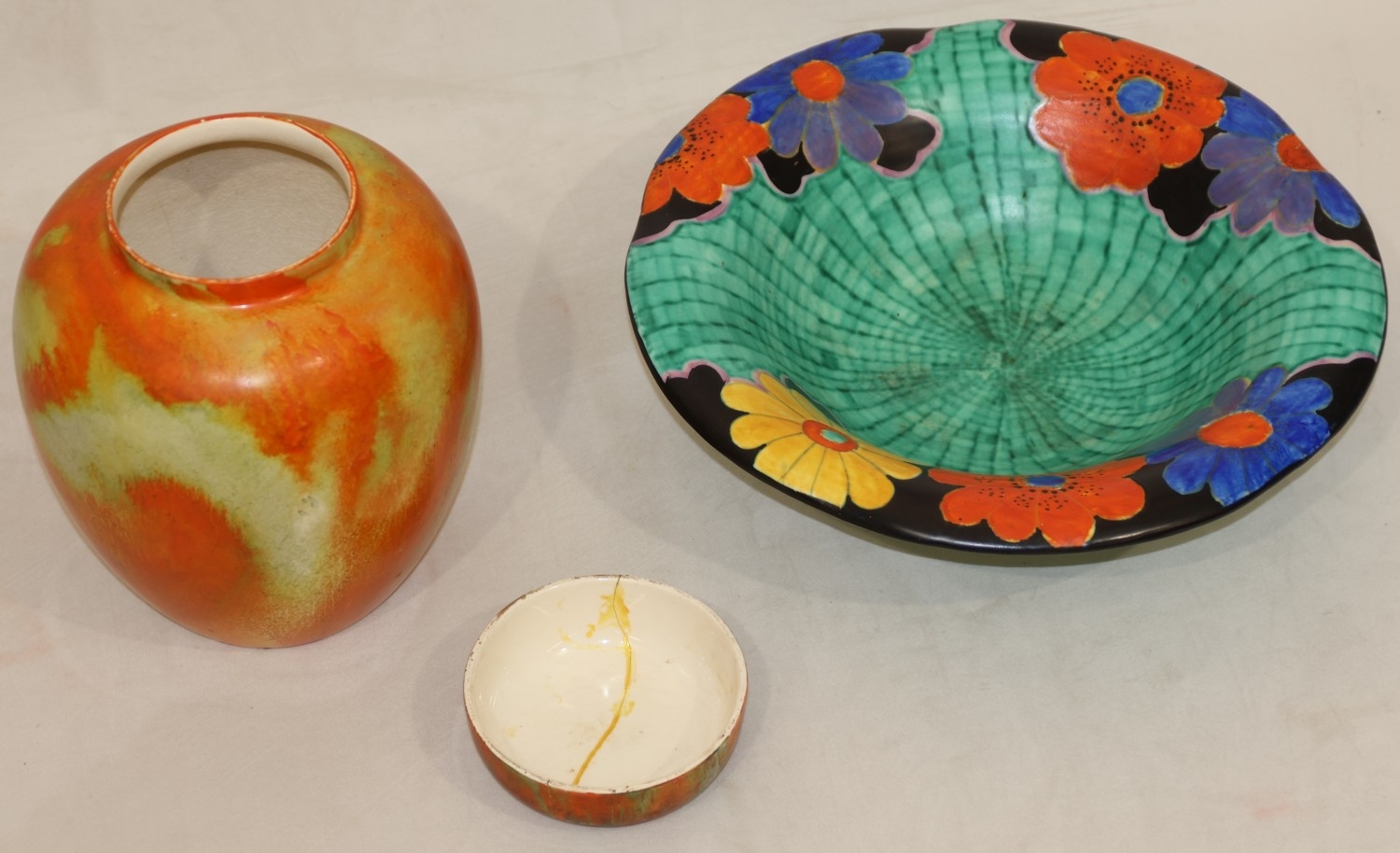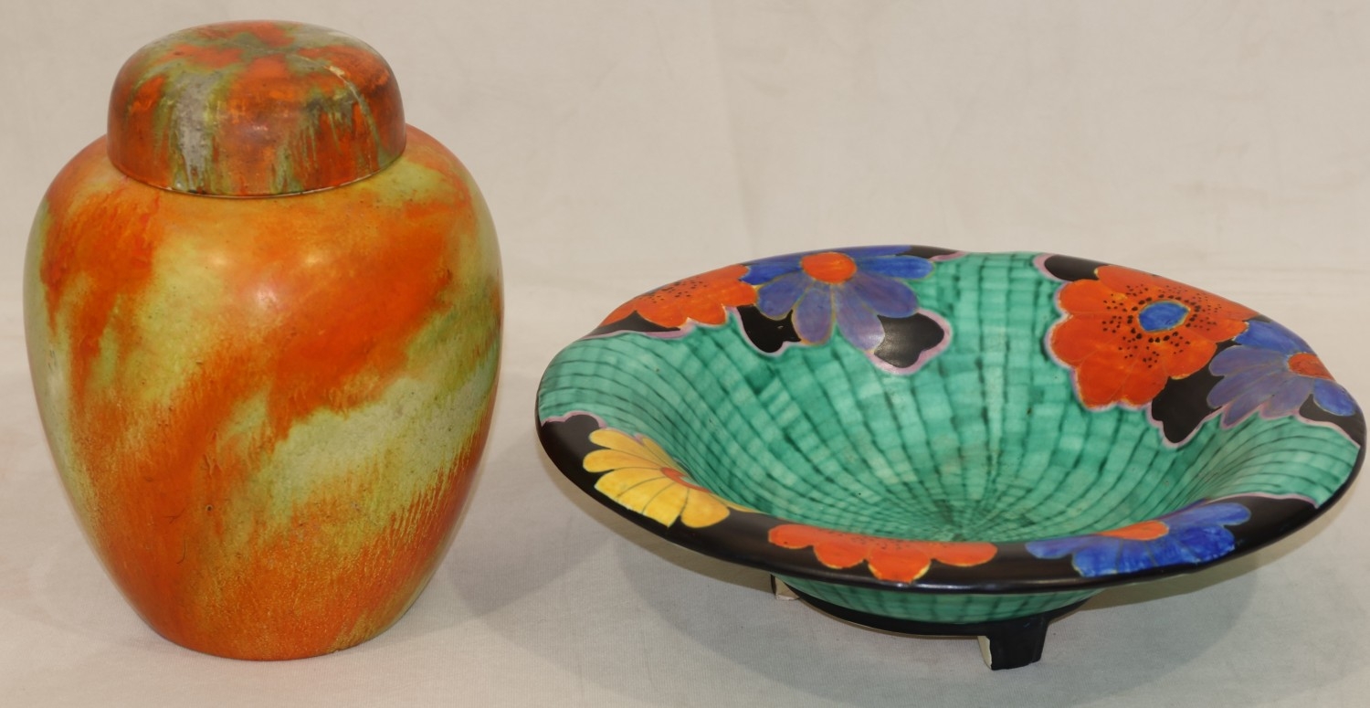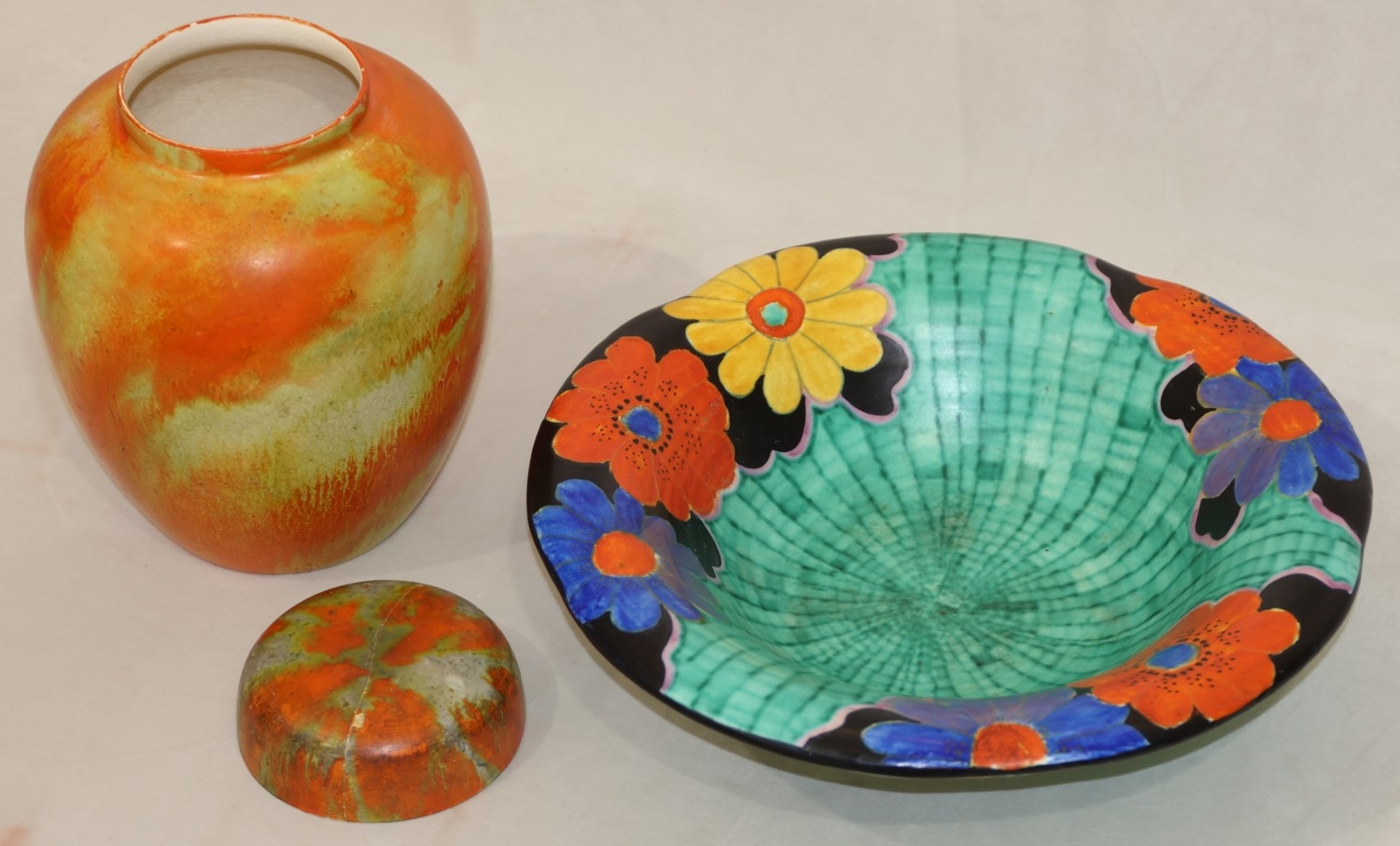 A Crown Devon Art Deco round trumpet shaped shallow fruit bowl on green ground with multi-coloured floral and bud motifs, 32.5cm diameter, 9cm high and a Crown Devon round bulbous shaped ginger jar with cover (cover cracked) on yellow and orange ground, 23cm high (2)