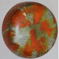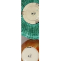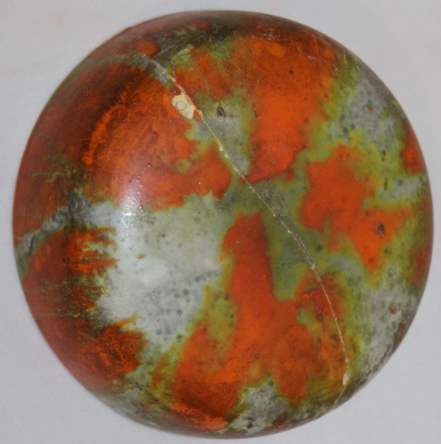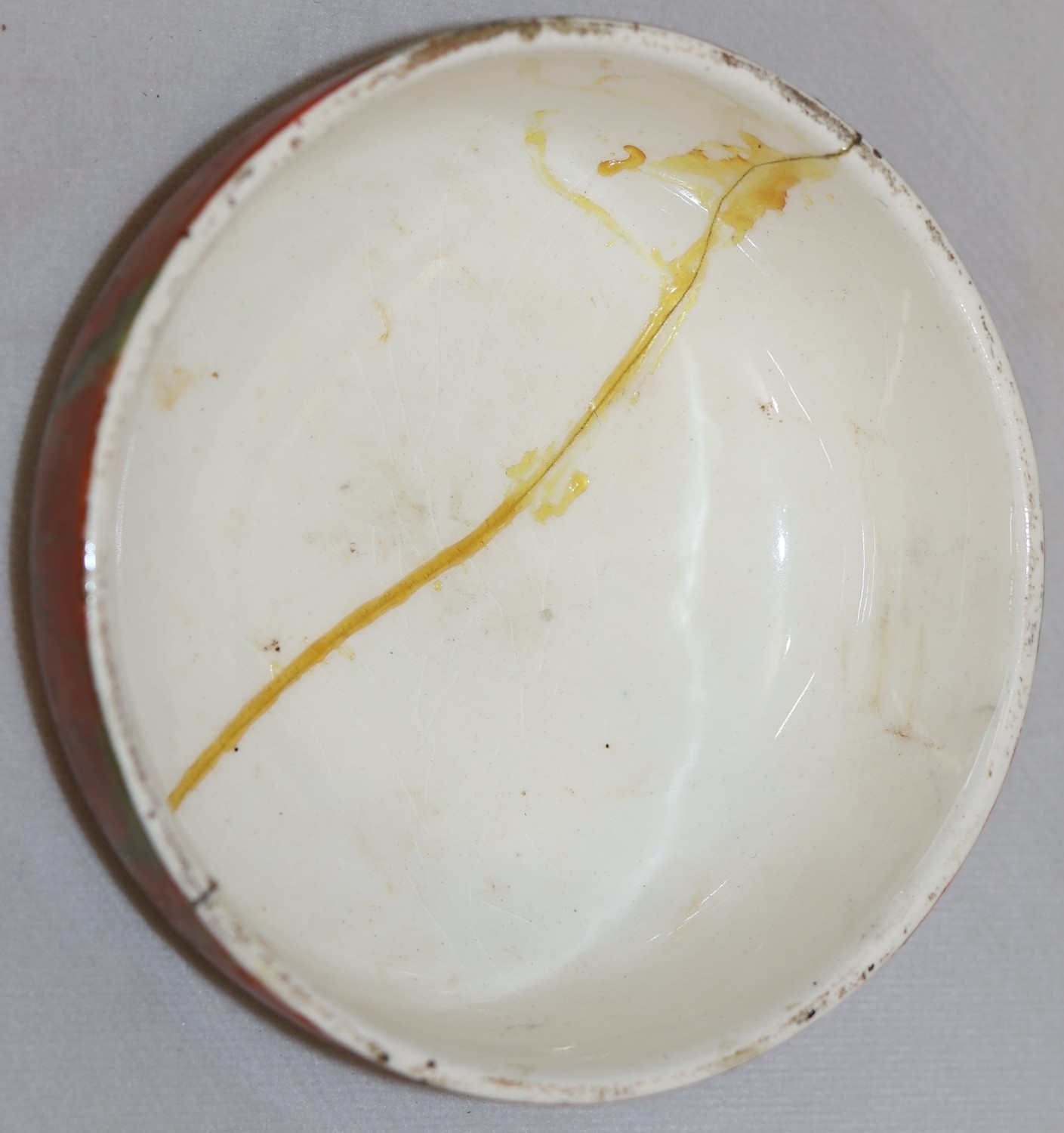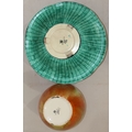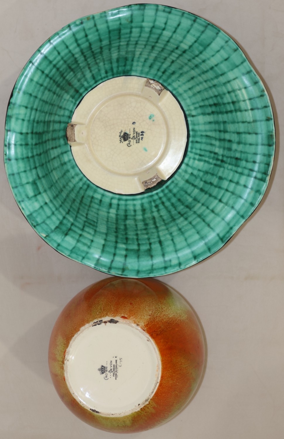 A Crown Devon Art Deco round trumpet shaped shallow fruit bowl on green ground with multi-coloured floral and bud motifs, 32.5cm diameter, 9cm high and a Crown Devon round bulbous shaped ginger jar with cover (cover cracked) on yellow and orange ground, 23cm high (2)