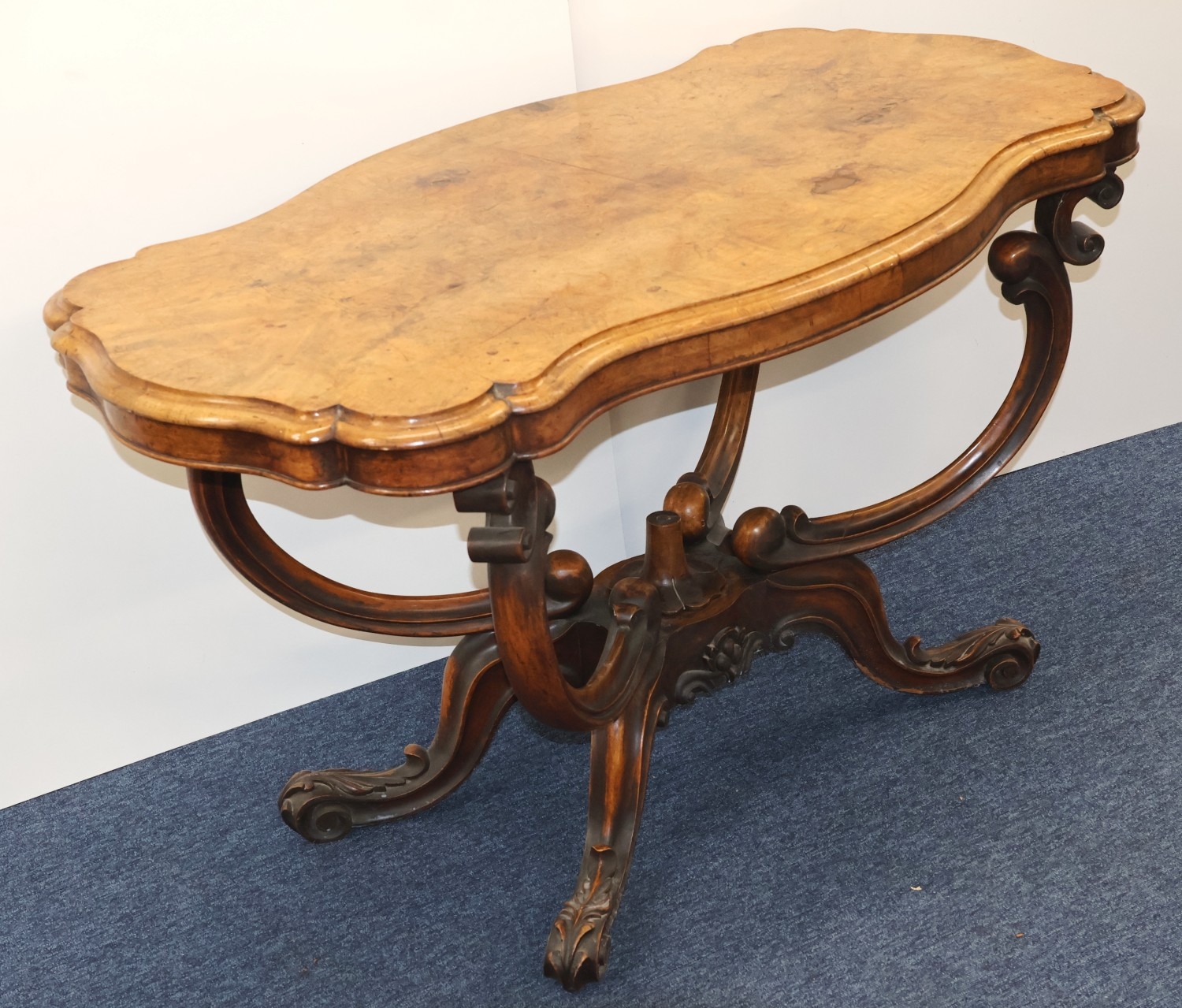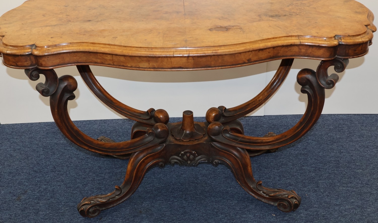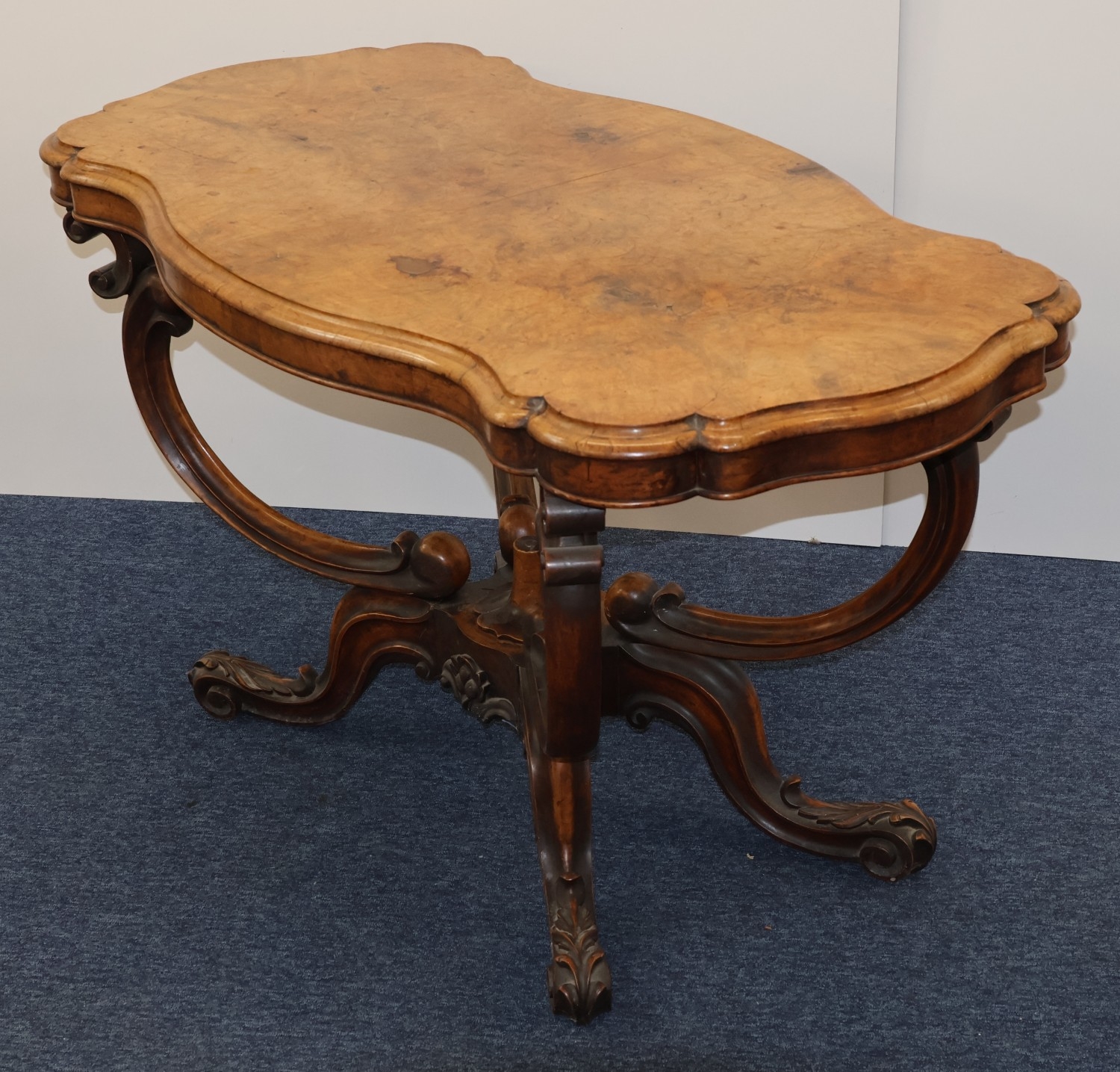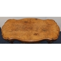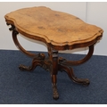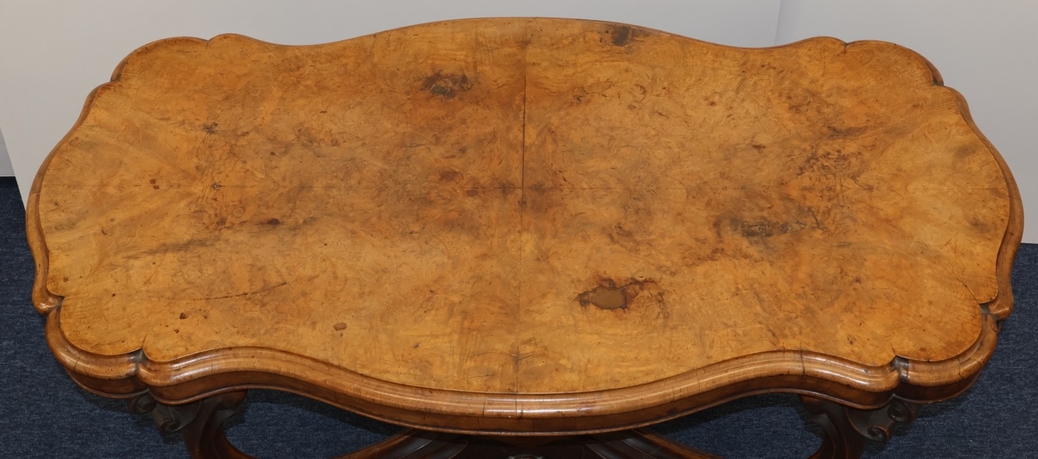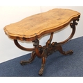 A Victorian burr walnut rectangular scallop shaped centre table with 4 scroll supports on 4 carved cabriole legs, 120cm wide, 64cm deep, 67cm high