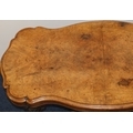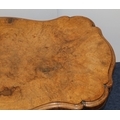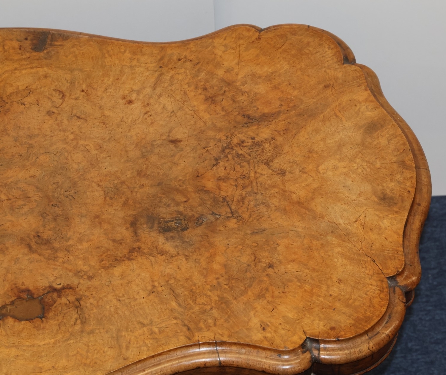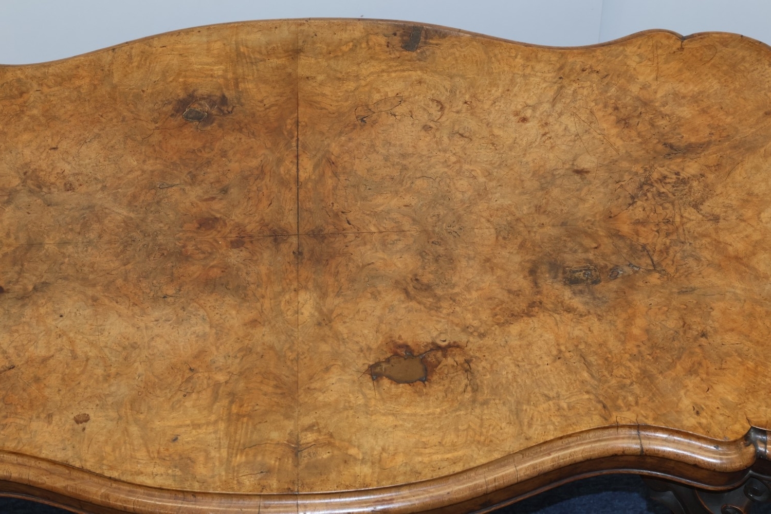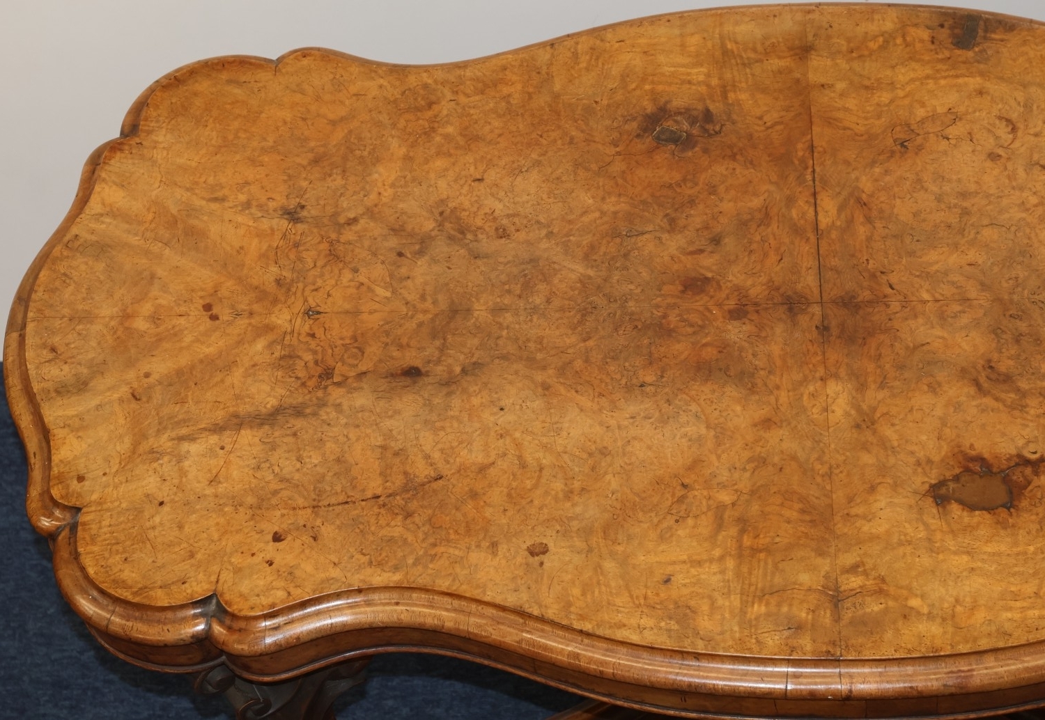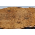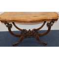 A Victorian burr walnut rectangular scallop shaped centre table with 4 scroll supports on 4 carved cabriole legs, 120cm wide, 64cm deep, 67cm high