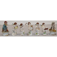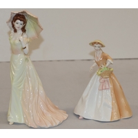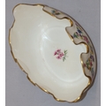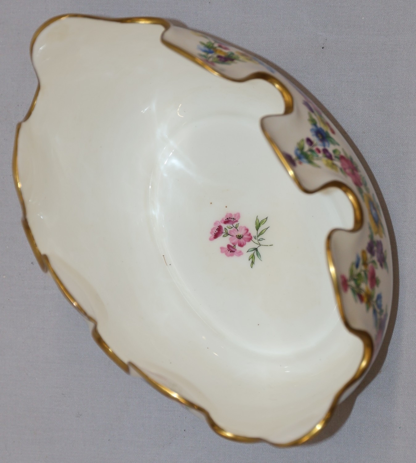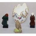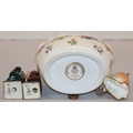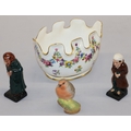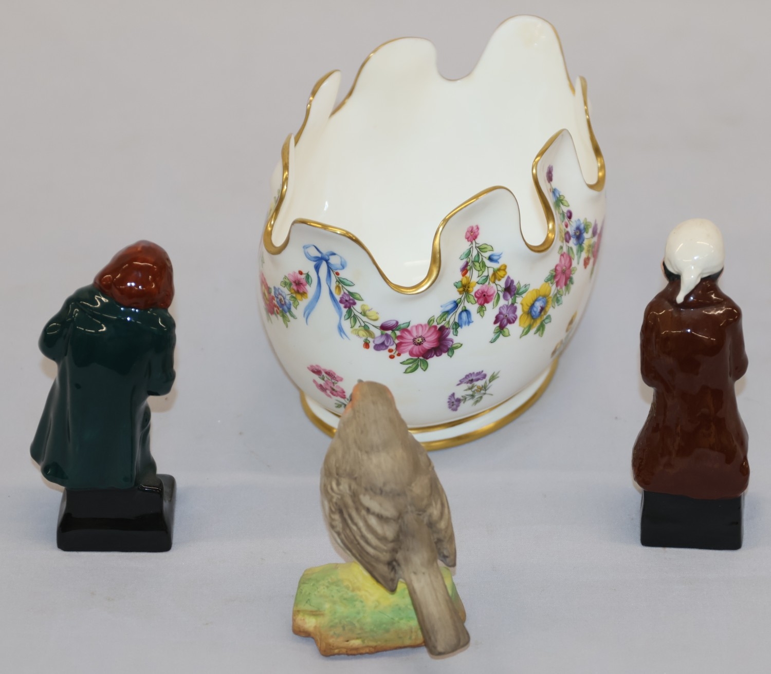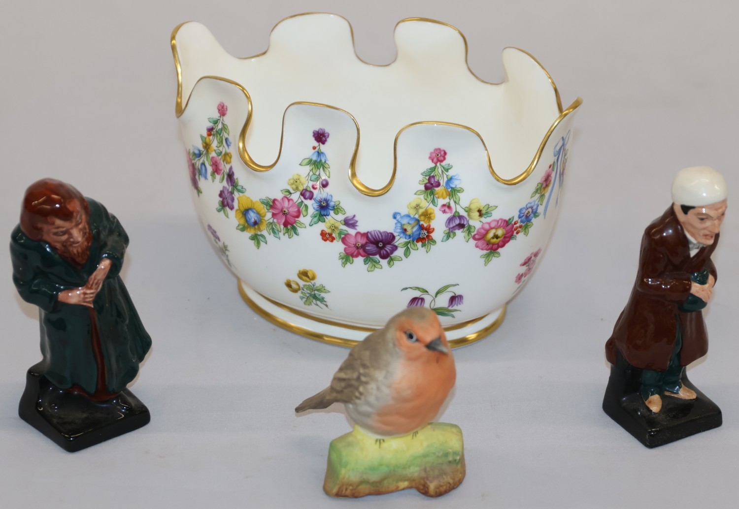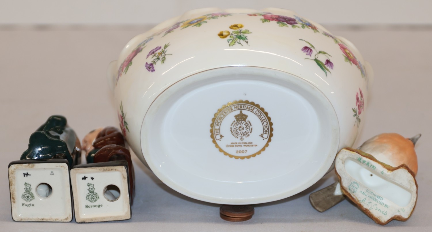 A Royal Worcester oblong bowl with scallop shaped rim and multi-coloured floral and swag decoration, 18cm wide, 2 Royal Doulton small character figures "Scrooge" and "Fagin" and a Crown Staffordshire figure of a perched robin (4)