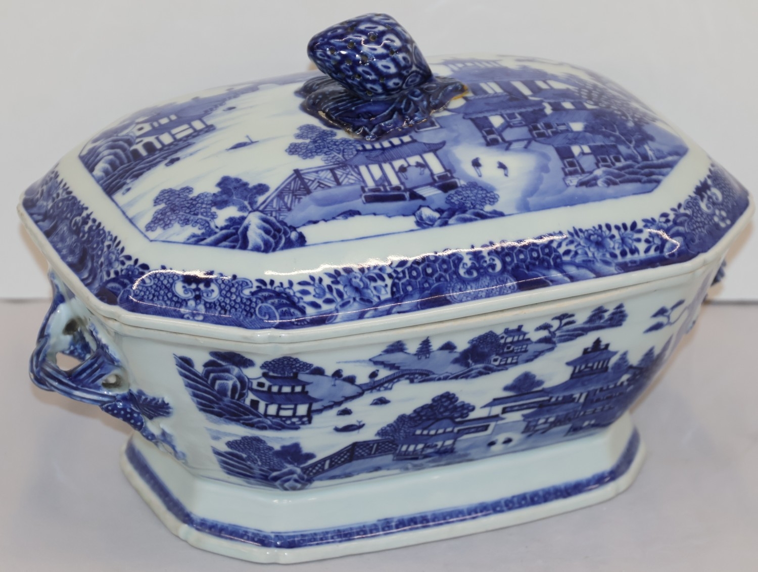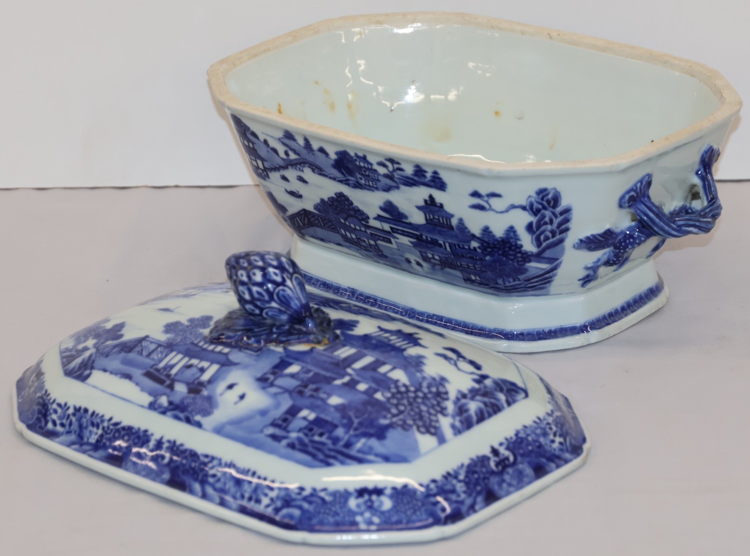 The tureen and lid are in good condition. 1 small crack to inner rim of lid. Finial restored.