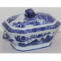 A blue and white rectangular 2-handled lidded tureen with figure, river landscape and building decoration, 33cm wide