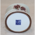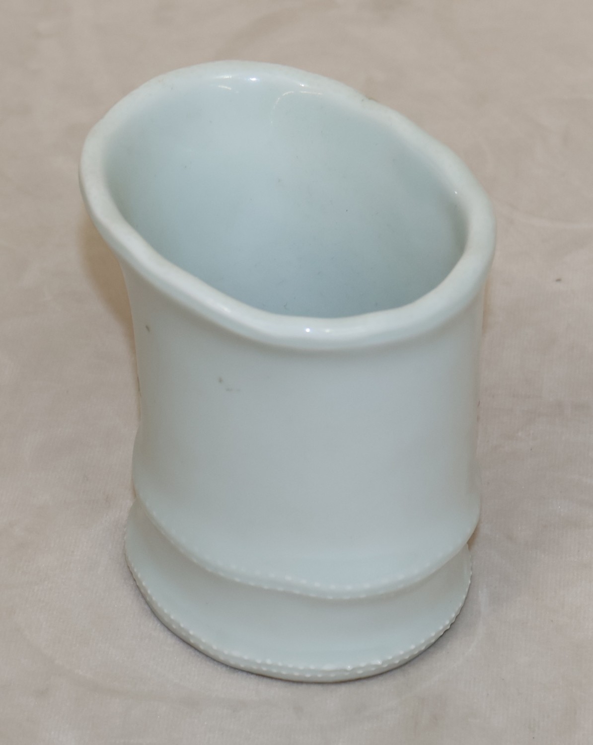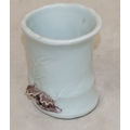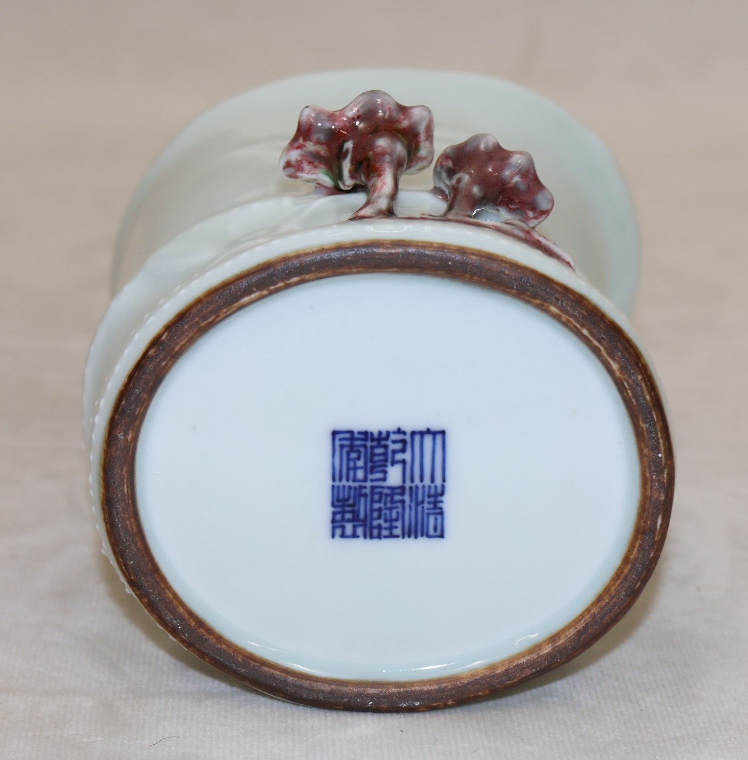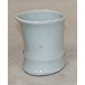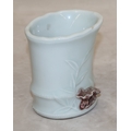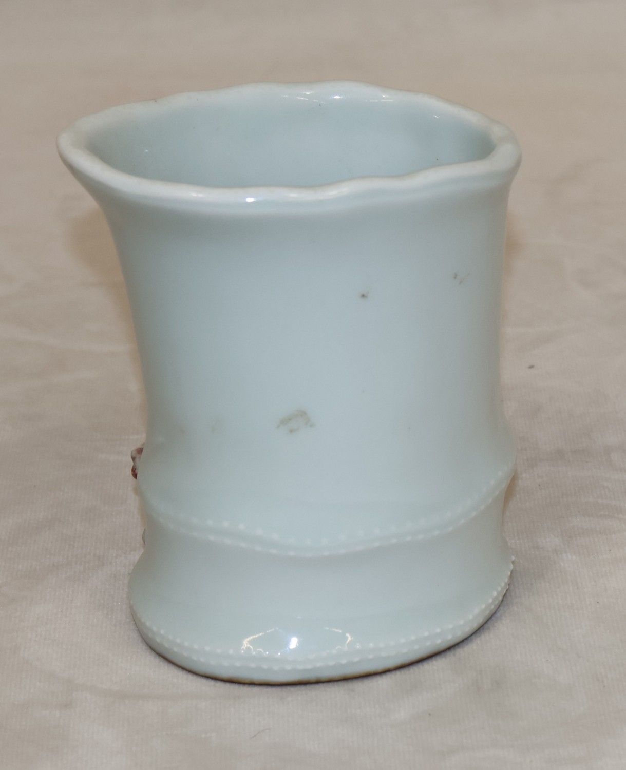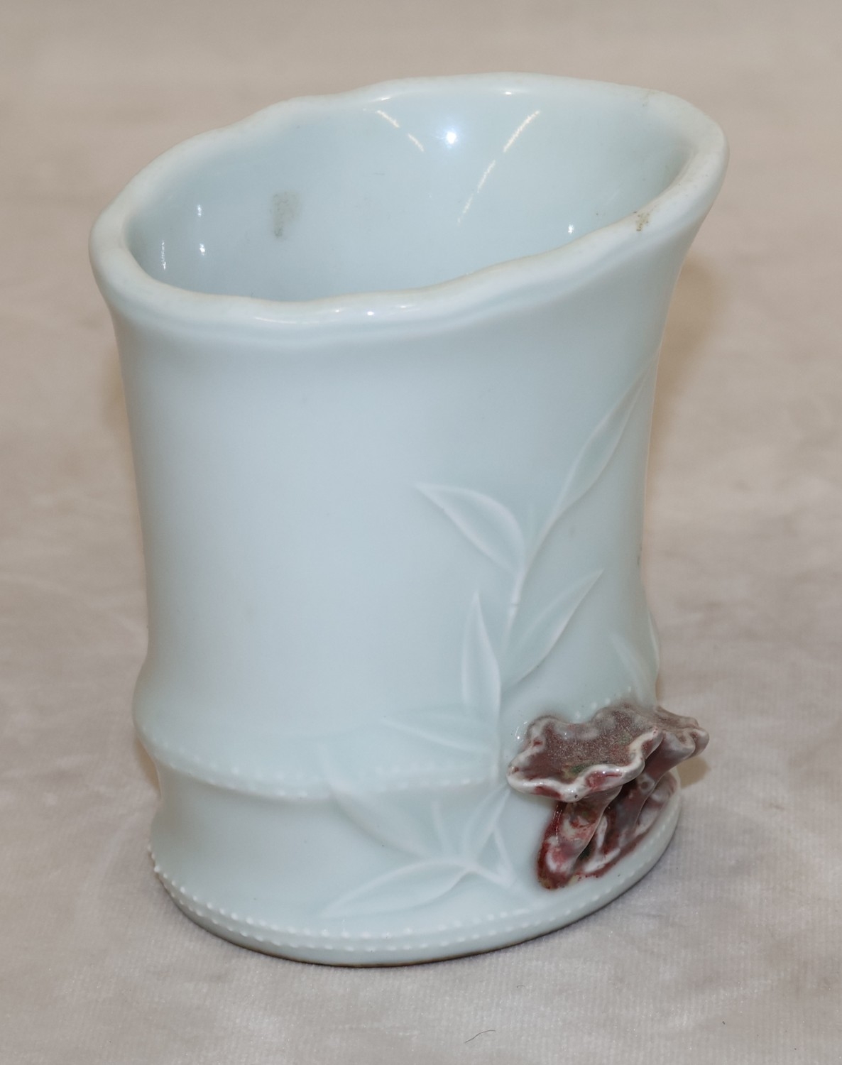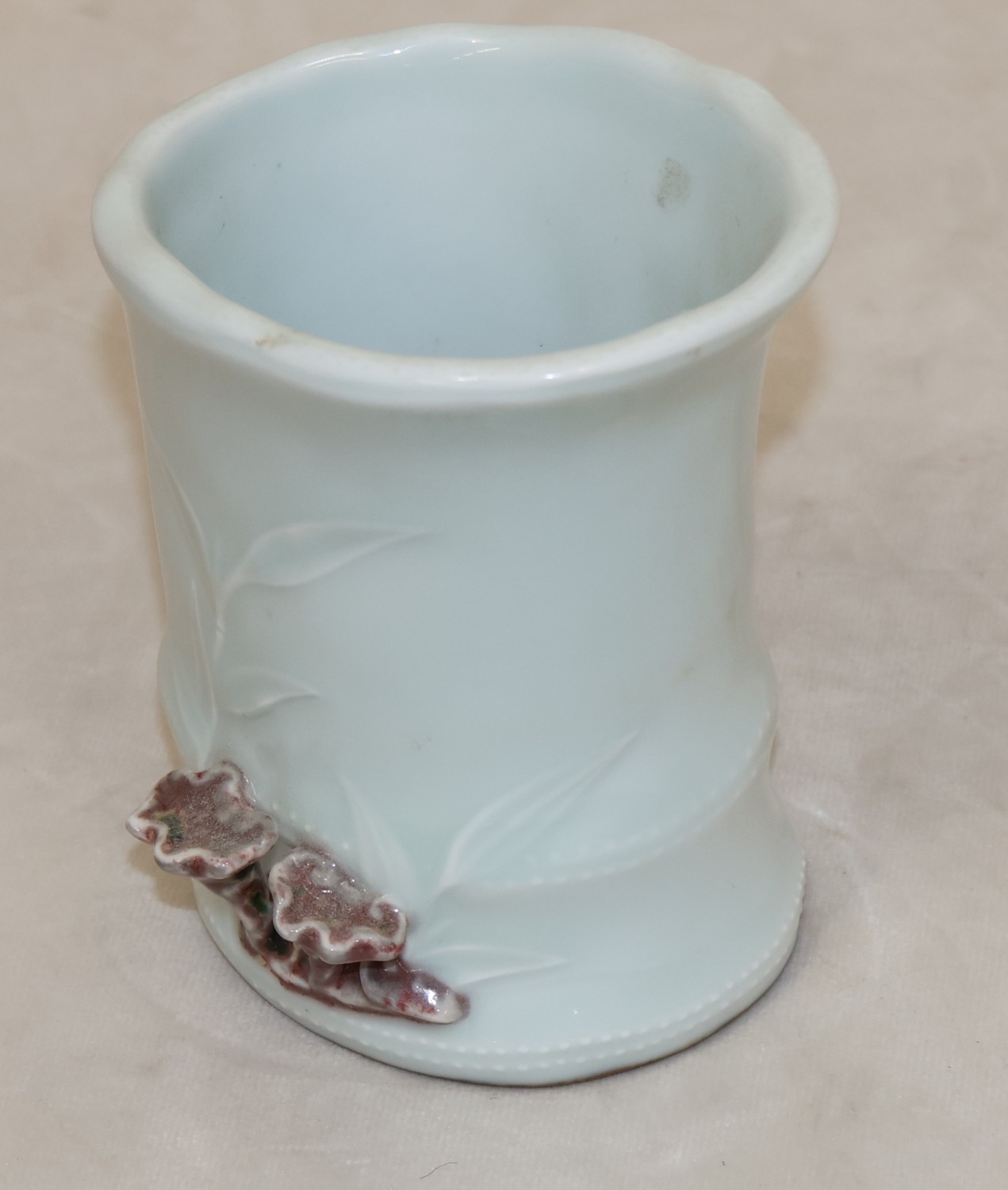 A Chinese Celadon style brush pot in the form of bamboo with raised mushroom motifs, 11.5cm high