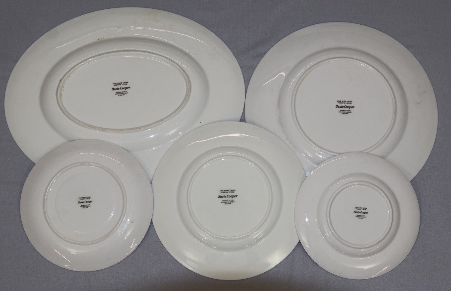 A Wedgwood Susie Cooper style service on white ground with leaf and scroll rim, comprising of oval meat plate, gravy boat and saucer, pair of round lidded tureens (1 lid missing), 6 dinner plates, 6 dessert plates, 6 side plates (23)
