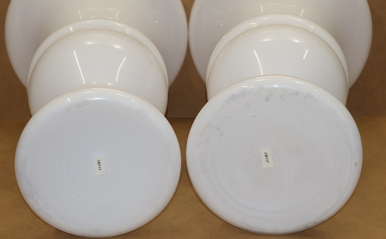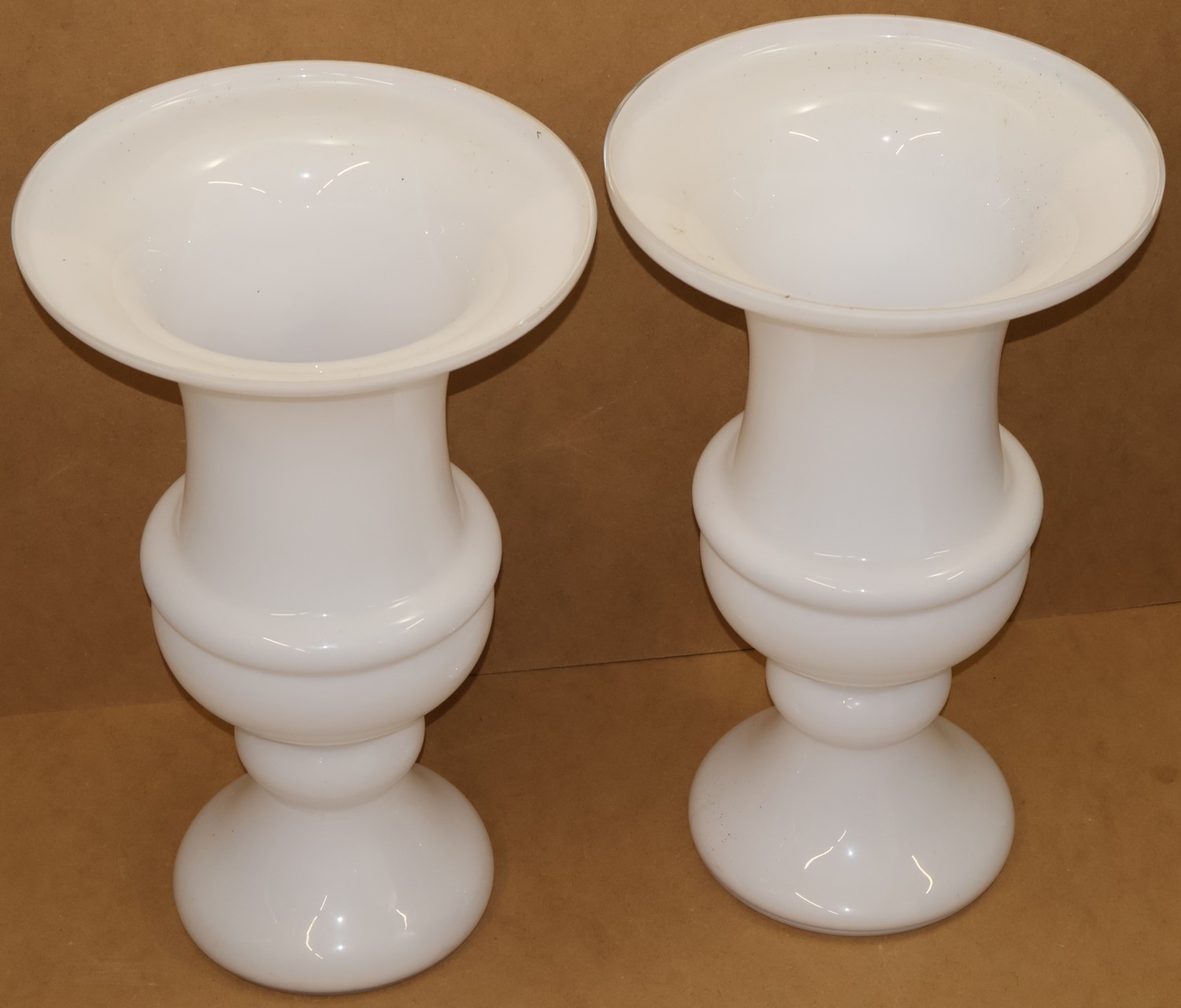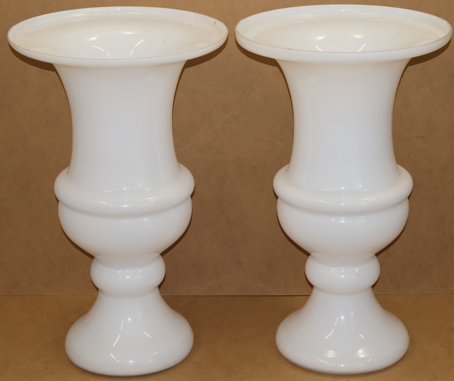A pair of tall Opaline glass round trumpet shaped vases, on round sweeping bases (minute chip to rim of one vase), 61cm high