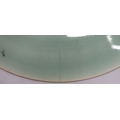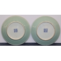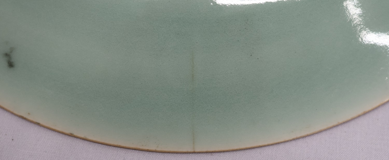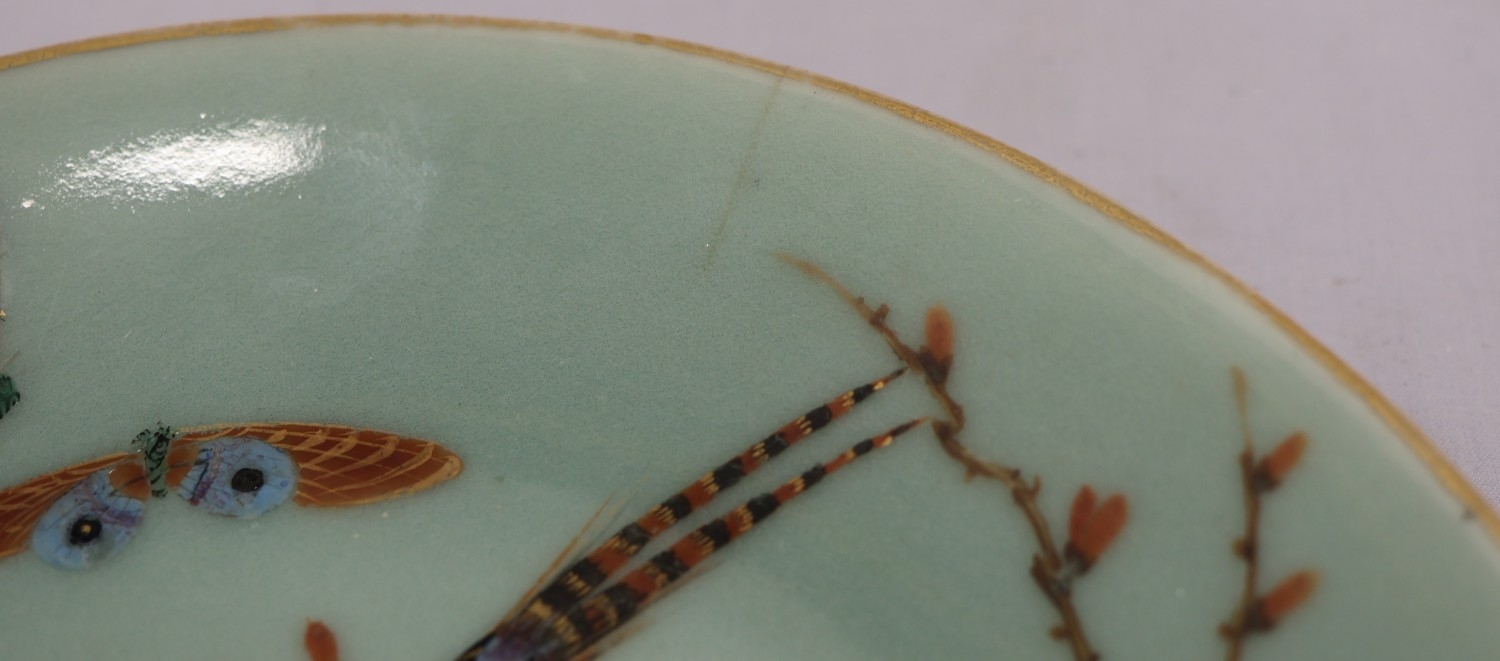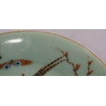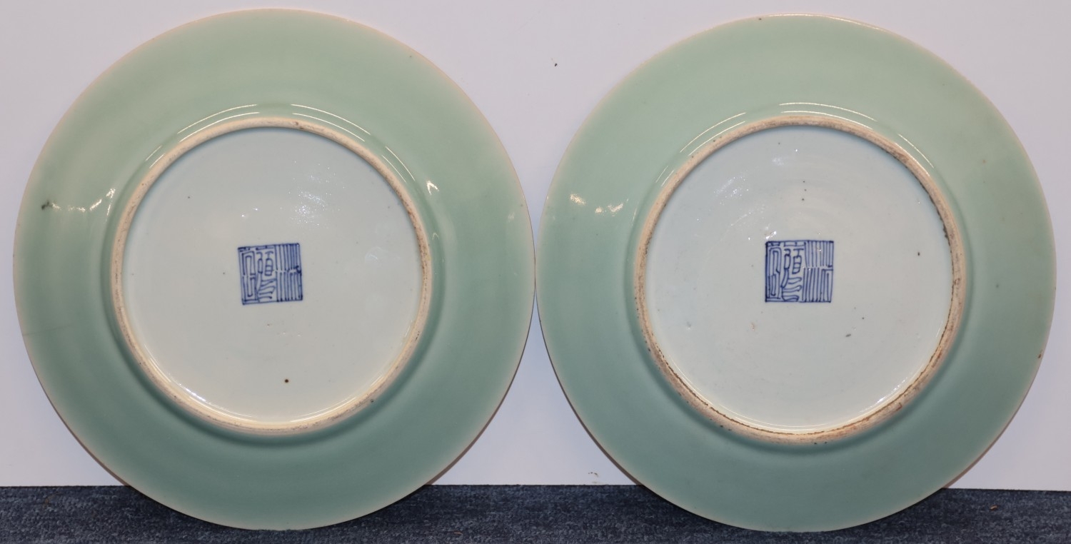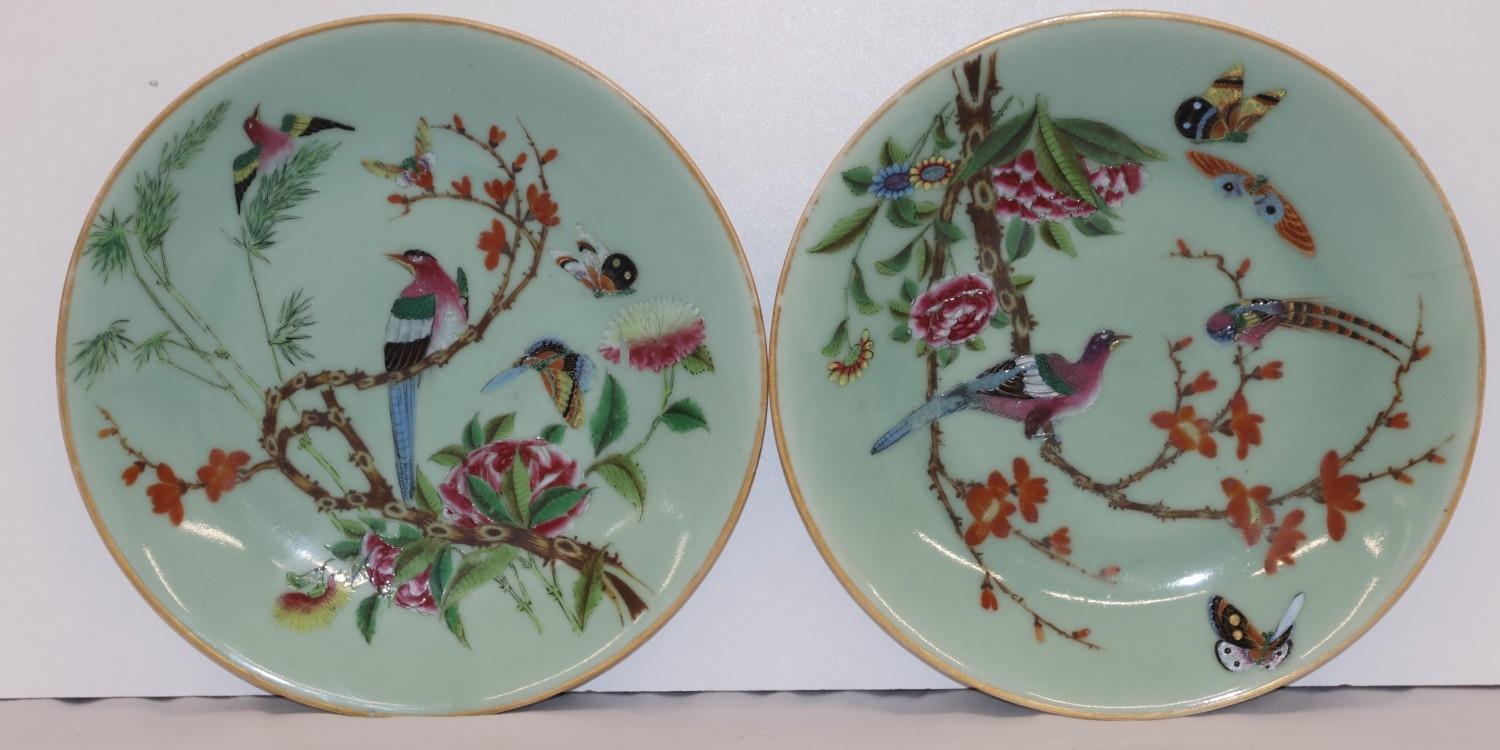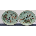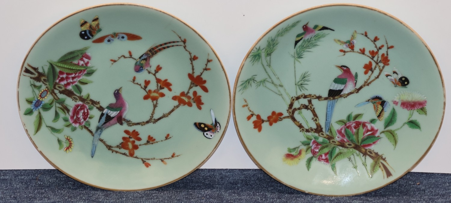 A pair of Chinese plates on green ground with multi-coloured bird, butterfly, floral and branch decoration, 26.5cm diameter (1 cracked)