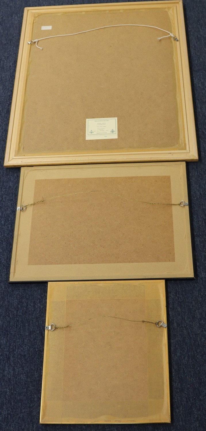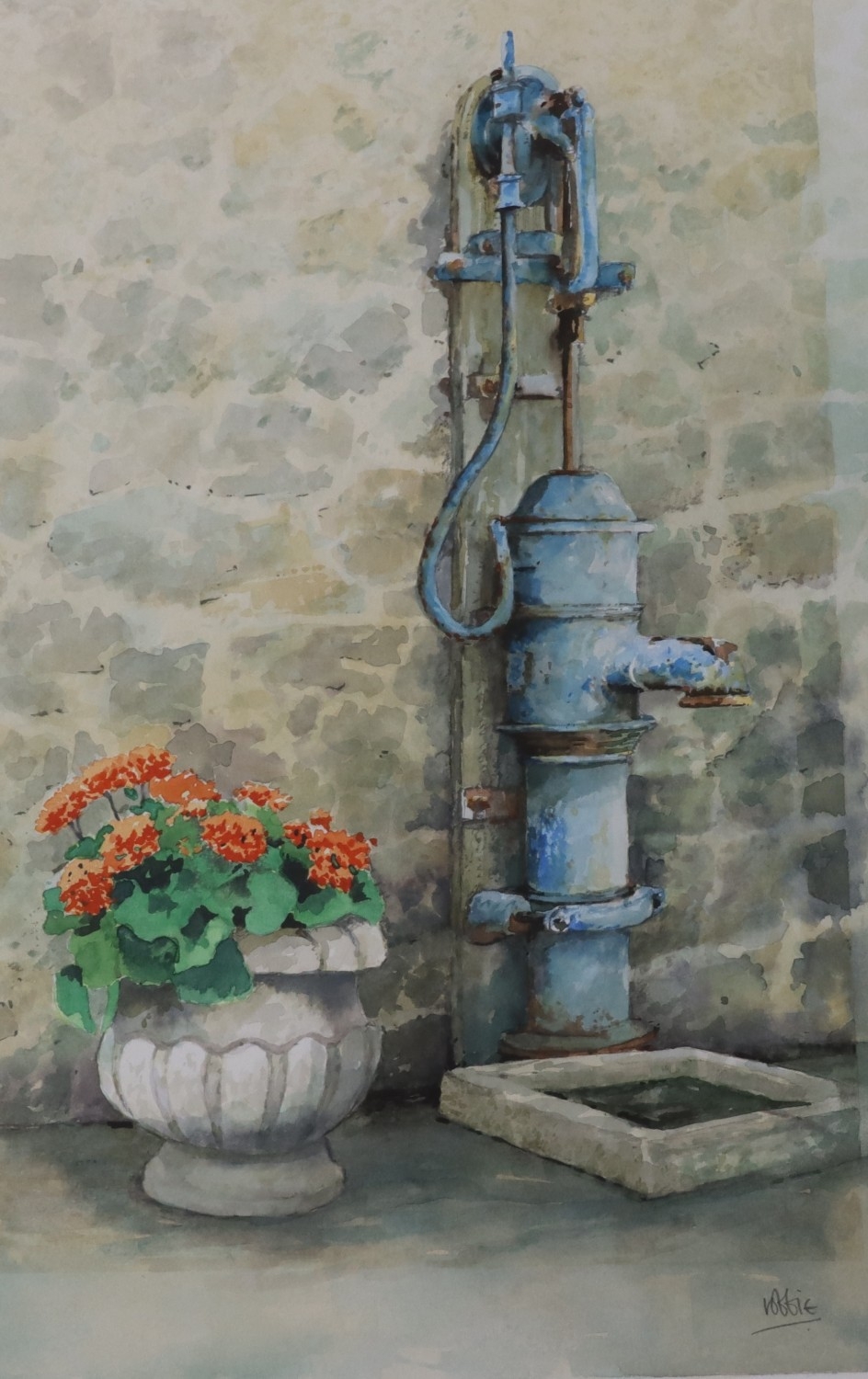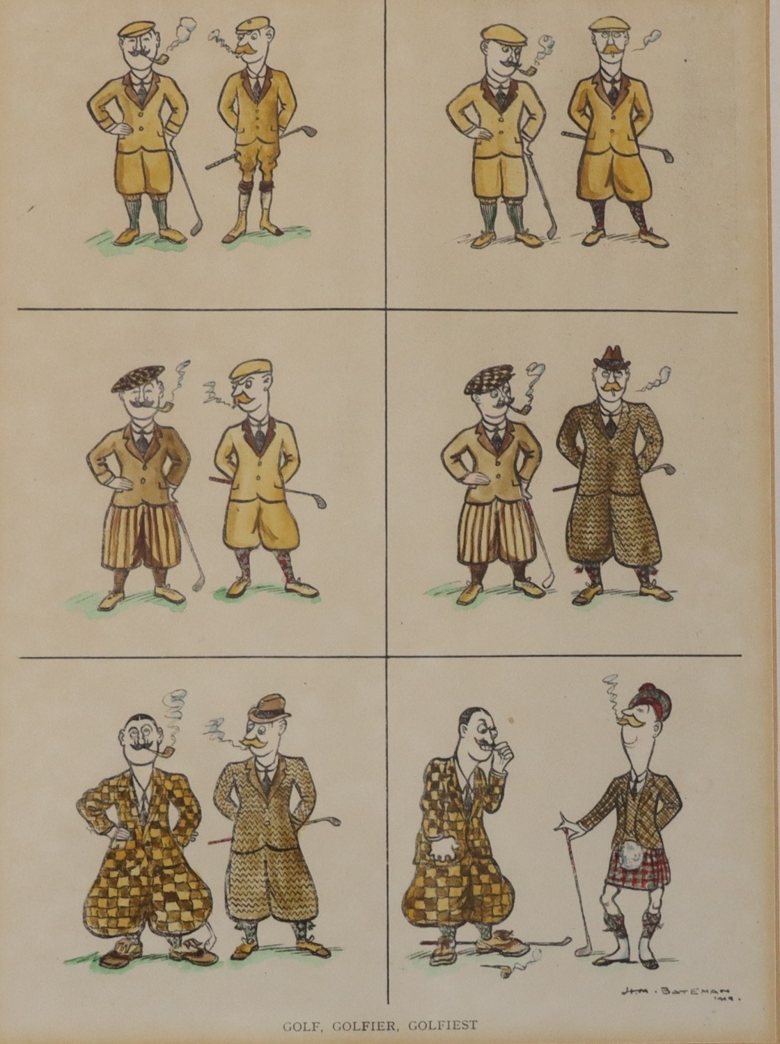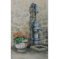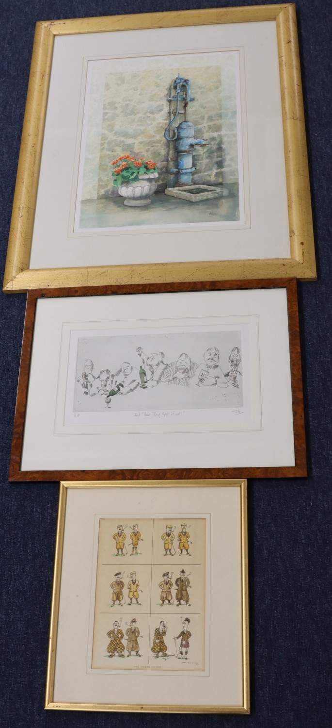 Graham Robbie watercolour "The Blue Pump", signed, 46.5 x 33.5cm, framed, a golfing print "Golf, Golfer, Golfiest, 24 x 17.5cm, framed and a print "And Then They Spit it Out!"14.5 x 13cm, framed.